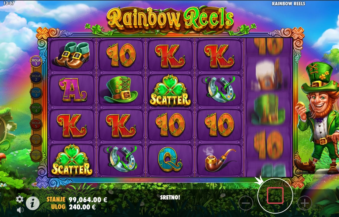 Gameplay slota Rainbow Reels izuzetno je zabavan i interesantan. Odvija se na 5x4 ploči, a sadrži 40 isplatnih linija što se računaju s lijeva na desno. Wild duge mijenja sve simbole osim Scattera, dok simbol djeteline s četiri lista obnaša funkciju Scattera te pojavom na 1., 3. i 5. kolutu vodi igrača u svijet besplatnih vrtnji. Na zadnjem sloju svih položaja sigurno se javljaju Wild simboli koji nose brojač što označava koliko puta mogu biti dio dobitnih kombinacija.