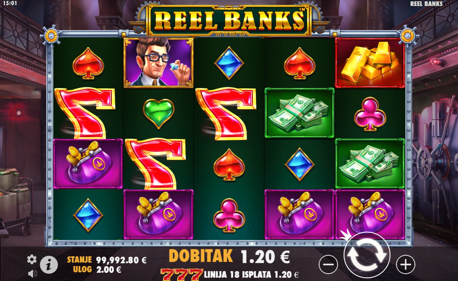 Gameplay u igri Reel Banks™ je intuitivan i dinamičan, pružajući igračima pet koluta i više dobitnih linija za osvajanje nagrada. Wild simboli zamjenjuju sve ostale simbole osim simbola novca i naplate, čime se povećavaju šanse za dobitak. Simboli novca pojavljuju se na prvih četiri koluta i donose nasumične vrijednosti koje se mogu kretati od 1x do 500x ukupnog uloga. Ako se simbol naplata pojavi na petom kolutu zajedno s jednim ili više simbola novca, igrač osvaja zbroj svih vrijednosti simbola novca.