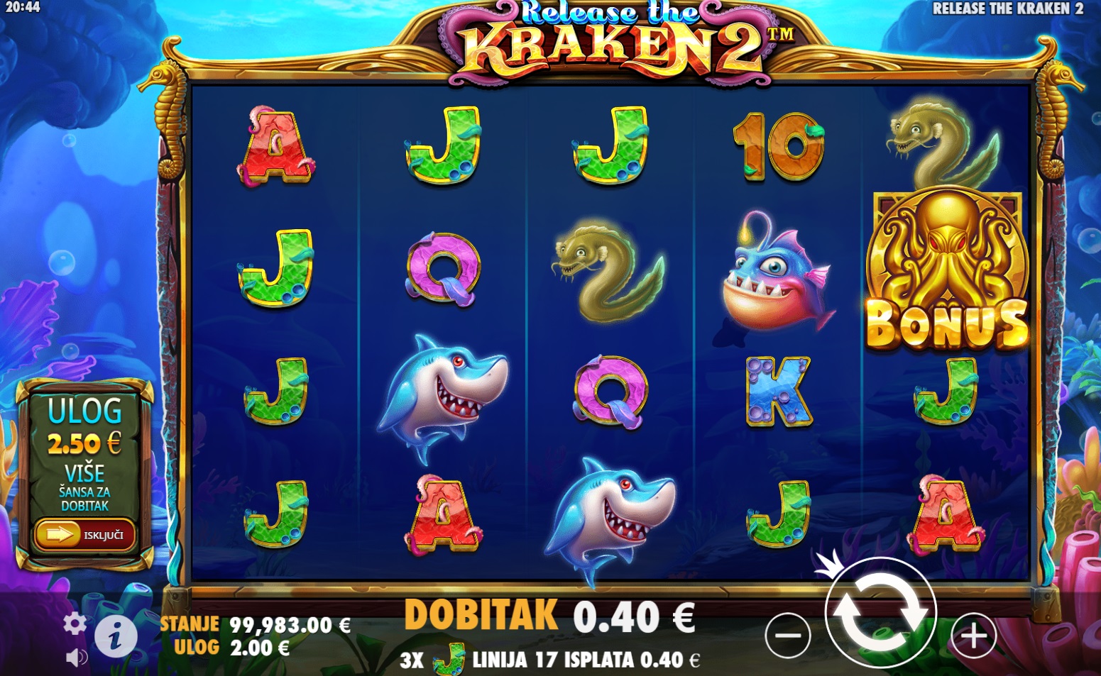 U igri Release the Kraken 2™ uživat ćeš u raznolikim bonusima i šarenim simbolima. Ova igra nudi uzbudljive mogućnosti za dobitak uz fantastične besplatne vrtnje i velike jackpote. Svaka vrtnja može donijeti nepredvidljive nagrade, a posebni simboli poput Wild i Bonus dodatno podižu uzbuđenje. S pet bubnjeva i brojnim dobitnim kombinacijama, Release the Kraken 2™ je savršena igra za one koji traže avanturu u dubinama oceana!
