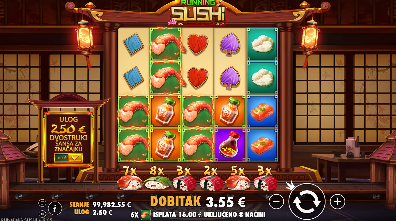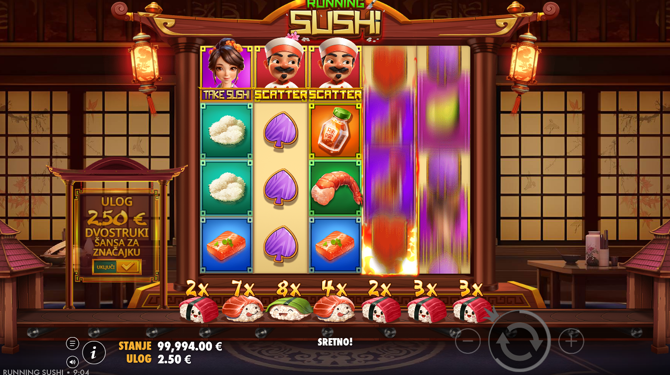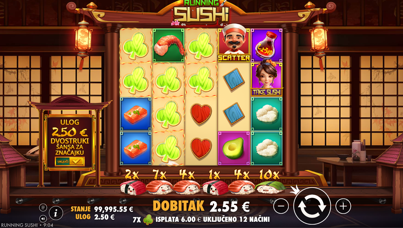 Running Sushi vodi te u brzi, veseli i humoristični svijet sushi barova, gdje rolice, losos i tempura doslovno trče po valjcima. Igra je prepuna simpatičnih animacija, energičnih zvukova i živih boja koje stvaraju pravi food festival u slot obliku. PragmaticPlay ovdje donosi svoje prepoznatljive glatke efekte i odličan tempo igre, uz temu koja je zabavna od prvog spina. Svaki sushi simbol ima svoj šarm, a bonus efekti dodatno začine cijelo iskustvo. Ako voliš brze i simpatične slotove, Running Sushi je savršen izbor.