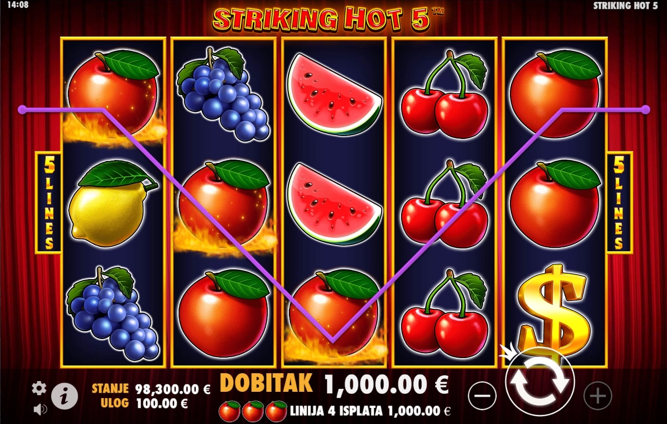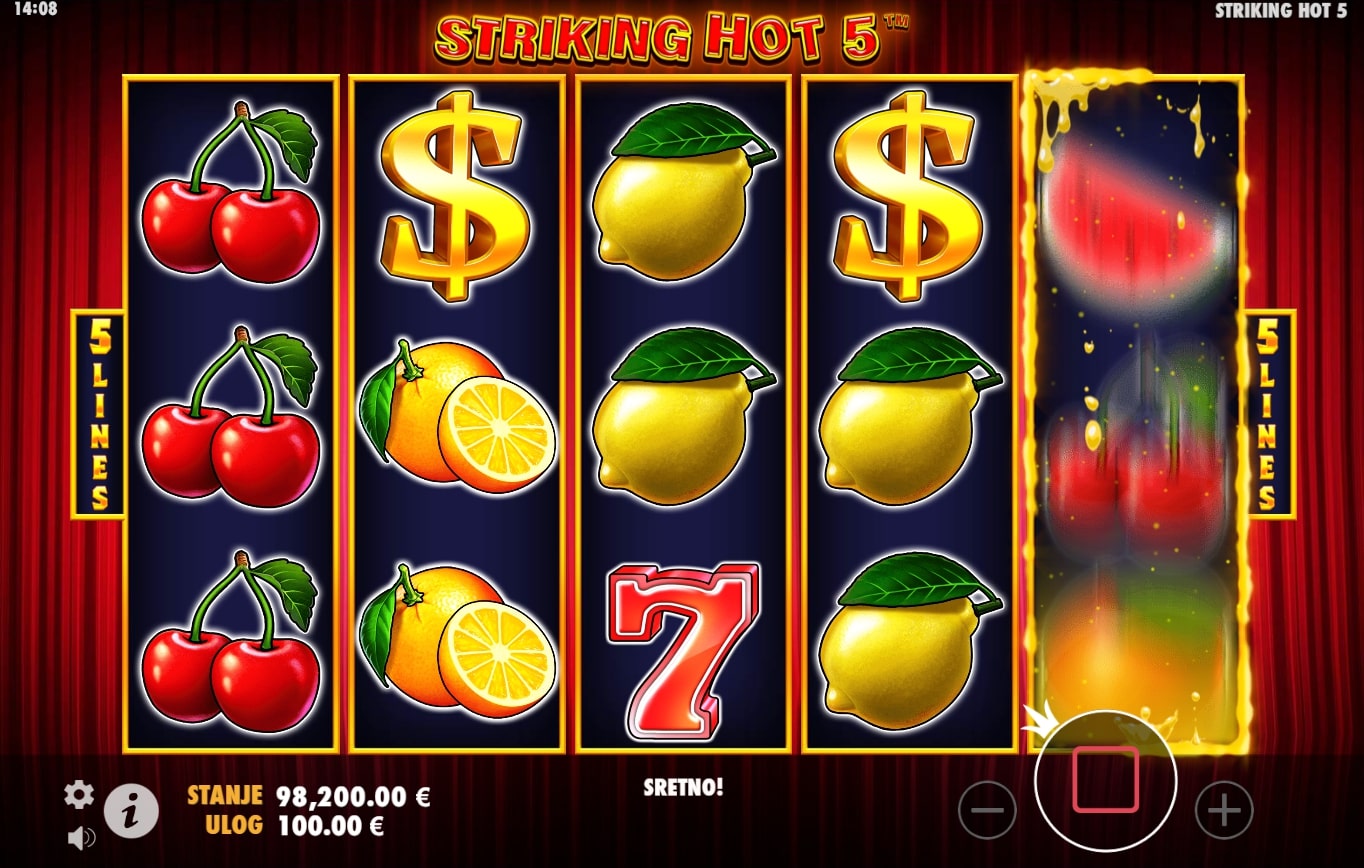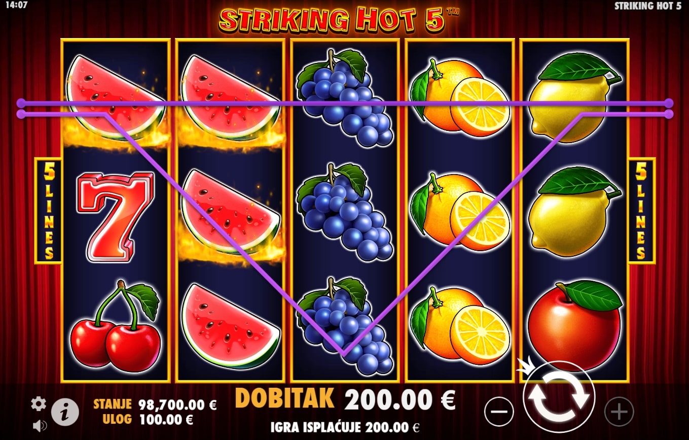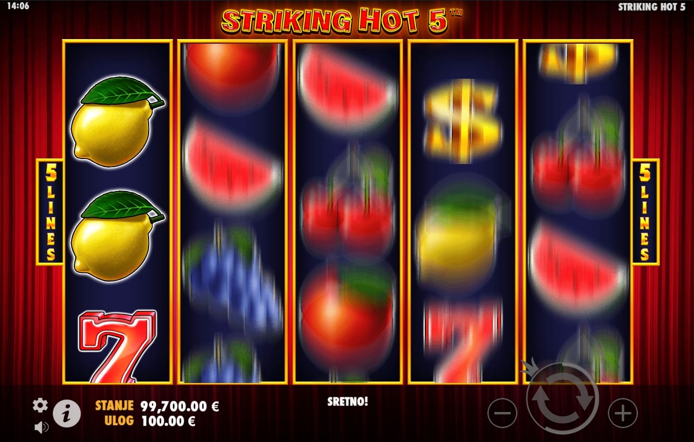 Striking Hot 5 slot je igra klasičnog karaktera koja vodi igrača u svijet voća i vrućih dobitaka. Najviše isplaćuju sedmice, jabuke i naranče, dok igra uz to sadrži poseban simbol američkog dolara koji isplaćuje bez obzira na svoju poziciju na kolutu. Zaigraj Striking Hot 5 te osvoji vatrene nagrade!