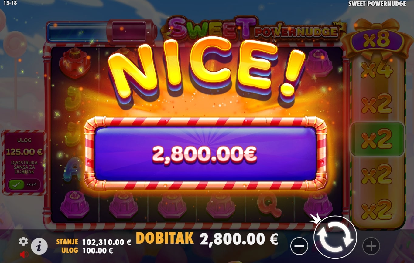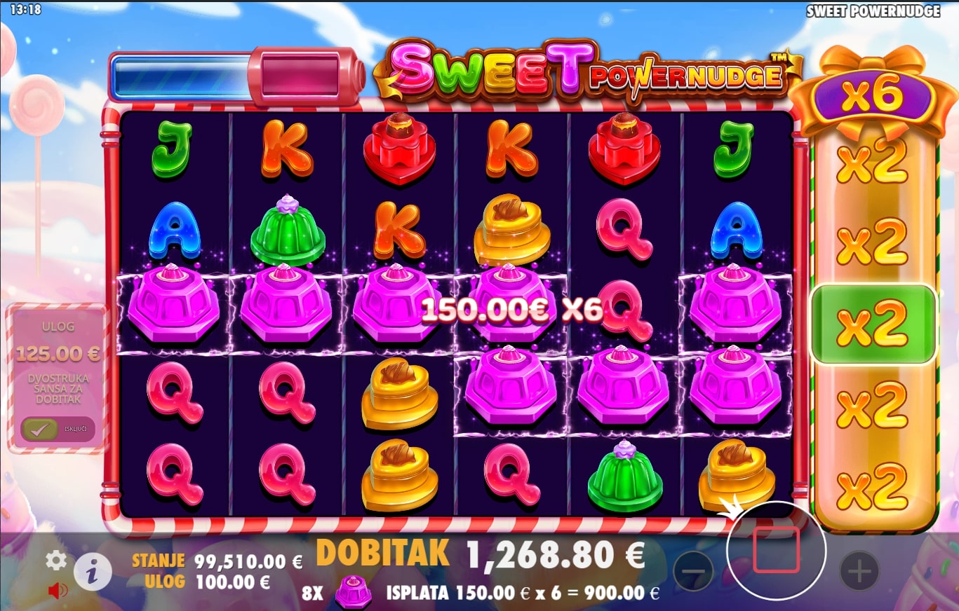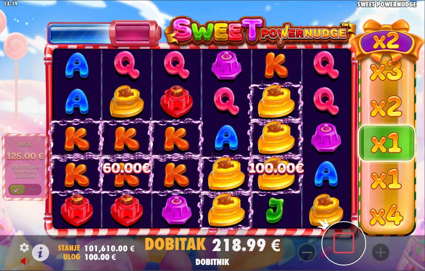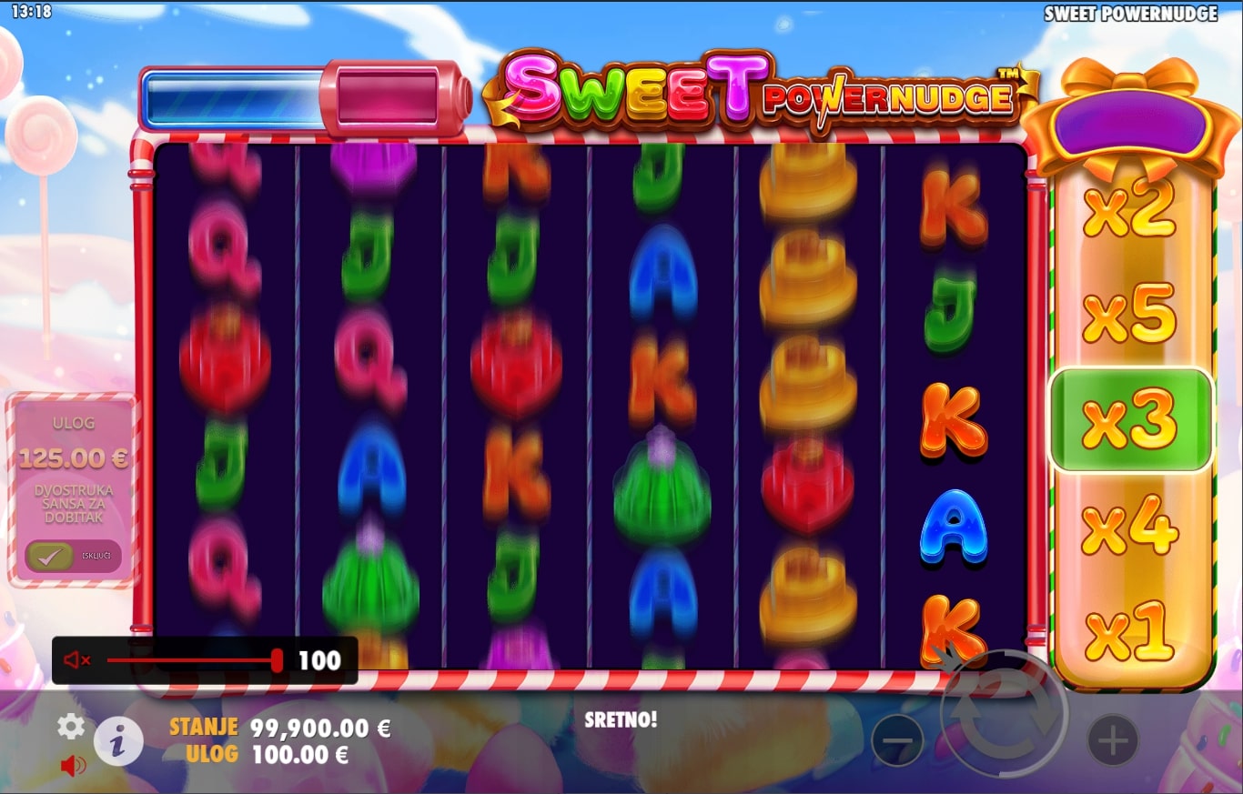 Sweet Powernudge slot je igra savršena za one slatkog zuba koji su u potrazi za najboljim dobicima. Simboli su inspirirani raznim slatkišima, a onaj lizalice poseban je jer vodi igrača u svijet besplatnih vrtnji. Igra također sadrži značajku Powernudge, odnosno kod svake dobitne kombinacije dobitak se isplaćuje, a role se pomiću za jedno mjesto prema dolje kako bi se otkrili novi simboli s vrha u cilju stvaranja novih vrhunskih nagrada. Zaigraj Sweet Powernudge te osvoji slasne nagrade!