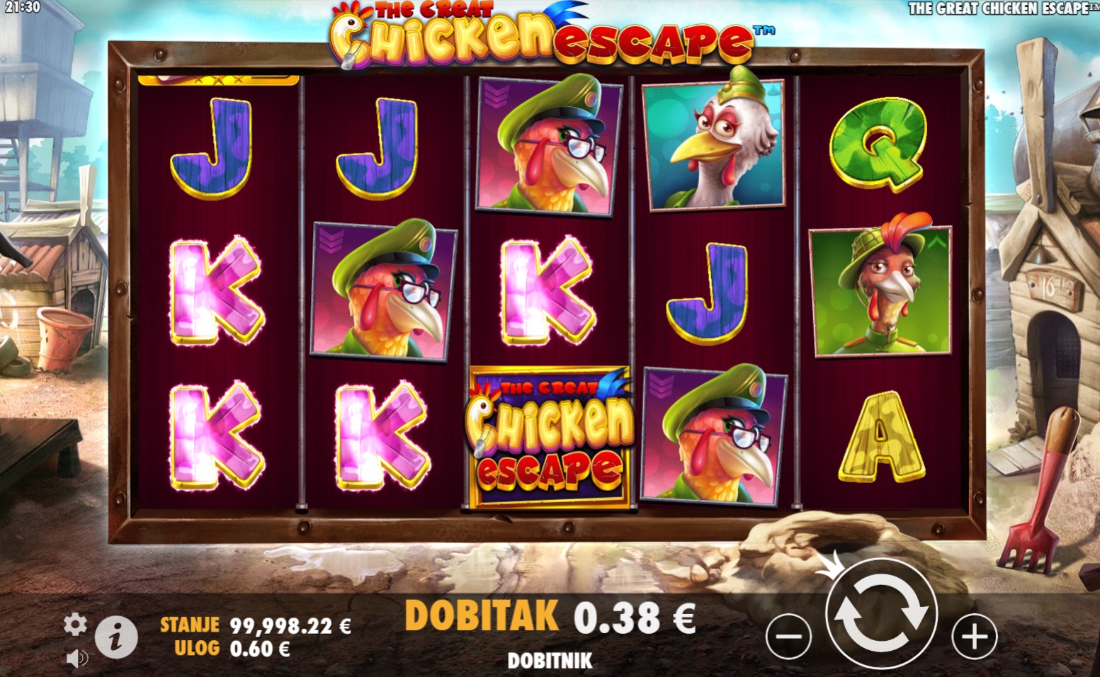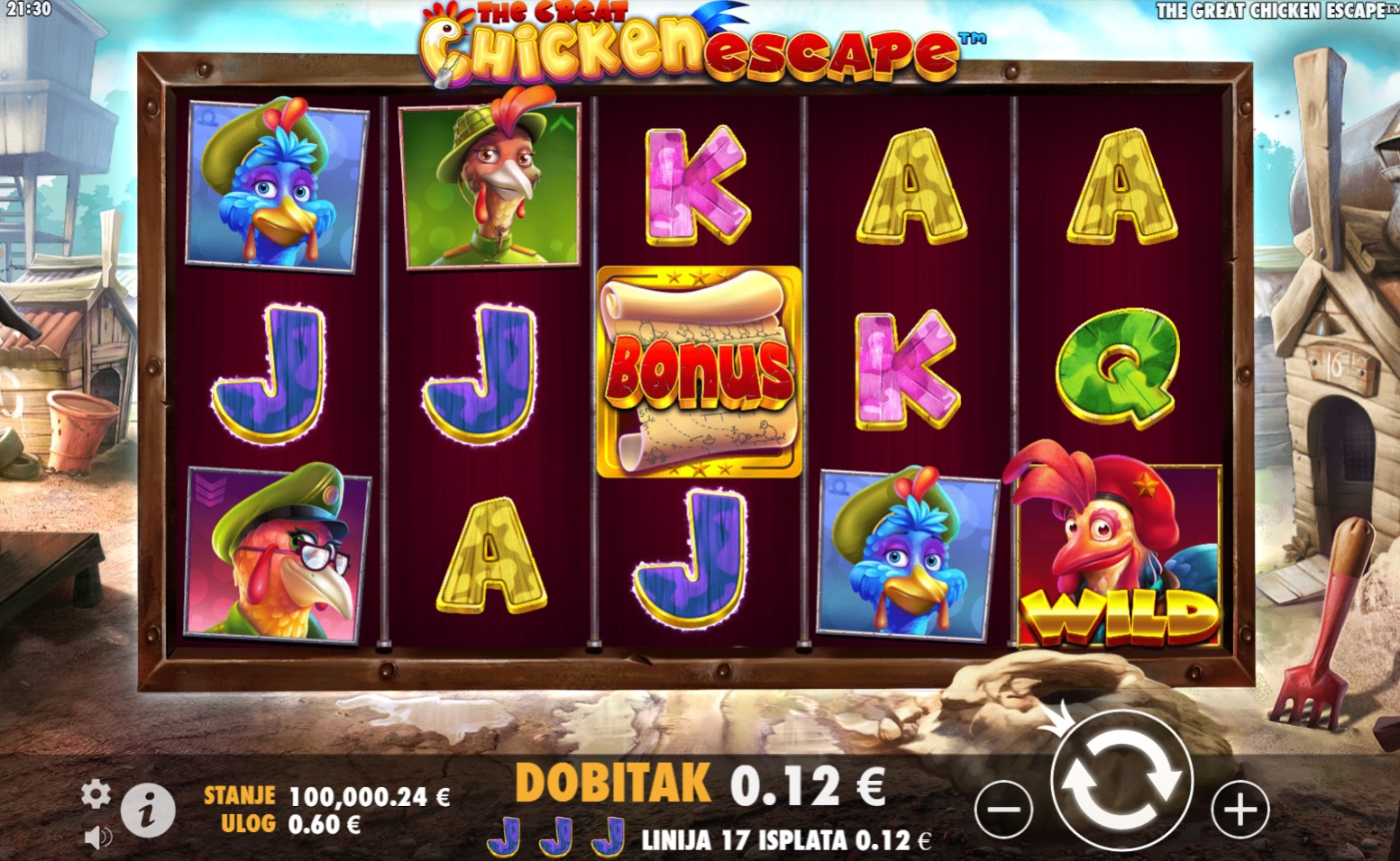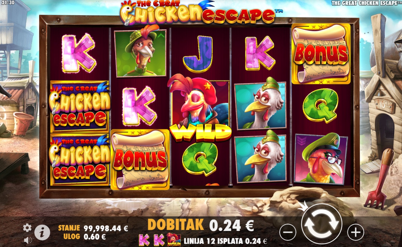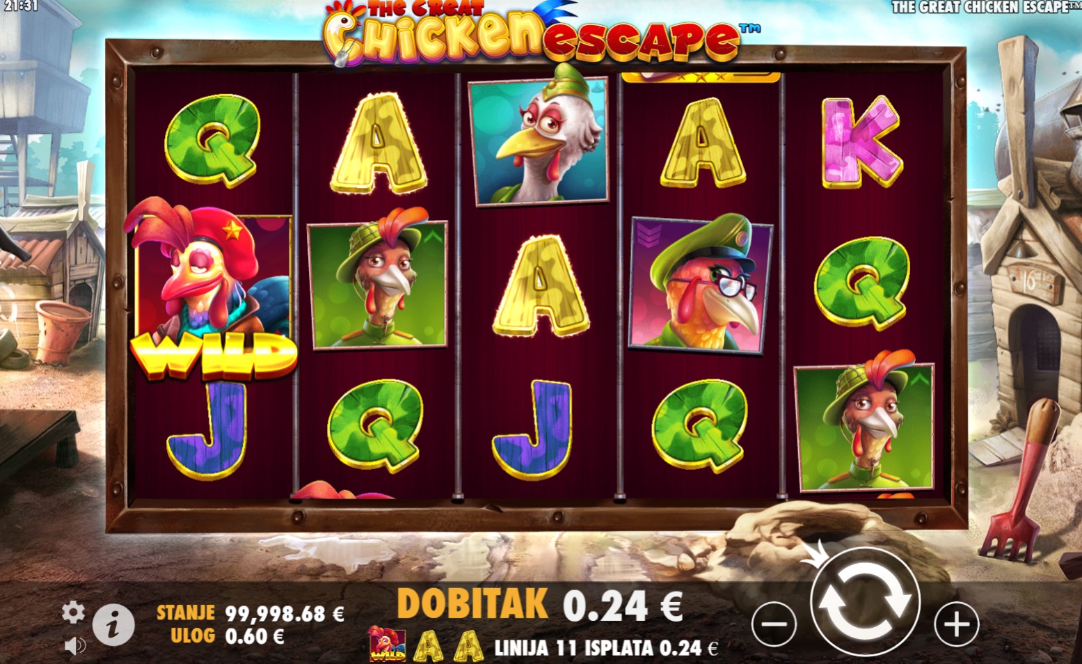 The Great Chicken Escape je slot igra puna akcije i zabave, gdje hrabri pilići pokušavaju pobjeći iz farme. U ovoj igri susrest ćeš se s različitim simbolima koji donose uzbudljive dobitke, a simbol Wild može zamijeniti bilo koji drugi simbol, što ti daje veće šanse za dobitak. Bonus simboli donose posebne nagrade – ako dobiješ 3 ili više, pokrećeš bonus igre koje mogu donijeti bogate nagrade. Sa svakim okretajem koluta, očekuje te nova avantura i prilika za velike dobitke. Otkrij što sve igra The Great Chicken Escape skriva i uživaj u svakom trenutku!