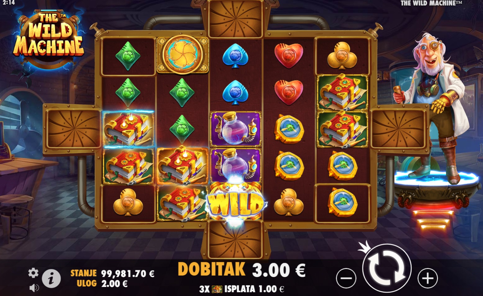 The Wild Machine je inovativna slot igra koja nudi bogato iskustvo igranja kroz jedinstvenu mrežu simbola i dinamične bonus značajke. S osnovnom mrežom veličine 5x5, ova igra donosi priliku za velike dobitke zahvaljujući nasumičnim promjenama u mrežu 1x3x5x7x5x3x1, gdje 1., 4. i 7. rola uvijek sadrže Wild simbole. Simbol Wild mijenja sve simbole osim Scatter-a, pružajući dodatne mogućnosti za dobitak. Ako se na 2., 3. i 4. roli pojave tri Scatter simbola, pokreće se uzbudljiva Značajka Čudesnog Kola, koja donosi mogućnost osvajanja novčanih nagrada ili besplatnih vrtnji. The Wild Machine je savršena igra za one koji traže balans između dinamične akcije i sjajnih dobitaka.