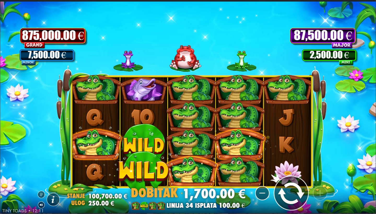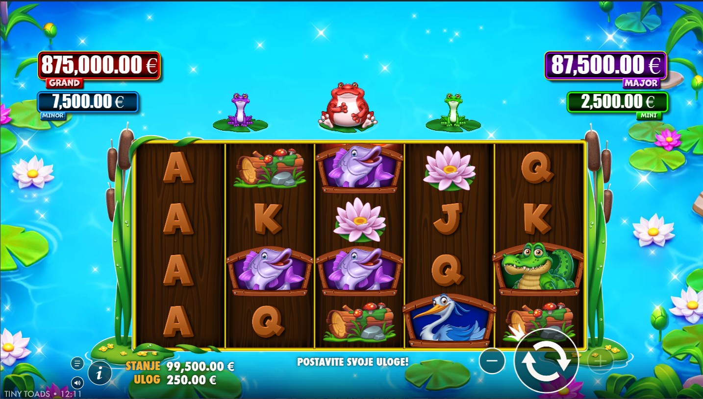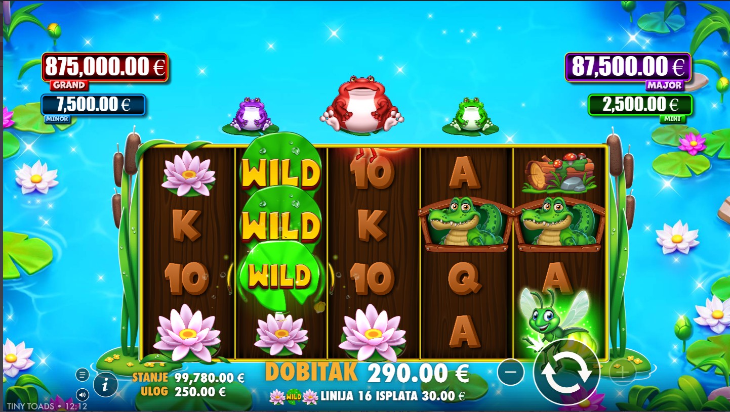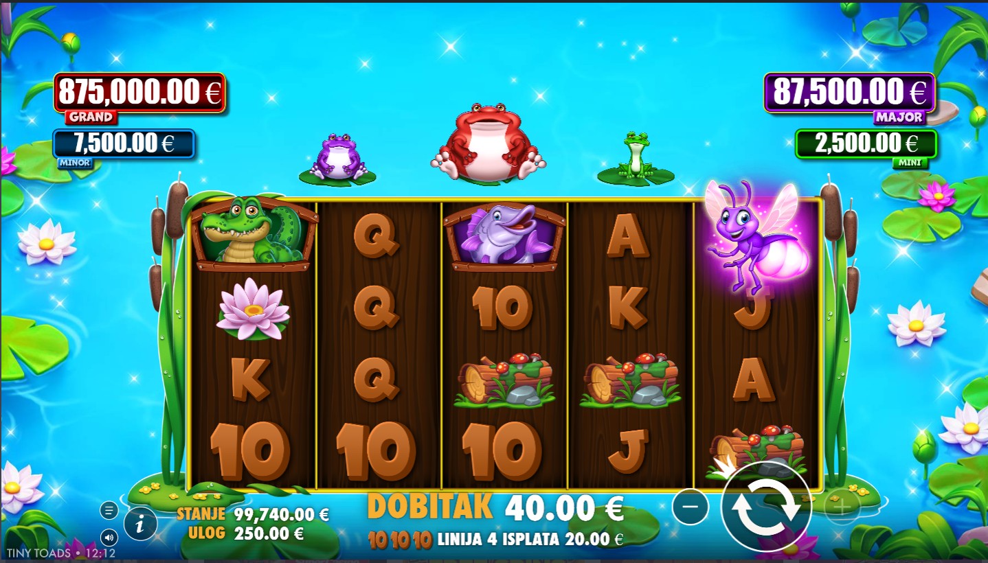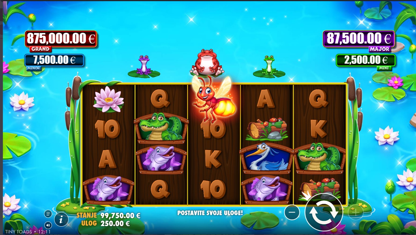 Tiny Toads vodi te u čarobnu močvaru punu simpatičnih žabica, svjetlucavih kukaca i čarobnih bonus značajki. Ovaj veseli slot providera PragmaticPlay donosi uzbudljivu atmosferu i zabavnu igru na 5 valjaka s 50 isplatnih linija, odnosno 100 fiksnih isplatnih linija sa zelenim modifikatorom. Simboli su inspirirani prirodom od raznobojnih žabica do svjetlećih dragulja, dok Wild simbol pomaže u stvaranju dobitnih kombinacija zamjenjujući druge simbole. Ključne značajke uključuju besplatne vrtnje modifikatore i krijesnice, povećavajući uzbuđenje i mogućnost povezivanja više dobitnih kombinacija. Tiny Toads donosi veselo i zabavno iskustvo puno neočekivanih obrata, idealno za sve koji vole ležernu, ali dinamičnu igru.