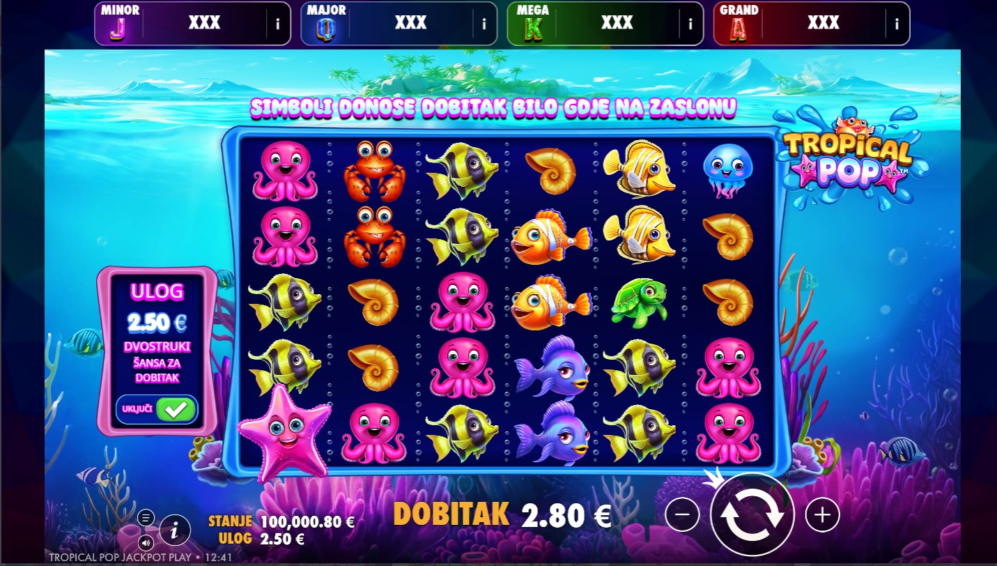 Tropical Pop Jackpot Play vodi te u sunčani tropski raj pun boja, osvježavajućih simbola i opuštene atmosfere! Ovaj živopisni slot providera PragmaticPlay donosi valove dobre zabave i uzbudljive značajke na 6 bubnjeva s 20 fiksnih isplatnih linija. Wild simbol pomaže u stvaranju dobitnih kombinacija zamjenjujući druge simbole osim posebnih. Posebnost igre je Jackpot značajka, gdje se slučajno može aktivirati i otvoriti priliku za osvajanje jednog od četiri progresivna jackpota:Minor, Major, Mega ili Grand. Tu su i besplatne vrtnje, koje se pokreću pojavom četiri ili više Scatter simbola. Tijekom besplatnih vrtnji aktiviraju se dodatni množitelji koji povećavaju uzbuđenje svake vrtnje. Sa veselim simbolima i zabavnim značajkama Tropical Pop Jackpot Play donosi savršenu dozu ljetne energije u svaki spin.