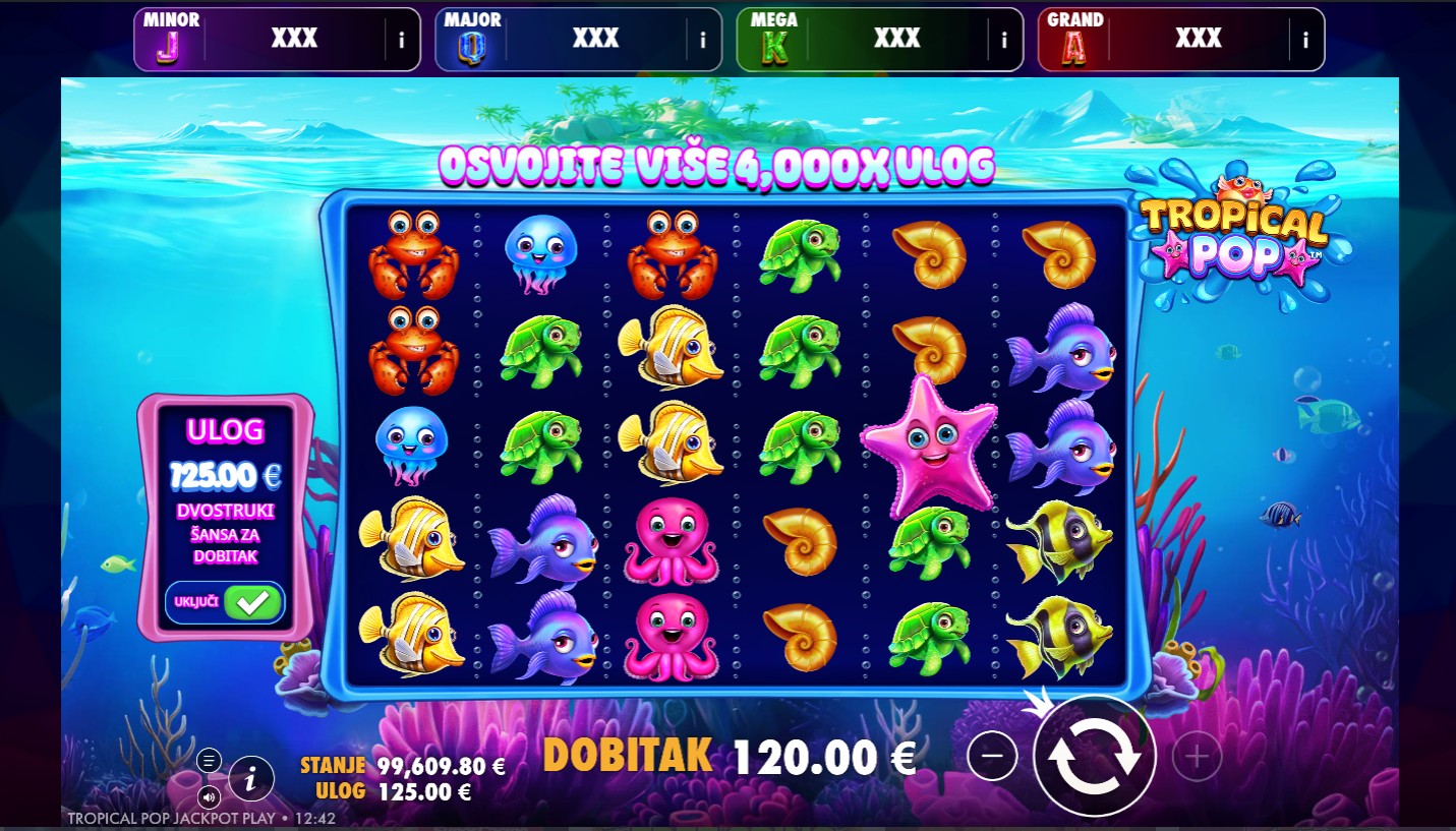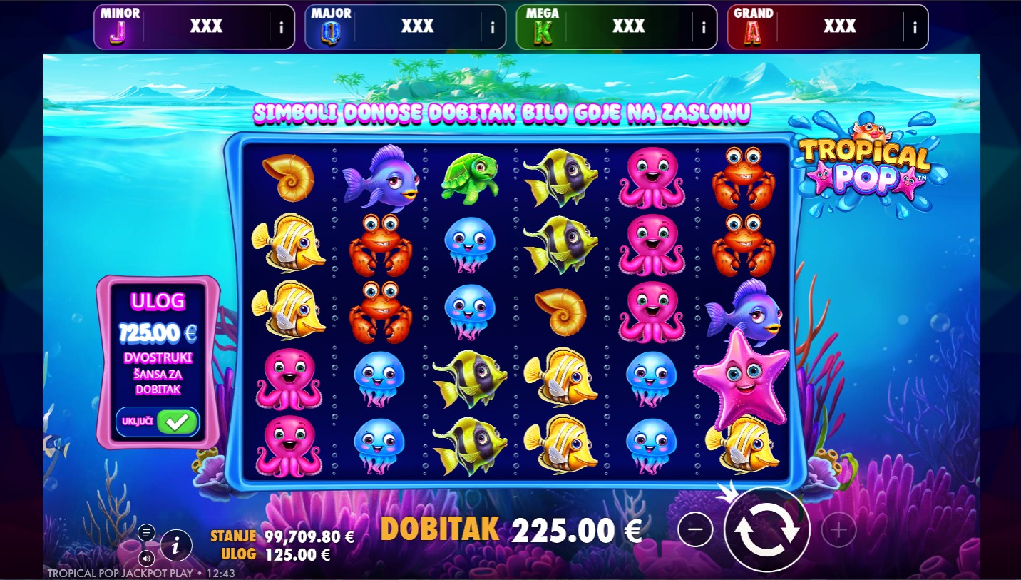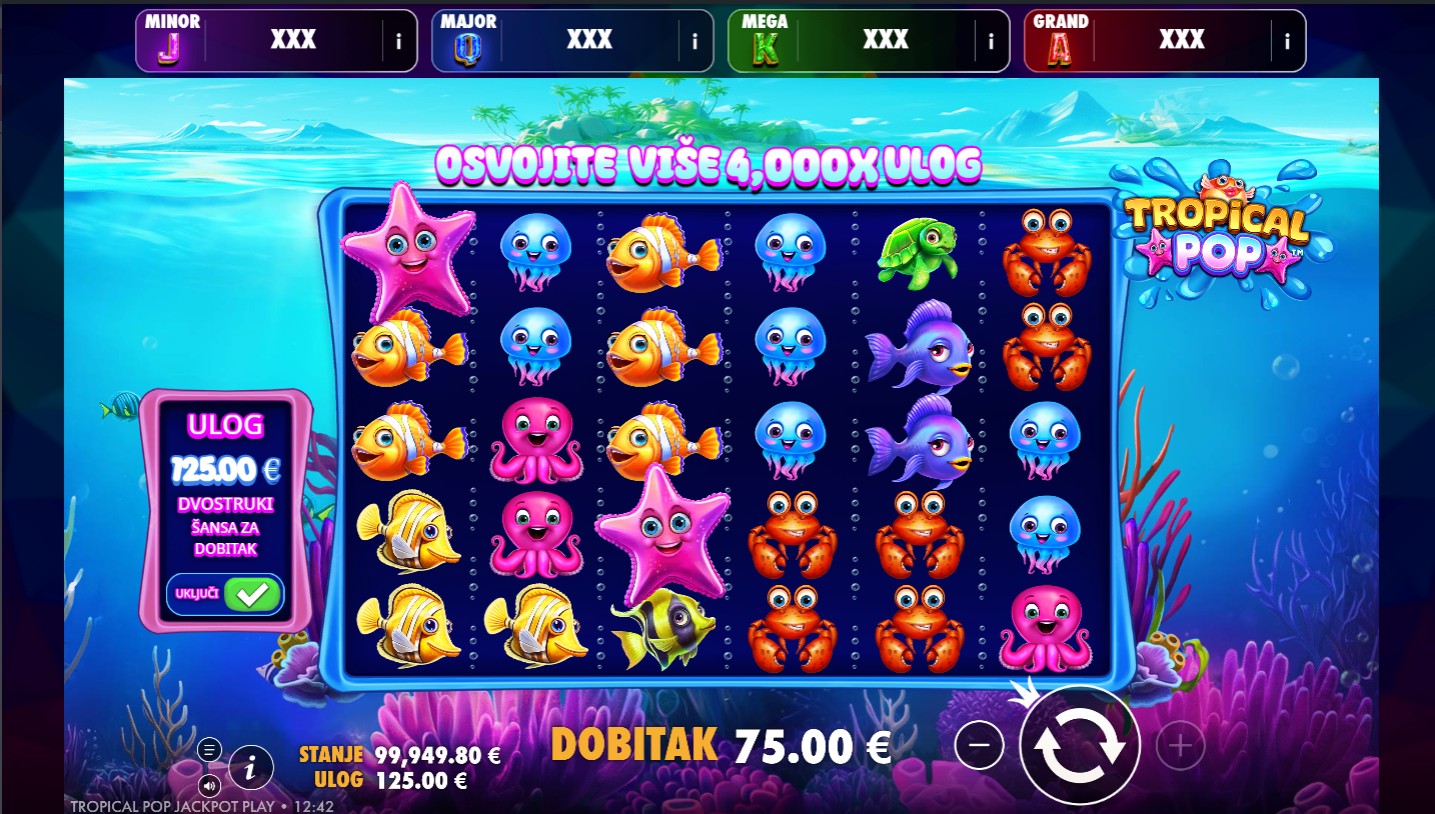 Tropical Pop Jackpot Play ima RTP od 95,5%, što znači da pruža vrlo solidne šanse za dobitak tijekom igre. Volatilnost je visoka, što povećava uzbuđenje jer igra može donijeti značajne dobitke, osobito tijekom bonus značajki. Idealna je za igrače koji vole dinamičnu, akcijom bogatu igru s potencijalom za veće nagrade.