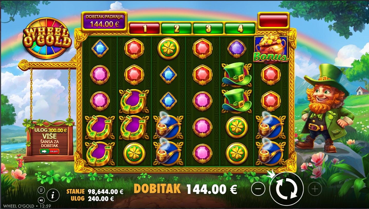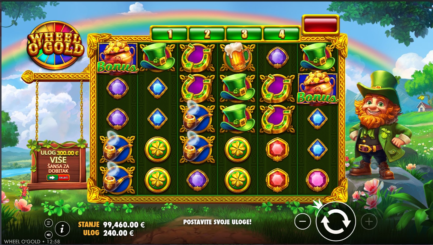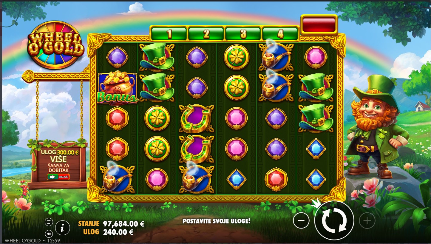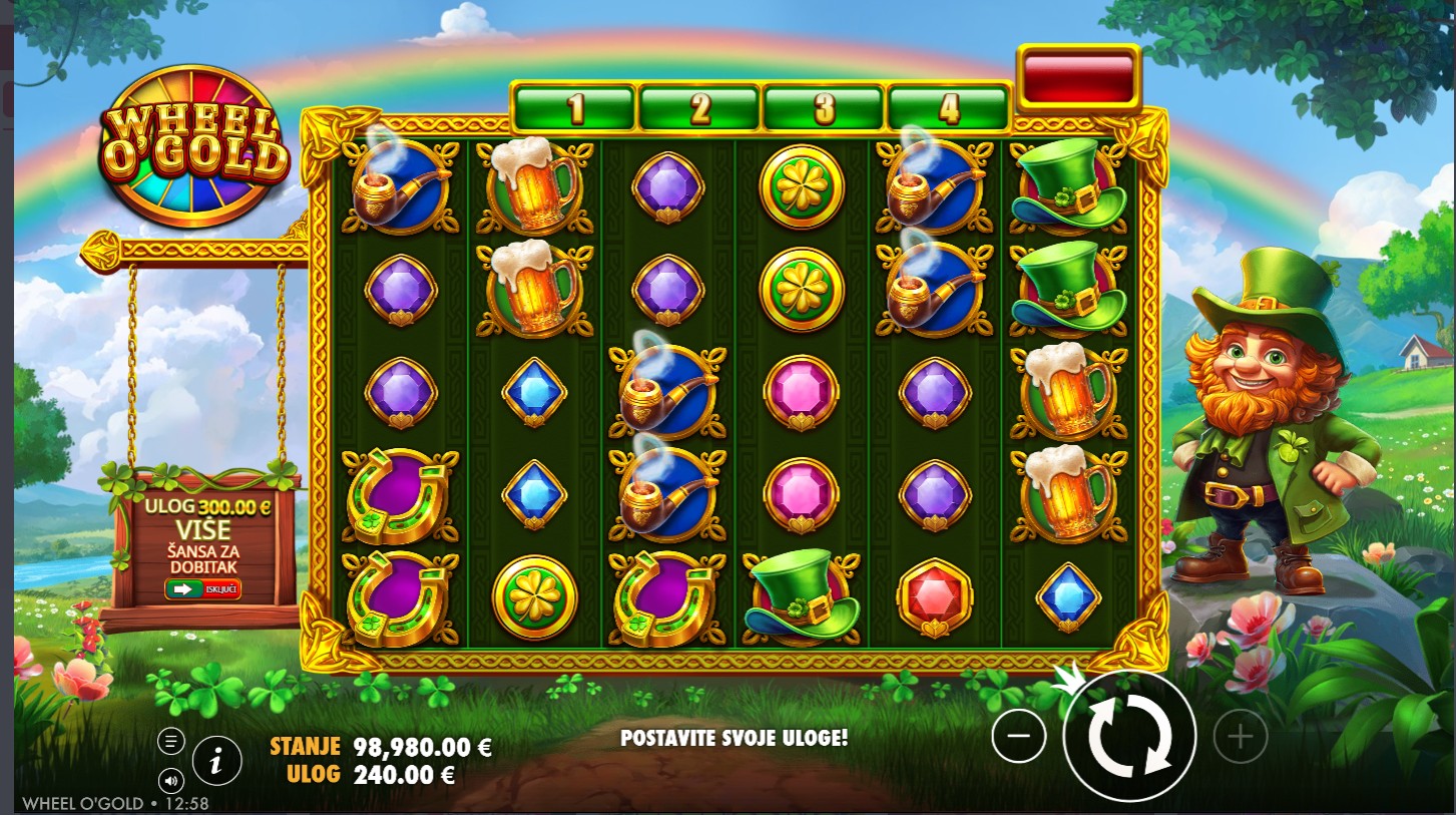 Wheel O’ Gold vodi te u svijet irske sreće, zlatnih kotlova i djetelina koje donose dobru zabavu! Ovaj veseli slot providera PragmaticPlay donosi prepoznatljivu irsku temu u kombinaciji s bogatim bojama, veselom glazbom i dinamičnim značajkama igre. Igra se odvija na 6 bubnjeva s 20 fiksnih isplatnih linija, a svaka vrtnja pruža priliku za aktivaciju čarobnog kotača sreće. Simboli uključuju djeteline, šešire, zlatnike i pivske vrčeve, dok Wild simbol zamjenjuje sve ostale simbole osim Scattera. Ključ igre je značajka koja se aktivira kada se na bubnjevima pojave četiri Scatter simbola i donosi mogućnost osvajanja množitelja i besplatnih vrtnji.