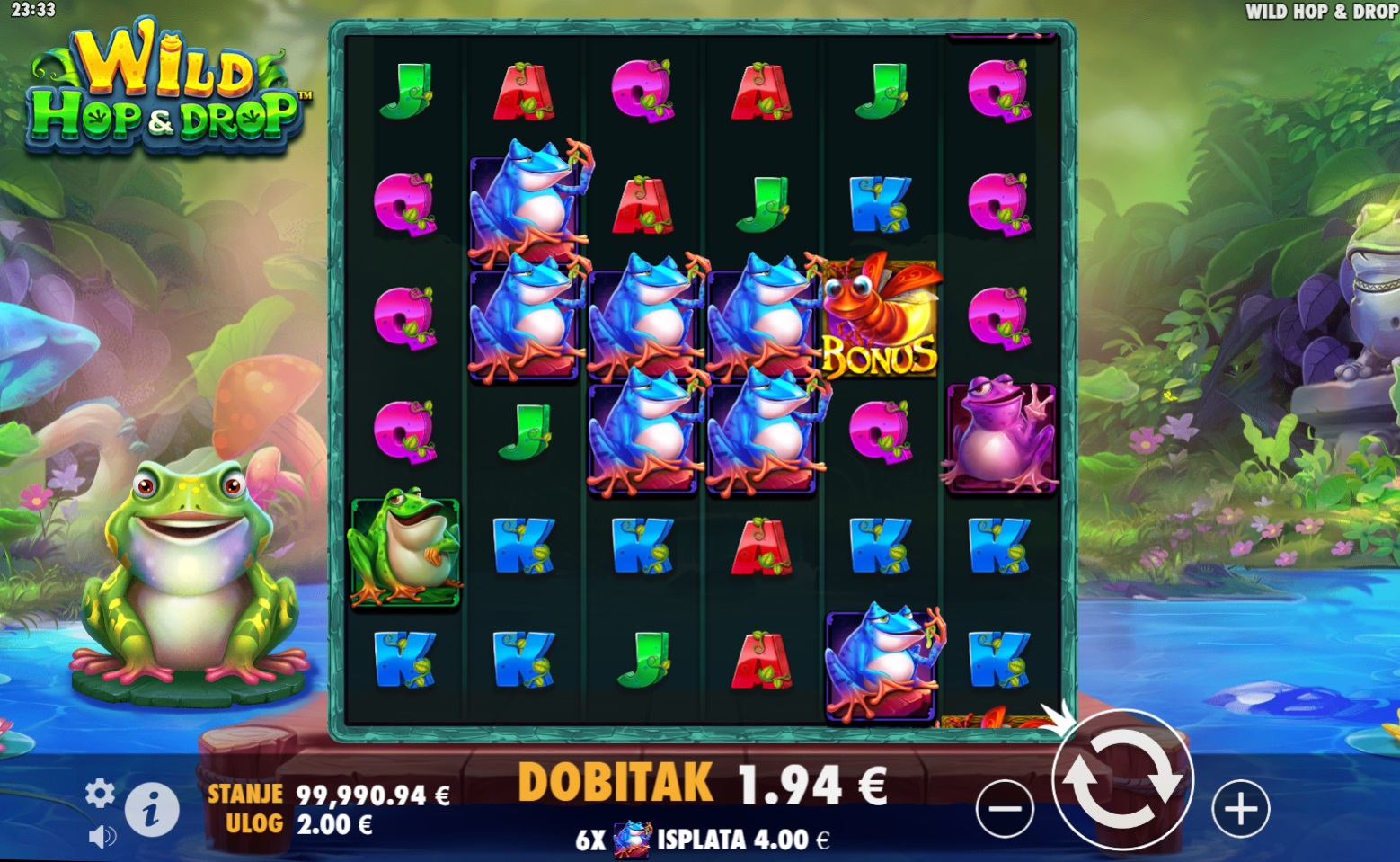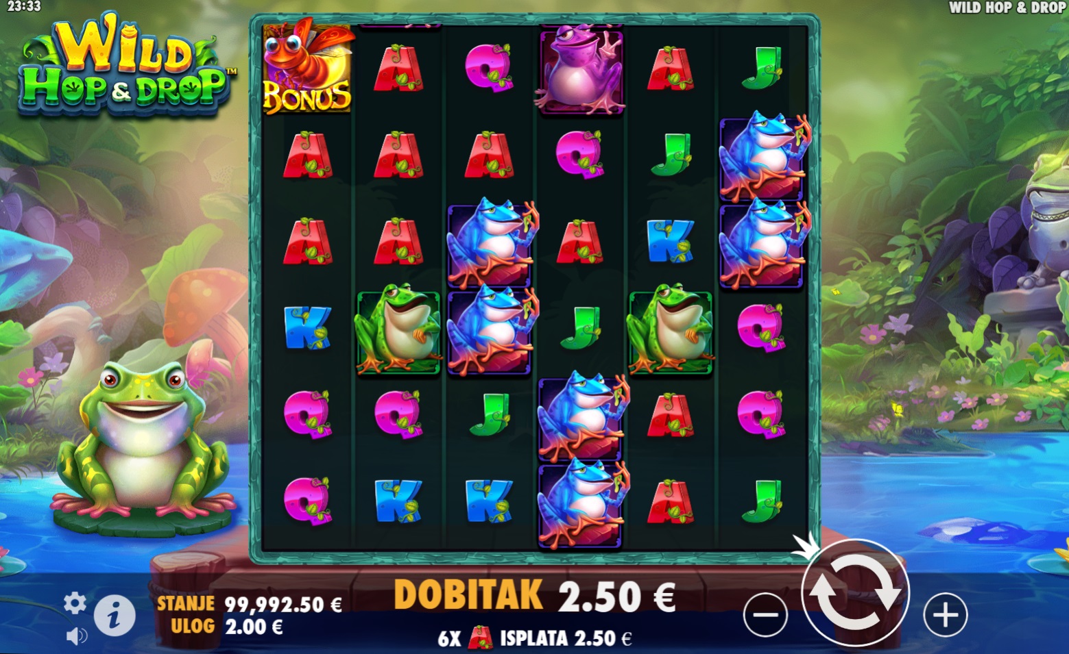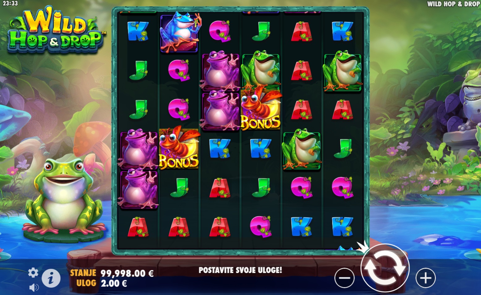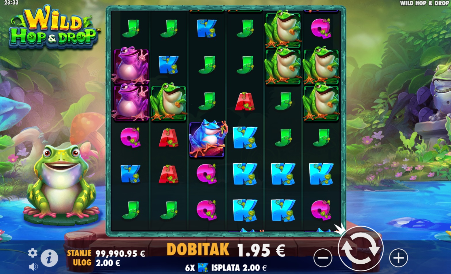 Wild Hop&Drop je slot igra koja se odvija na velikoj mreži 6x6, gdje spajanjem najmanje šest simbola ostvaruješ dobitak. Uz šarene simbole i zabavne animacije, igra ti nudi priliku da osvojiš velike nagrade. Wild simboli, koji zamjenjuju sve osim Bonus simbola, mogu se pojaviti u različitim veličinama, čak do 6x6, donoseći još veće šanse za dobitak. Uz mogućnost pokretanja besplatnih vrtnji, Wild Hop&Drop je prava poslastica za ljubitelje slotova.