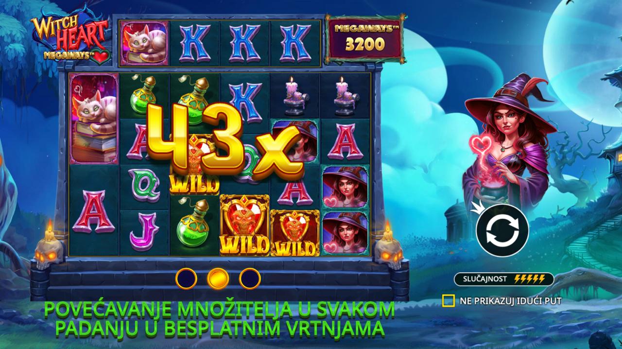 Witch Heart Megaways igra se na više rola s promjenjivim brojem simbola gdje je cilj složiti iste simbole na aktivnim načinima za dobitak kako bi ostvario dobitak. Igra koristi kaskadni mehanizam – dobitne kombinacije nestaju i zamjenjuju se novim simbolima, omogućujući lančane dobitke unutar jednog spina. Wild simboli mogu eksplodirati i dodati dodatne simbole na polje, dok Scatter simboli aktiviraju besplatne vrtnje s rastućim multiplikatorima. Postavi željeni ulog i zavrti role kako bi osvojio čarobne nagrade!