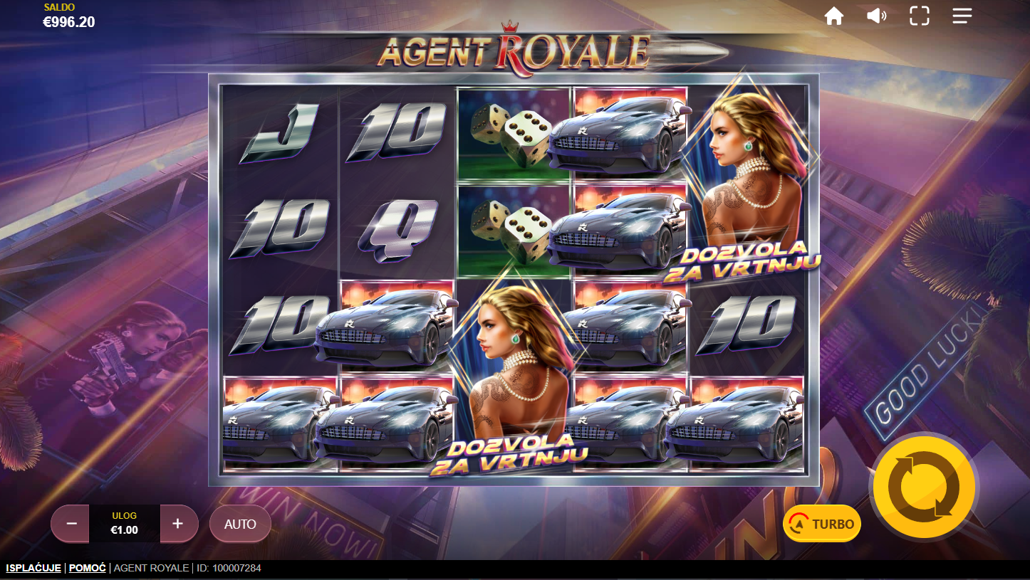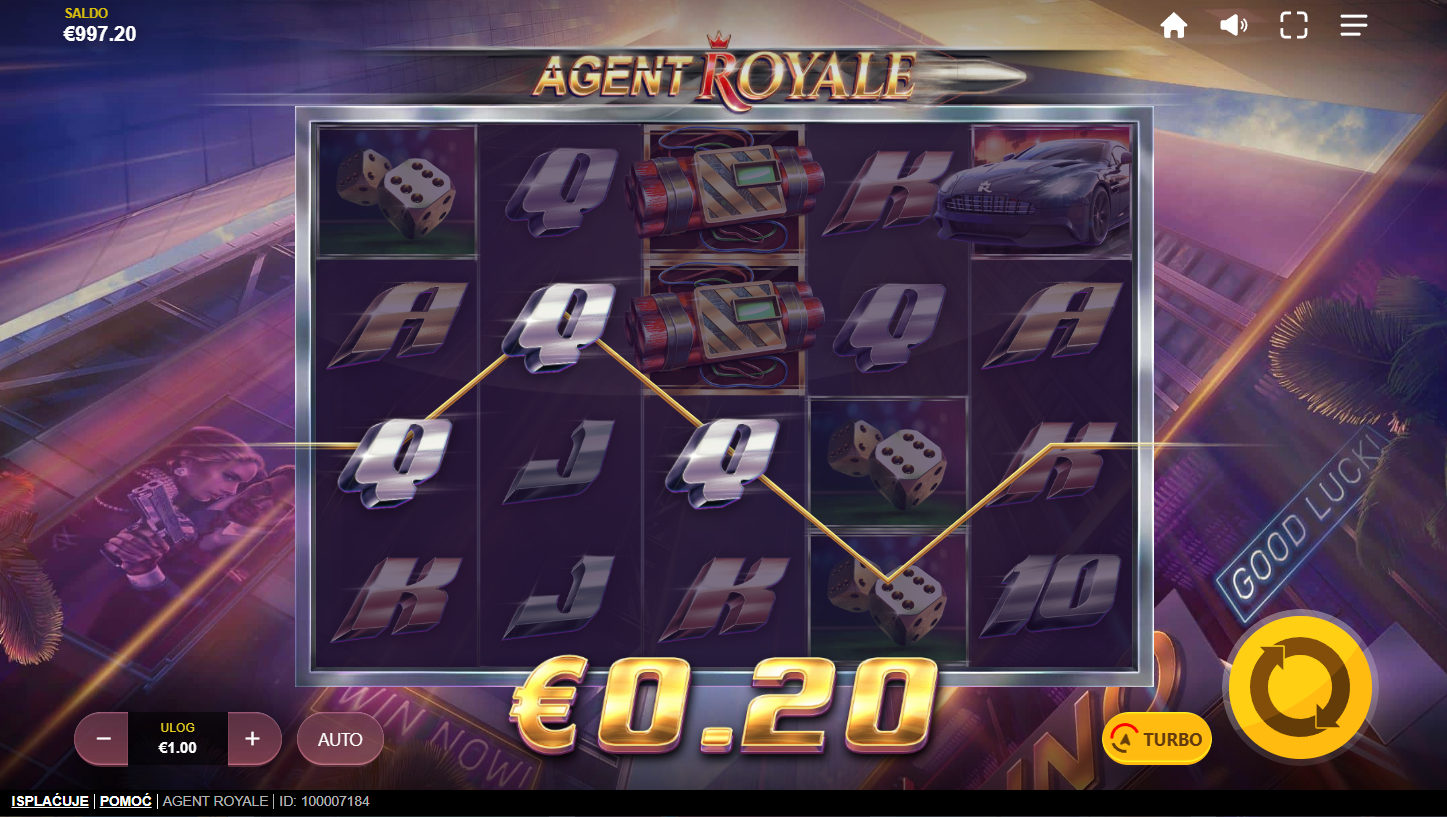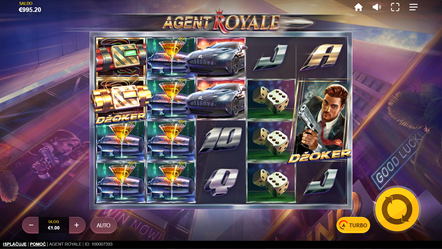 Agent Royale je akcijski slot od Red Tiger koji te vodi u svijet špijuna, eksplozija i visokih uloga. Igra ima 5 valjaka, 4 reda i 40 linija isplate, uz vrhunsku grafiku inspiriranu filmskim bondovskim scenama. Glavni junak, tajni agent, pojavljuje se kao posebni simbol koji zaključava wild simbole i pomaže u stvaranju moćnih kombinacija. Tema špijunaže i glamura stvara atmosferu pravog blockbustera. Svaki spin donosi dozu filmske napetosti i mogućnost velikih nagrada.