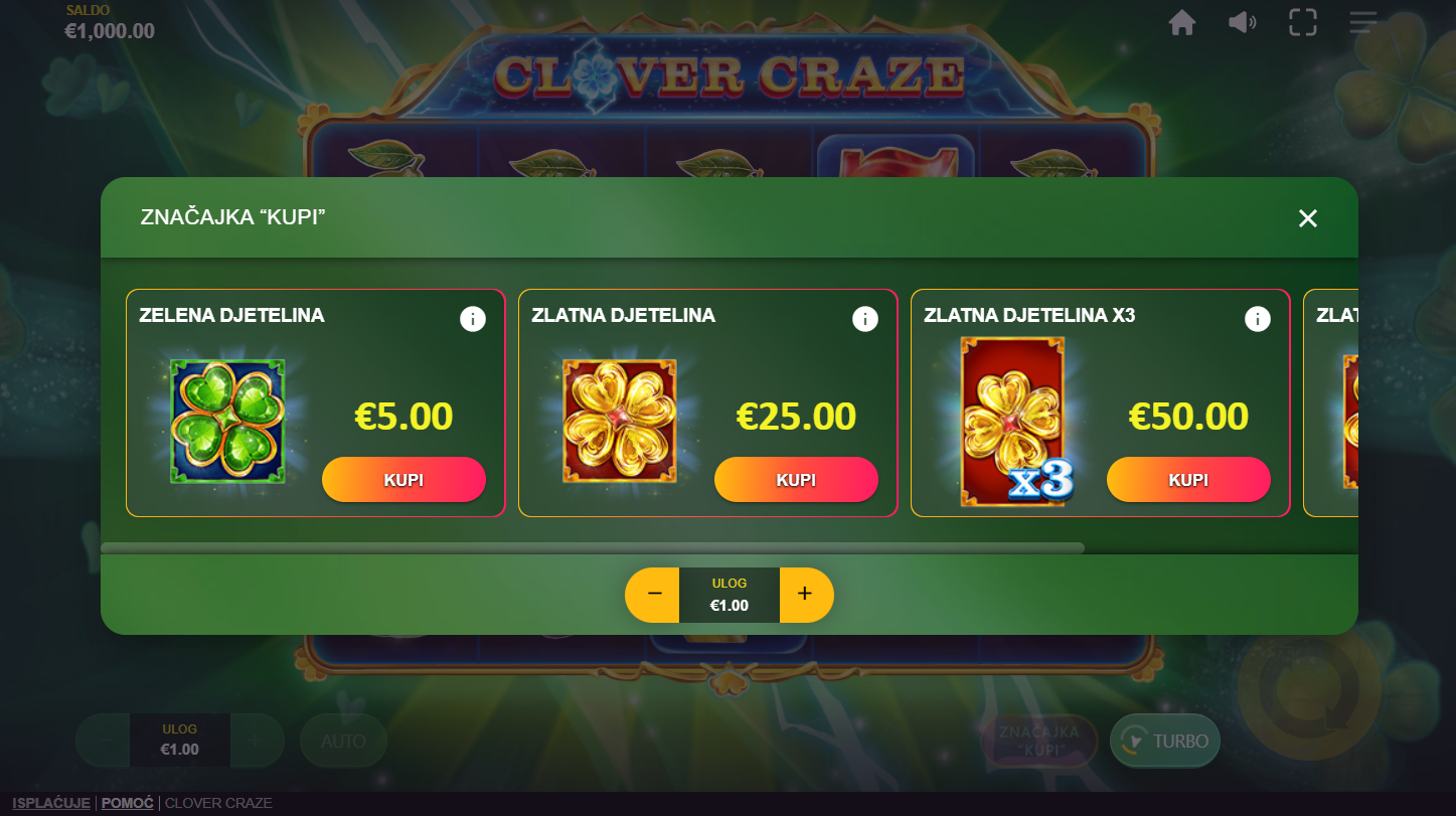 S RTP-om od 96.25% i srednjom volatilnošću, Clover Craze pruža odličnu ravnotežu između čestih dobitaka i onih pravih velikih iznenađenja. Maksimalni potencijal ide do nevjerojatnih 21000 puta uloga što znači da te iza svake vrtnje može čekati bogatstvo dostojno vilenjaka s kraja duge!