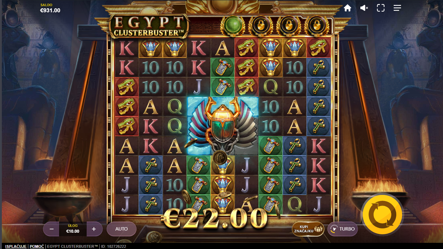 Egypt Clusterbuster od Red Tiger donosi tajanstveno srce drevnog Egipta gdje svaki spin stvara avanturu ispunjenu legendarnim simbolima, prekrasnim grafikama i misterijom skrivene škrinje. Velika mreža i Cluster Pays mehanika osiguravaju da svaki spin može otkriti velike skupove simbola i nizove eksplozivnih dobitaka.