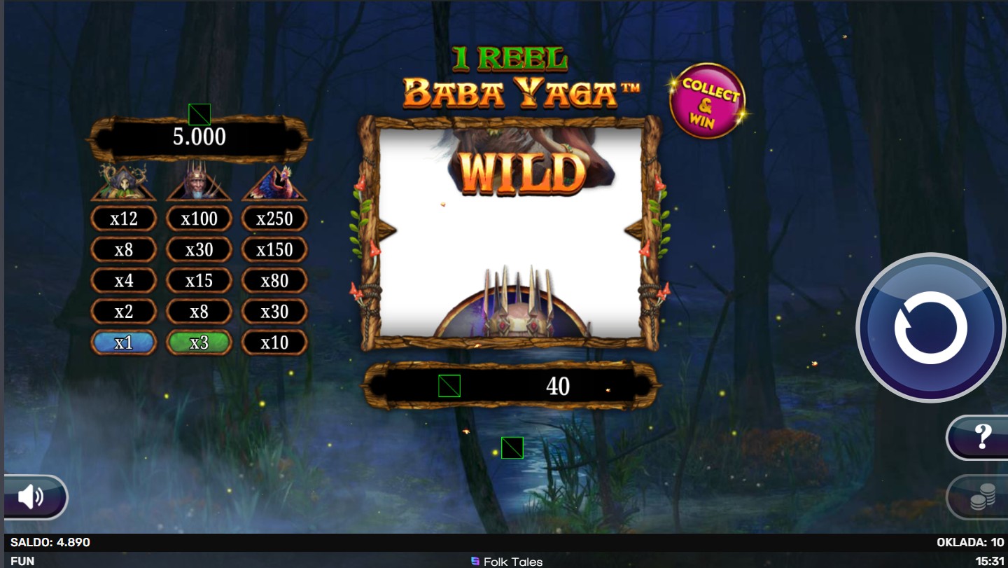 1 Reel Baba Yaga se igra na jednom bubnju s jednom isplatnom linijom. Dobitne kombinacije broje se s lijeva na desno, a Wild simbol pomaže ti u dobivanju bogatih nagrada. Tijekom igre mogu se aktivirati nasumične bonus funkcije koje donose dodatne nagrade. Kada ispuniš sva tri stupca napretka simbola, osvajaš jackpot.Maksimalnidobitak iznosi 500x.