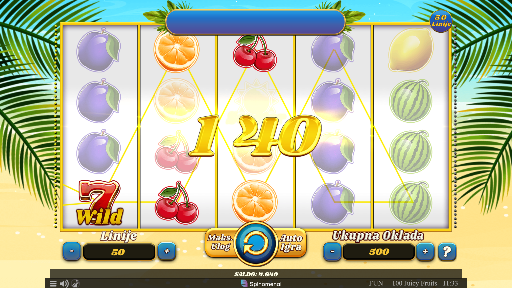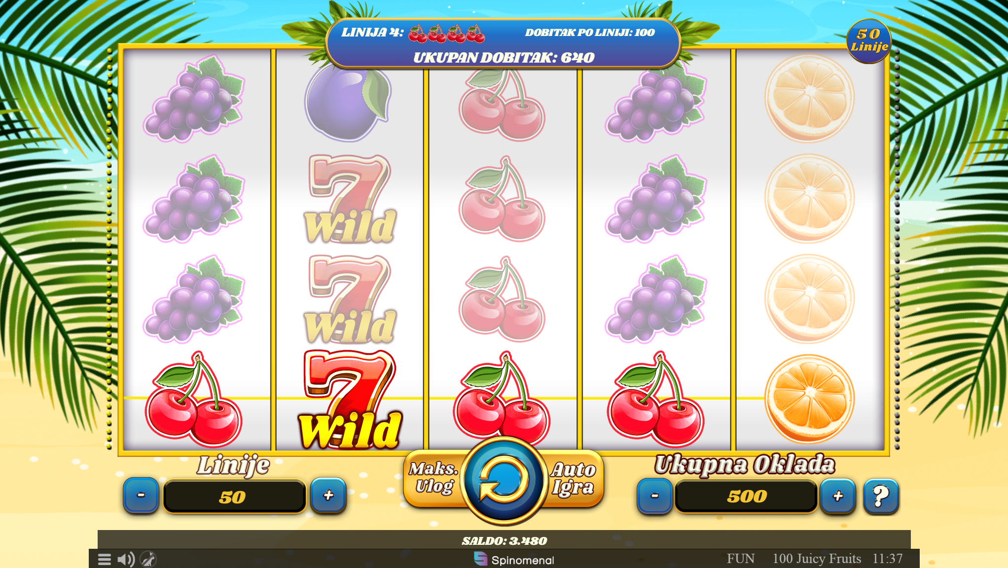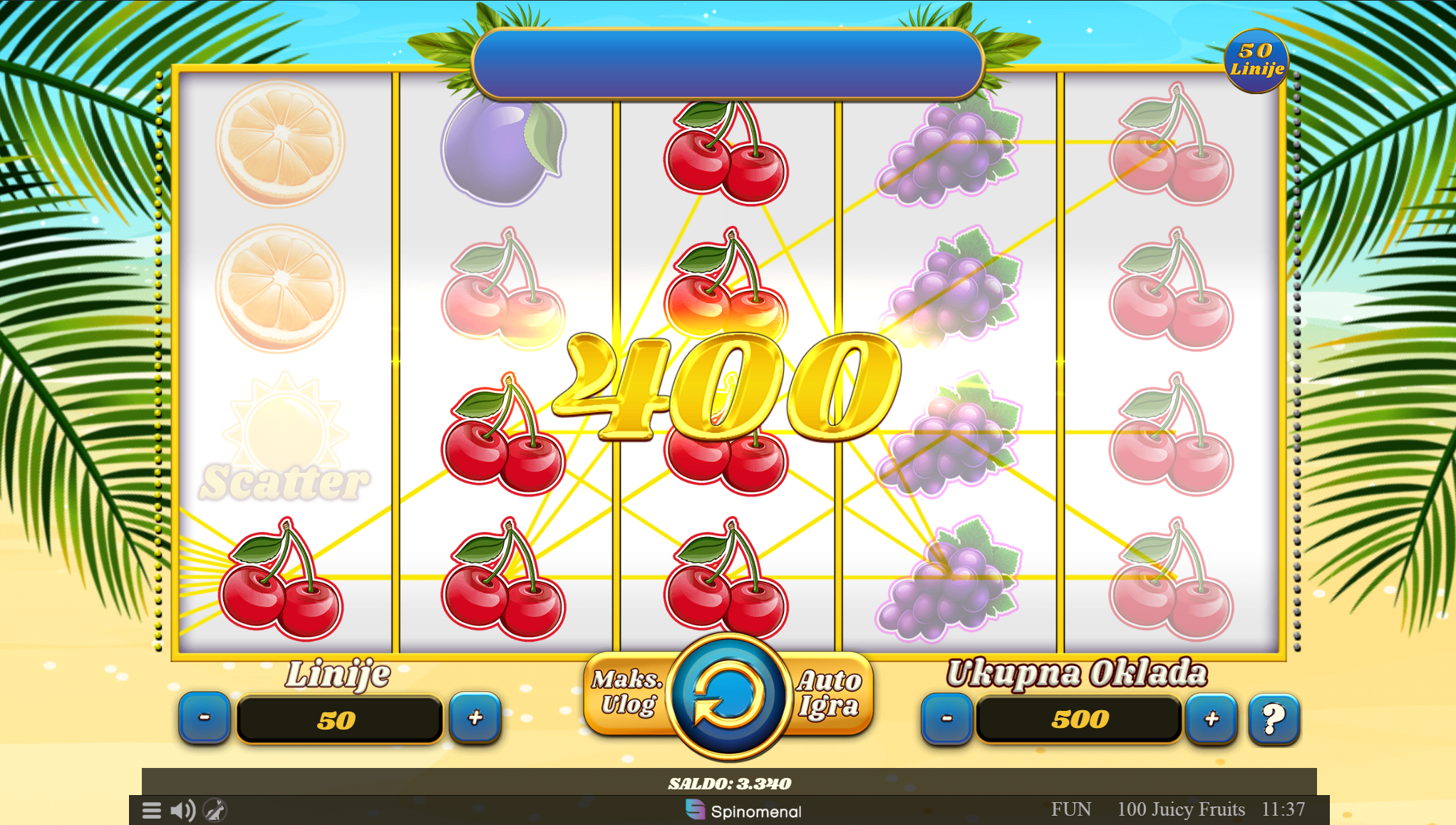 100 Juicy Fruits vodi svoje igrače kroz zabavnu avanturu obogaćenu pažljivo ilustriranim voćnim simbolima uz dodatak zlatnih efekata. Super jednostavan način igranja omogučiti će igračima dugotrajnu zabavu, a kako bi ona također bila i uzbudljiva pobrinuti će se 100 Juicy Fruits wild simboli koji će tvoje dobitke pretvoriti u veće i učestalije. Ako voliš igre koje ti pružaju izvrstan omjer rizika i dobitaka došao si na pravo mjesto! Prepusti se zabavi i užitku te sa sobom odnesi velike dobitke!