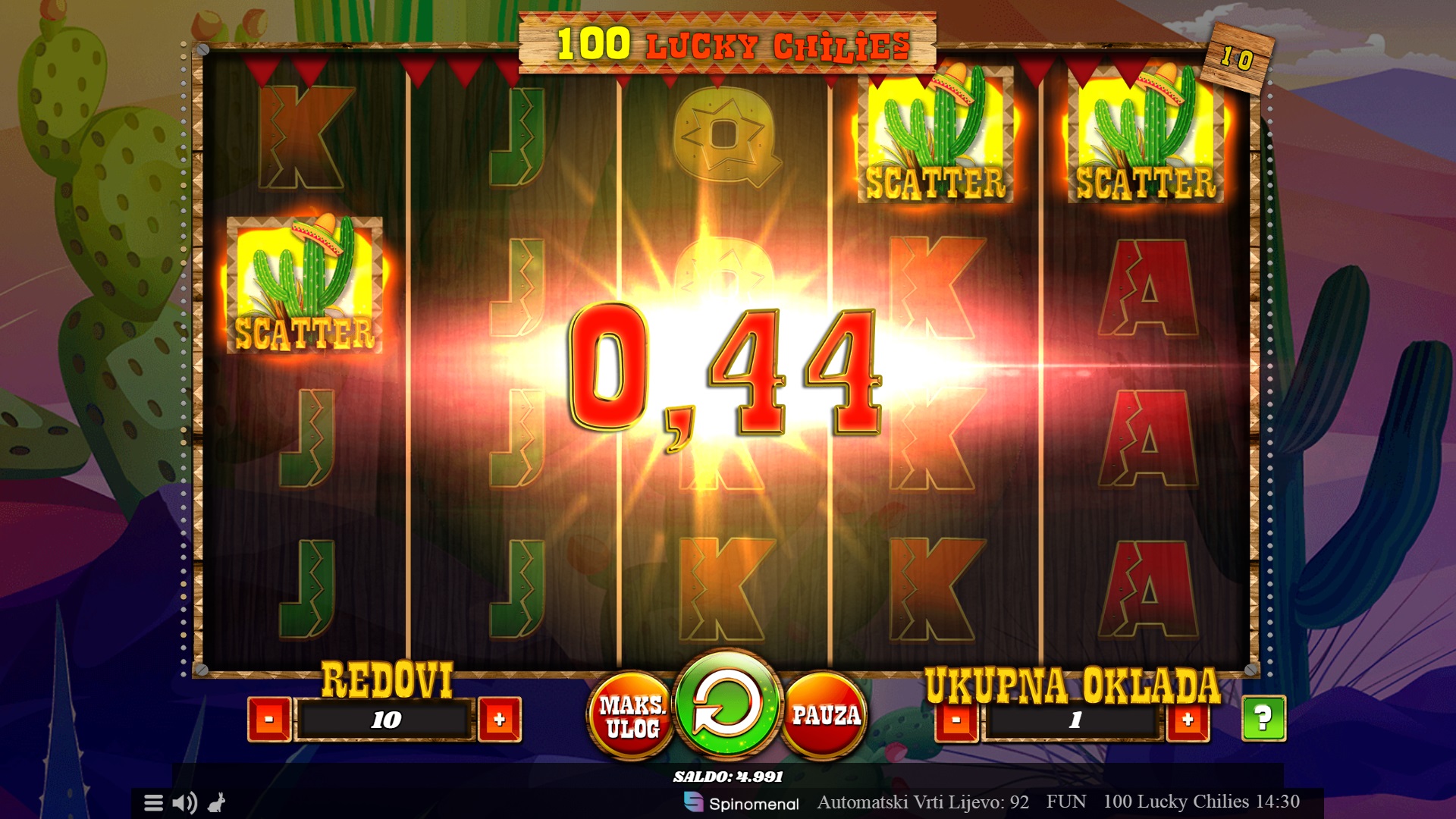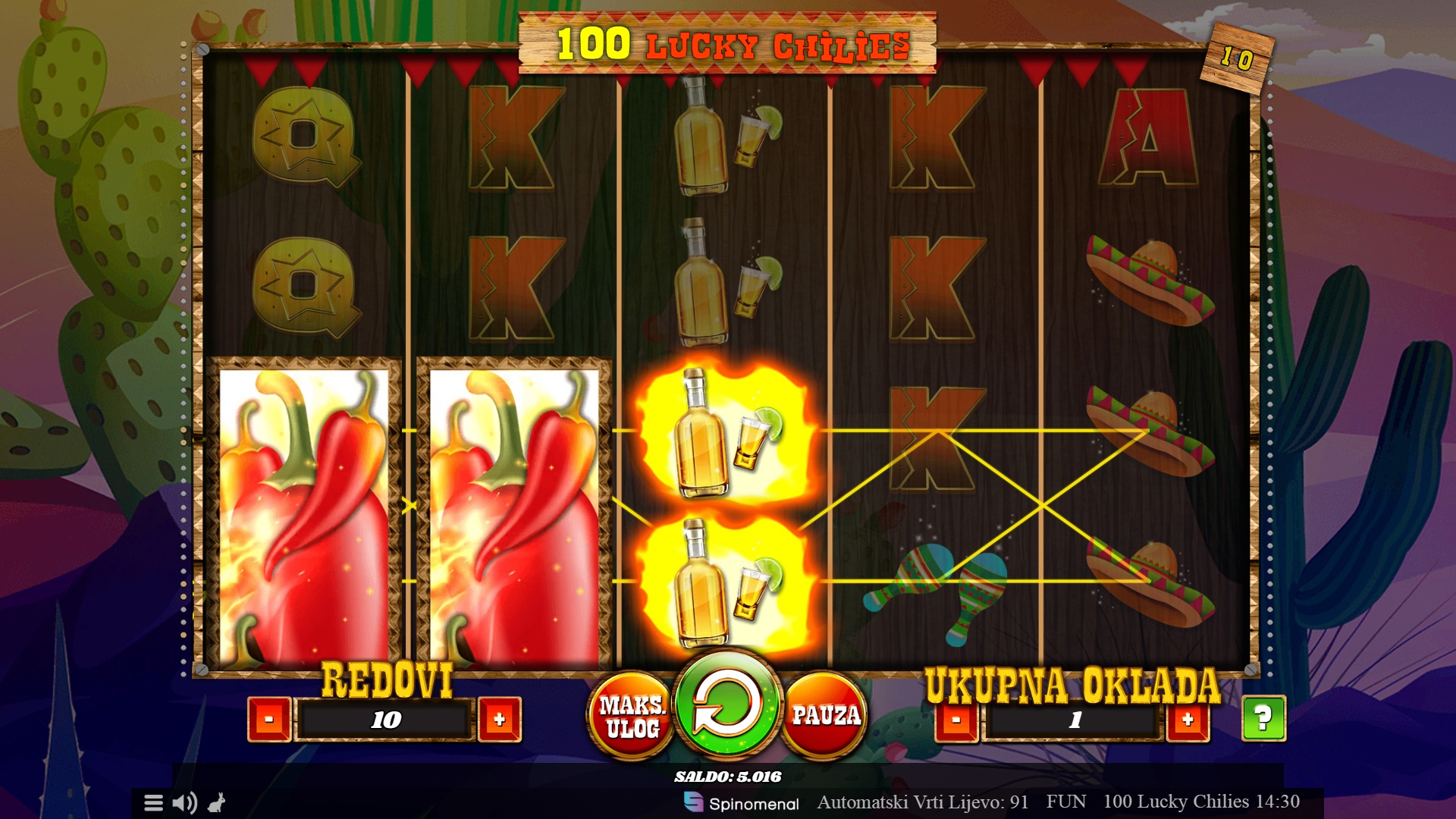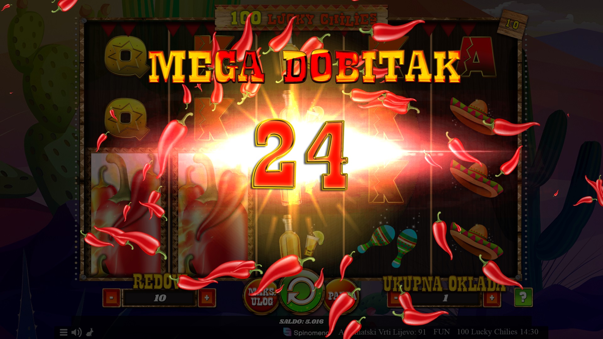 Gameplay u 100 Lucky Chilies je jednostavan i prilagodljiv. Možeš birati između 10 i 100 aktivnih linija, što ti daje fleksibilnost da igru prilagodiš prema svojim željama. Wild simboli mijenjaju sve simbole osim scatter simbola, čime se povećavaju tvoje šanse za osvajanje nagrada. Scatter simboli donose isplate bez obzira na njihov položaj na bubnjevima. Svi dobitci se isplaćuju slijeva nadesno, počevši od krajnje lijevog bubnja, a samo se najviši dobitak isplaćuje po svakoj liniji. Povećaj svoj ulog po liniji za veće dobitke i uživaj u uzbuđenju koje donosi svaki okretaj!