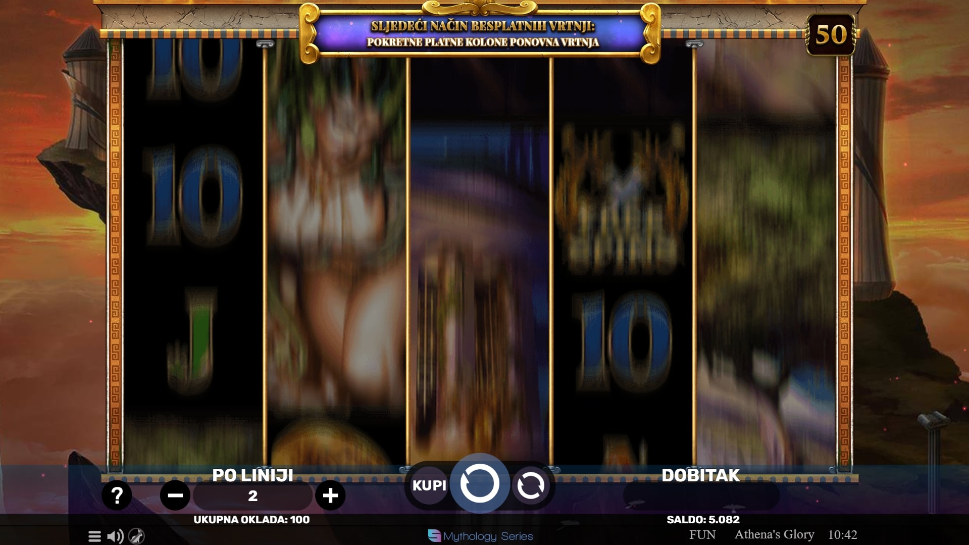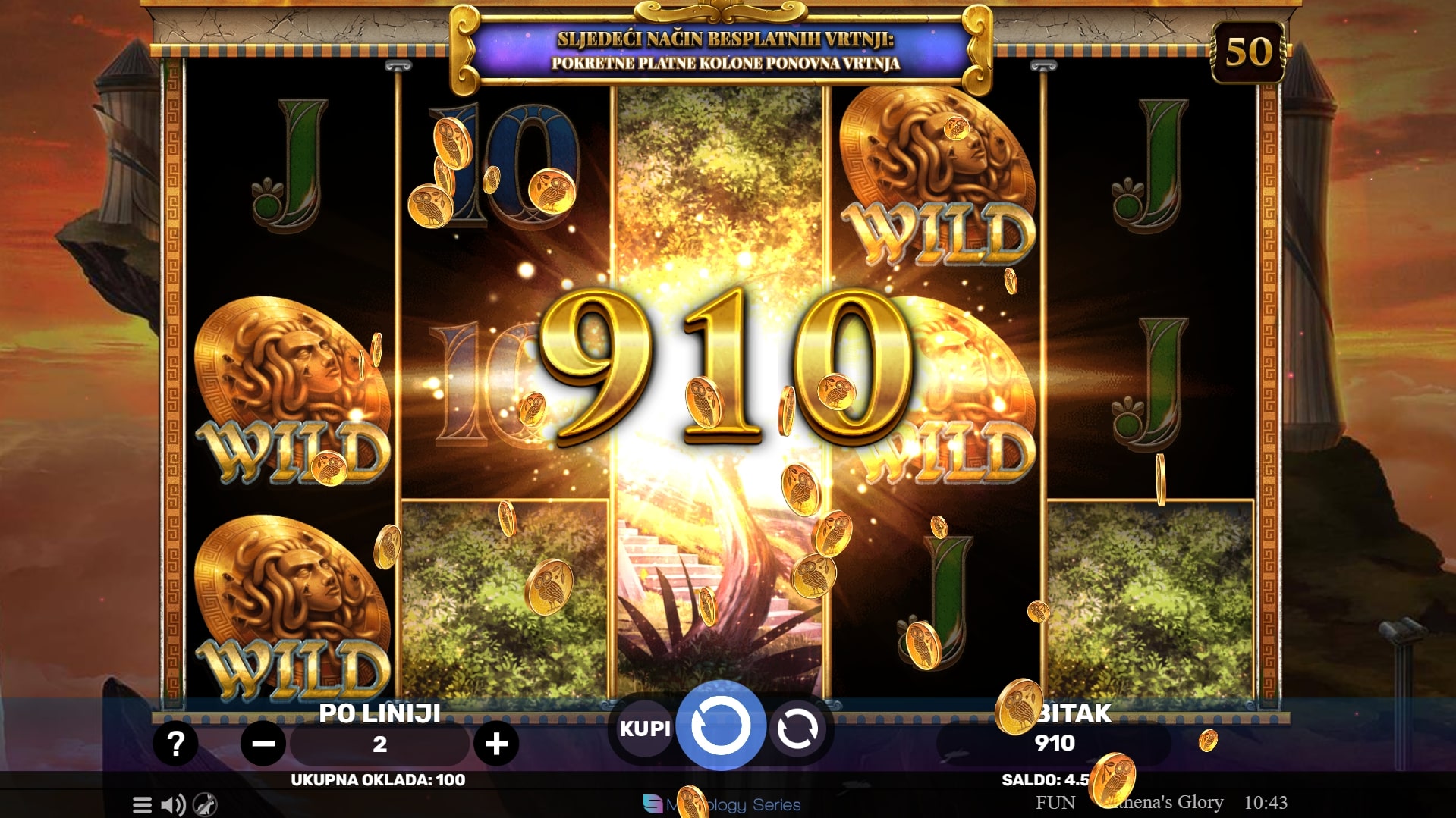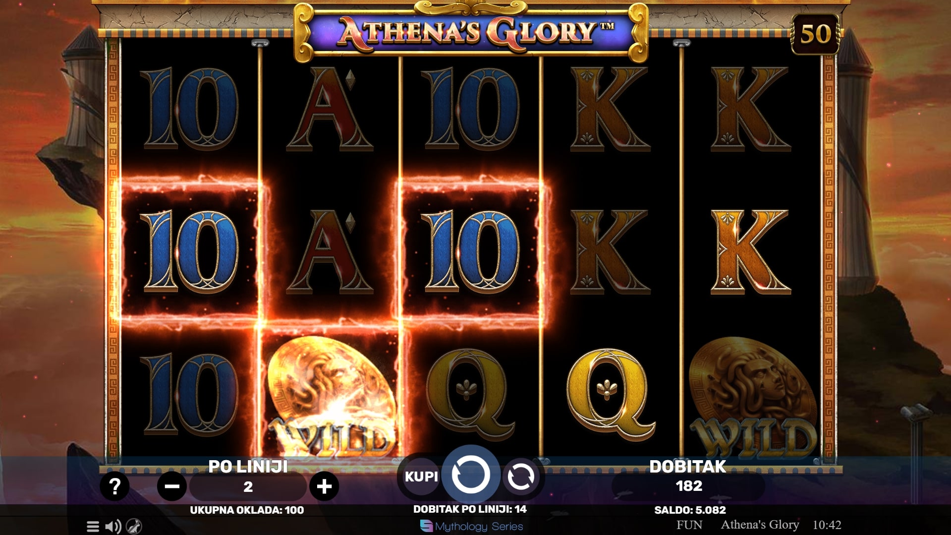 Athena's Glory slot je igra povijesne tematike što vodi igrača u kolijevku demokracije u lovu na epske trijumfe. Simboli su inspirirani grčkom mitologijom, a najviše isplaćuju oni kuće, masline i raznih mitskih bića. Simbol Meduze također može služiti kao zamjena za druge simbole u potrazi za dobicima, dok simboli mačeva šalju igrača na putovanje besplatnih vrtnji. Također, dok se vrte bubnjevi može se pojaviti multiplikator dobitka. Zaigraj Athena's Glory te osvoji legendarne nagrade!