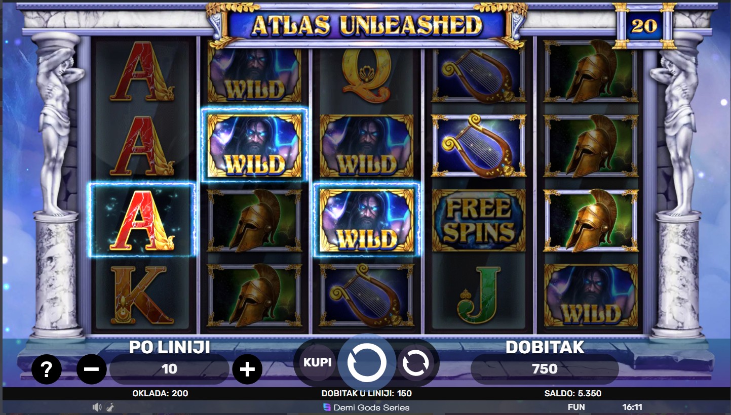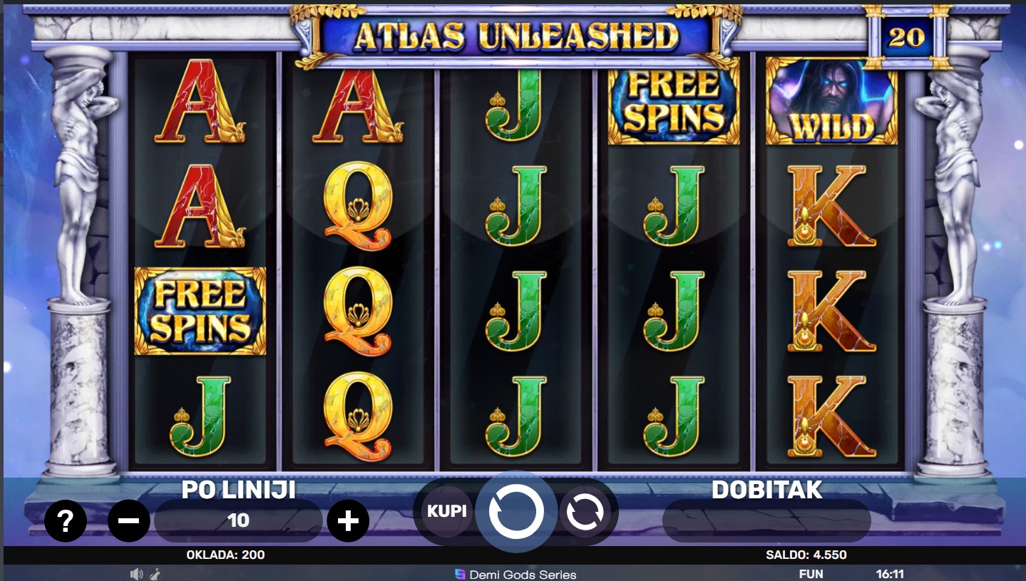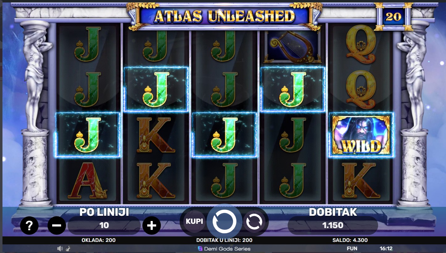 Zakorači u mitski svijet s Atlas Unleashed providera Spinomenal i oslobodi snagu legendarnog Titana! Ova uzbudljiva slot igra vodi te kroz epske avanture na 5 bubnjeva i 4 reda, gdje Wild simboli zamjenjuju sve ostale simbole osim Scattera, a besplatne vrtnje i multiplikatori povećavaju tvoje šanse za nevjerojatne dobitke. Svaki spin može aktivirati posebne funkcije i bonus runde, pružajući ti osjećaj moći i pobjede dok istražuješ mitska blaga.