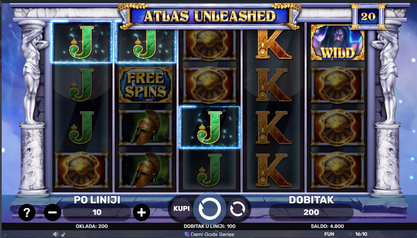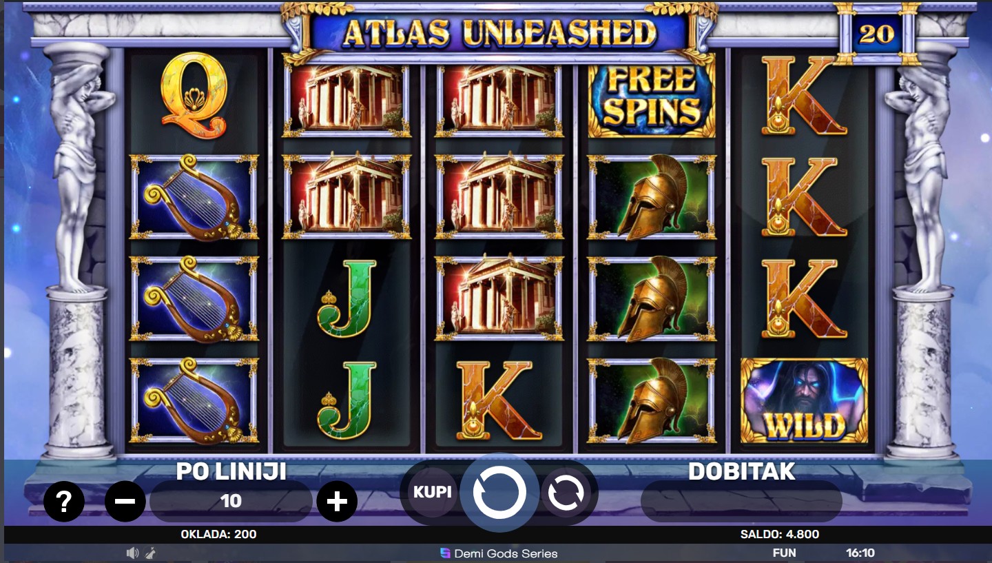 Atlas Unleashed se igra na 5 bubnjeva i 4 reda s 20 isplatnih linija. Dobitne kombinacije broje se s lijeva na desno, a Wild simbol zamjenjuje sve ostale simbole osim Scattera. Tri ili više Scatter simbola pokreću bonus besplatne vrtnje, tijekom kojih multiplikatori povećavaju tvoje dobitke. Tijekom osnovne igre mogu se aktivirati dodatne bonus funkcije za više nagrada.