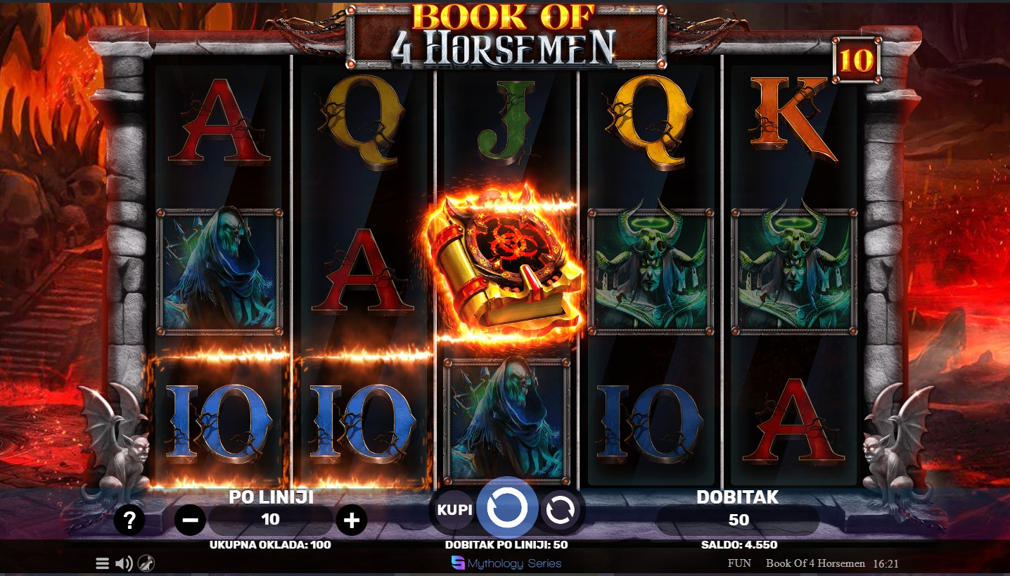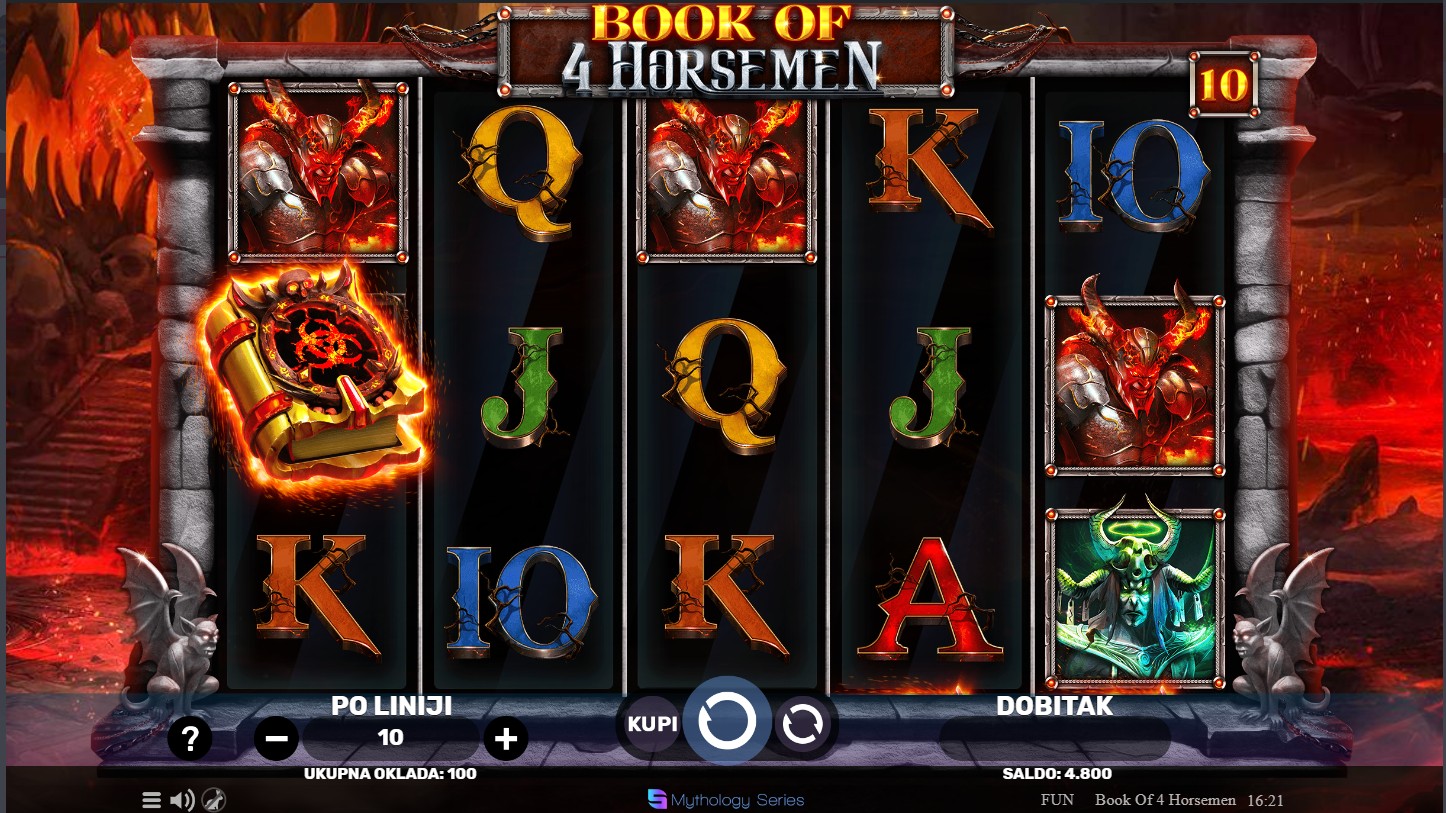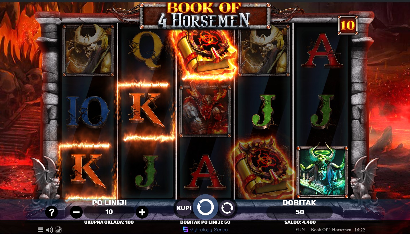 Zakorači u epski svijet apokalipse s Book of 4 Horsemen providera Spinomenal! Ova uzbudljiva slot igra vodi te kroz legendu o četiri jahača, donoseći bogate nagrade i bonus značajke. Na 5 bubnjeva i 3 reda, Wild simboli djeluje i kao Scatter, dok besplatne vrtnje i multiplikatori povećavaju tvoje šanse za velike dobitke. Svaki spin donosi uzbuđenje, a posebne funkcije omogućuju dodatne nagrade u potrazi za apokaliptičkim blagom.