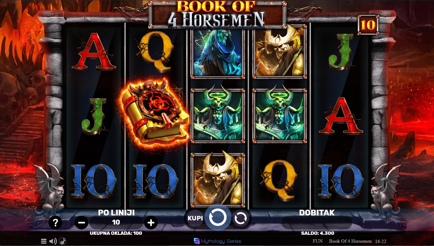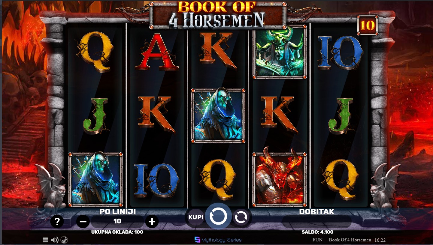 Book of 4 Horsemen se igra na 5 bubnjeva i 3 reda s 10 isplatnih linija. Dobitne kombinacije broje se s lijeva na desno, a Wild simbol koji djeluje i kao Scatter. Tri ili više Scatter simbola pokreću bonus besplatne vrtnje, tijekom kojih multiplikatori povećavaju tvoje dobitke. Tijekom igre mogu se aktivirati nasumične bonus funkcije koje donose dodatne nagrade.Maksimalni dobitak je 5 000x uloga.