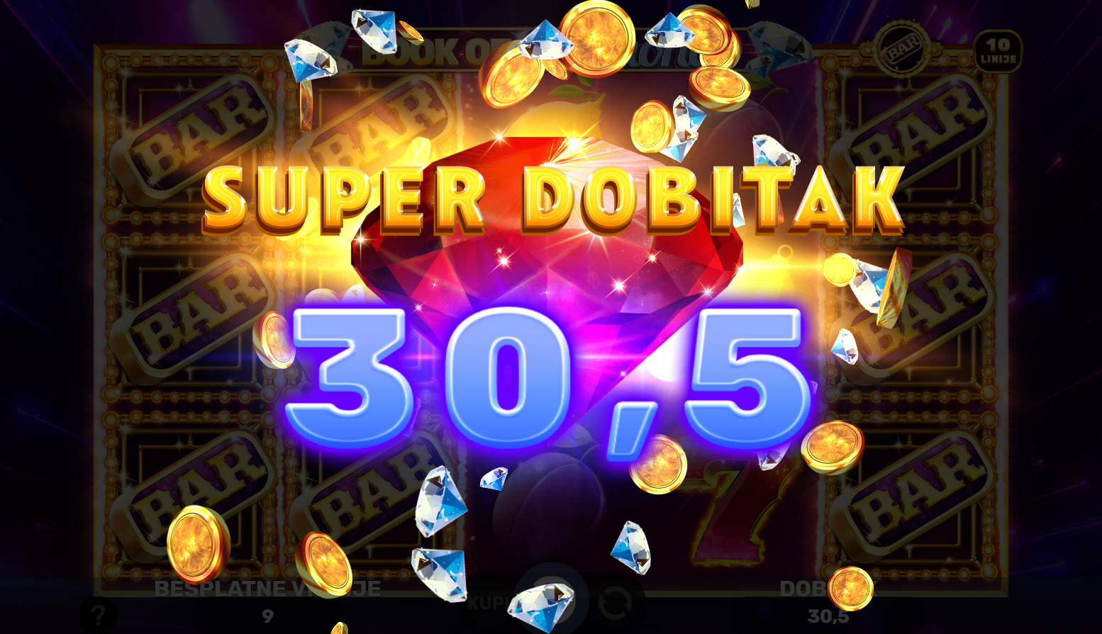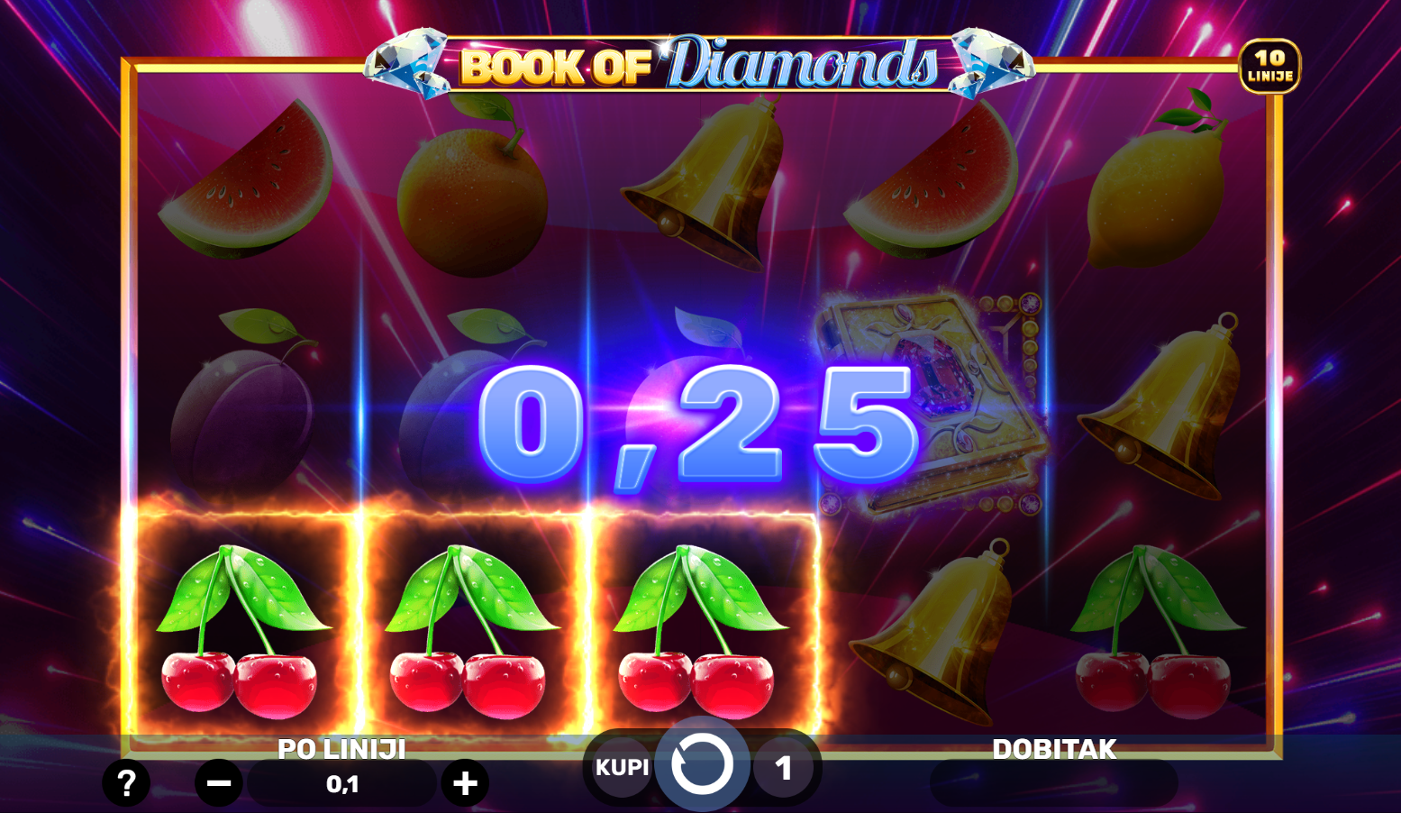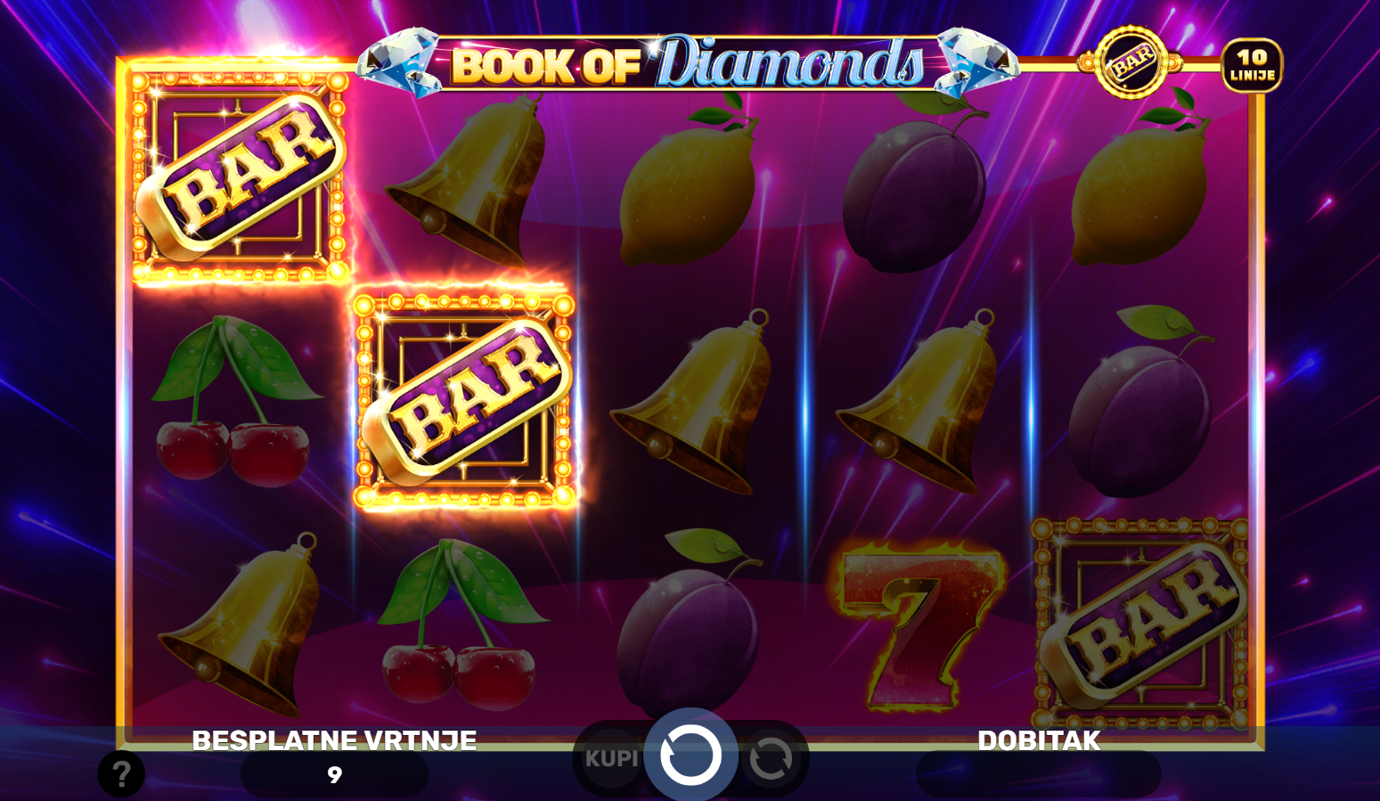 U igri Book of Diamonds od Spinomenal, uživat ćeš u klasičnom slot iskustvu s modernim twistom. Ova igra nudi 10 fiksnih linija i mnoštvo prilika za osvajanje velikih nagrada. S Wild simbolom koji također djeluje kao scatter, svaka vrtnja može donijeti neočekivana iznenađenja. S 3 ili više Wild simbola, pokrećeš 10 besplatnih vrtnji gdje možeš osvojiti još više nagrada. Book of Diamonds nudi uzbudljive mogućnosti za dobitak uz fantastične free spinove i velike jackpote!
