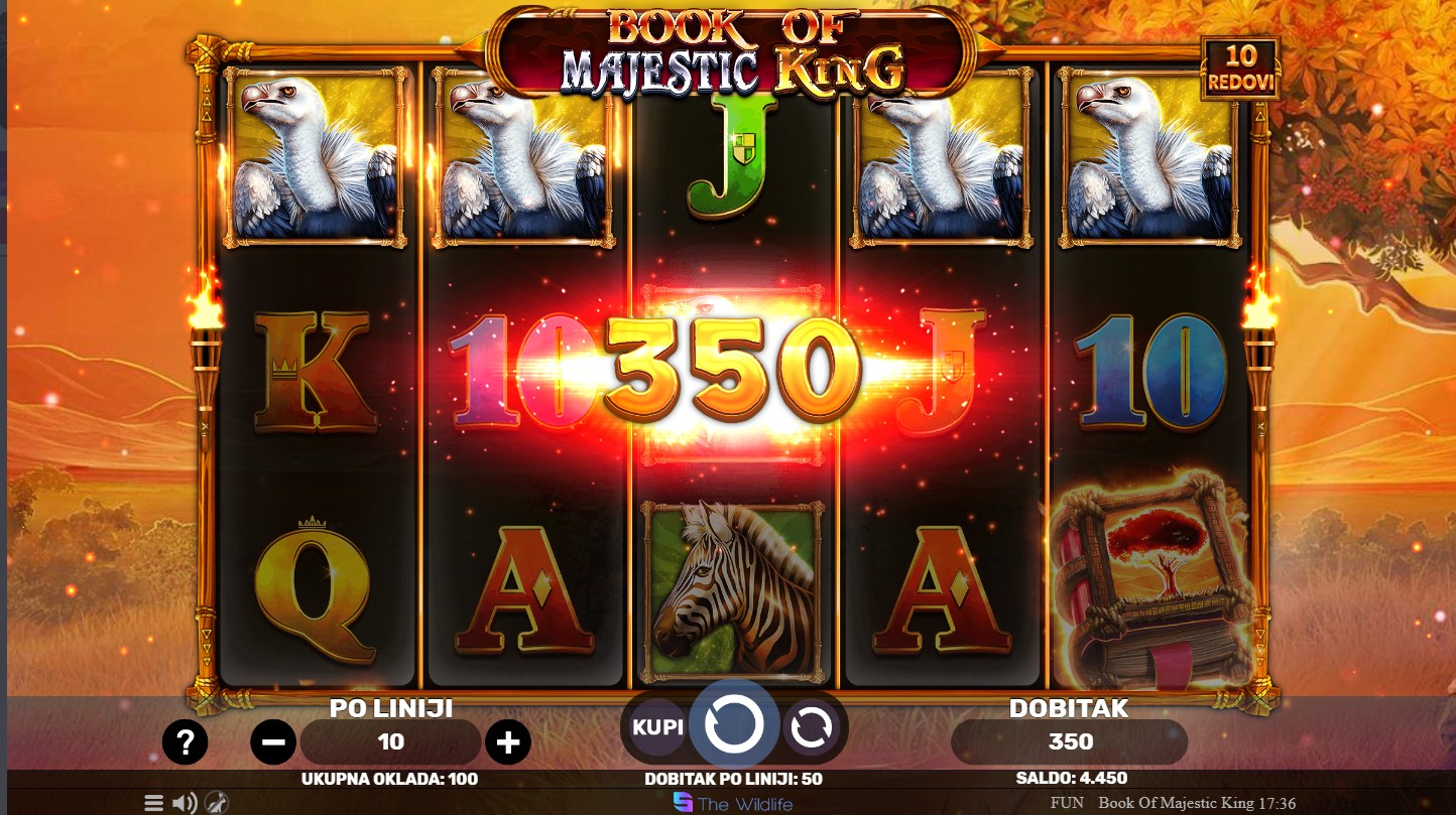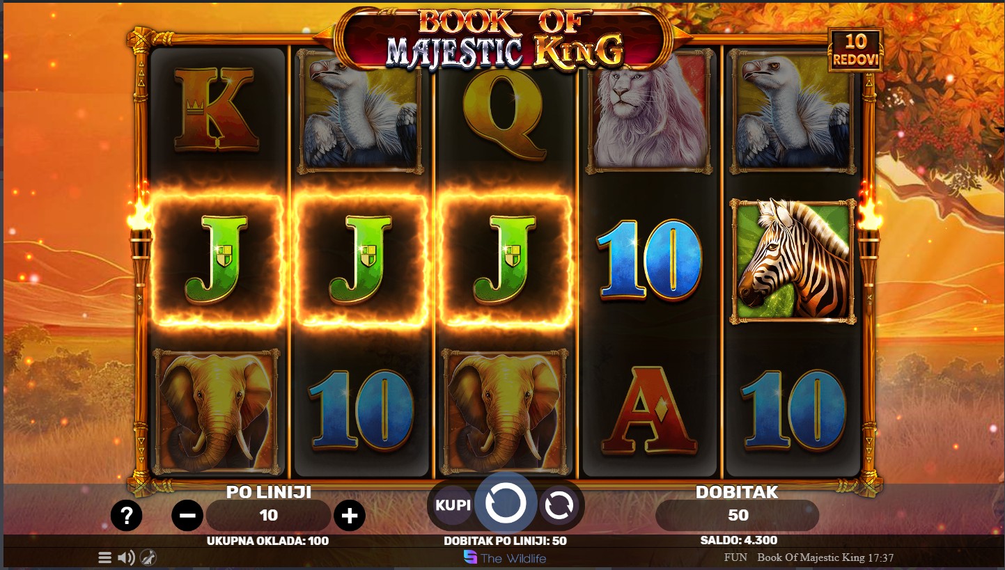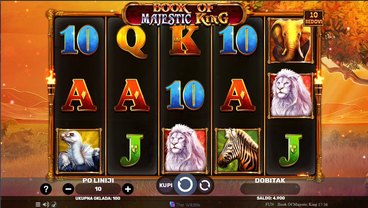 Book of Majestic King se igra na 5 bubnjeva i 3 reda s 10 isplatnih linija. Dobitne kombinacije broje se s lijeva na desno, a Wild simbol koji djeluje i kao Scatter. Tri ili više Scatter simbola pokreću bonus besplatne vrtnje, tijekom kojih multiplikatori povećavaju tvoje dobitke. Tijekom igre mogu se aktivirati nasumične bonus funkcije koje donose dodatne nagrade. Maksimalni dobitak je 5 000x uloga.
