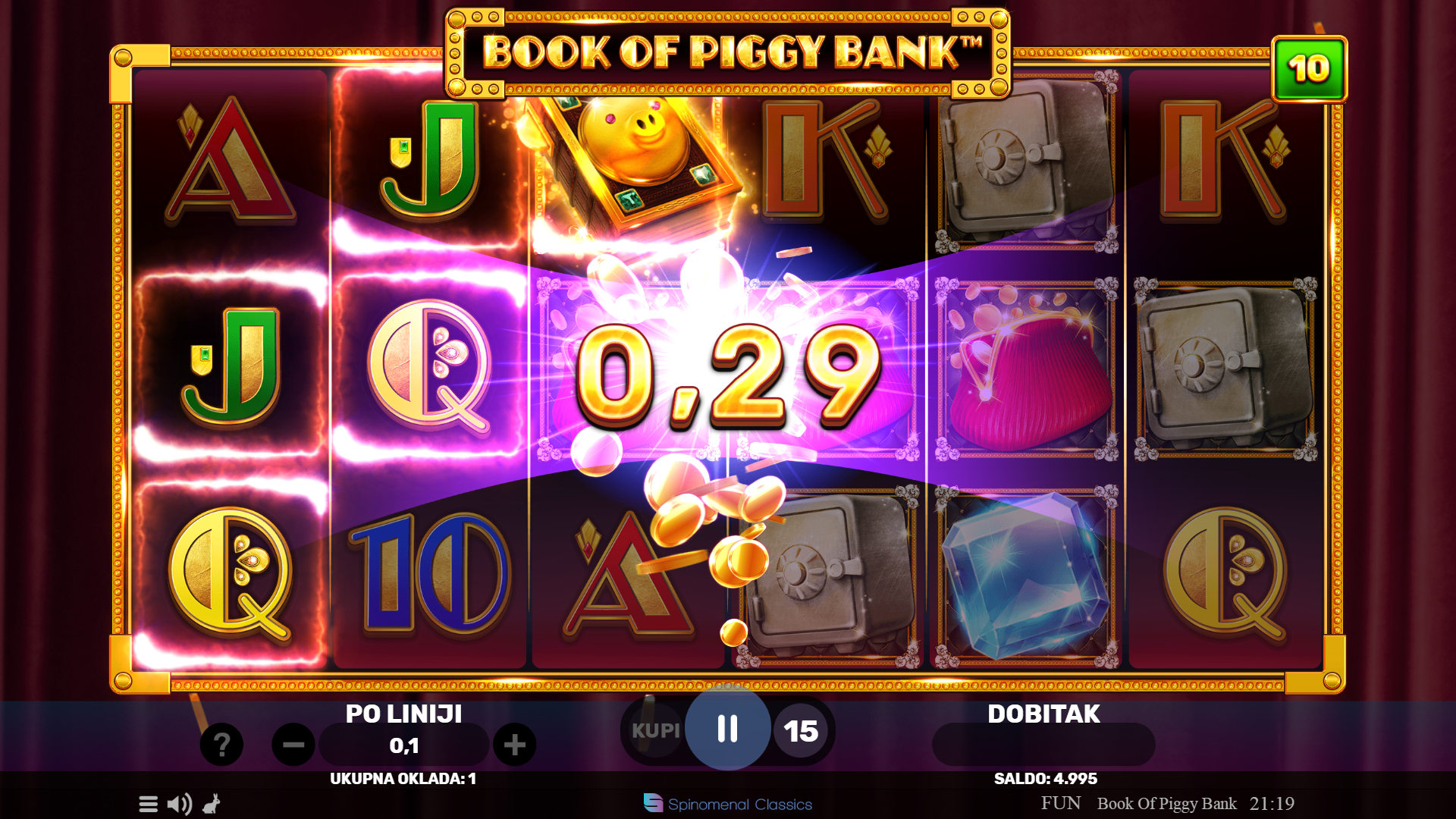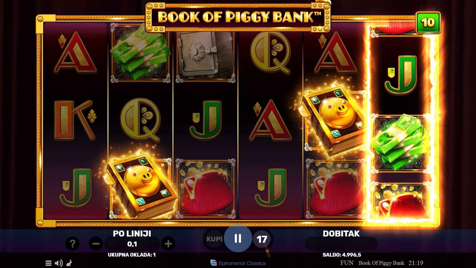 Gameplay u Book Of Piggy Bank je jednostavan i zabavan. S pet valjaka i deset fiksnih dobitnih linija, ova slot igra nudi brojne mogućnosti za osvajanje. Wild simbol zamjenjuje sve druge simbole, povećavajući tvoje šanse za dobitak. Tri ili više Scatter Wild simbola bilo gdje na slotu pokreću bonus igru s 10 besplatnih vrtnji, pri čemu nasumično odabrani simbol djeluje kao proširujući simbol. Proširujući simboli stvaraju nove dobitne linije, dodatno povećavajući tvoje šanse za dobitak.