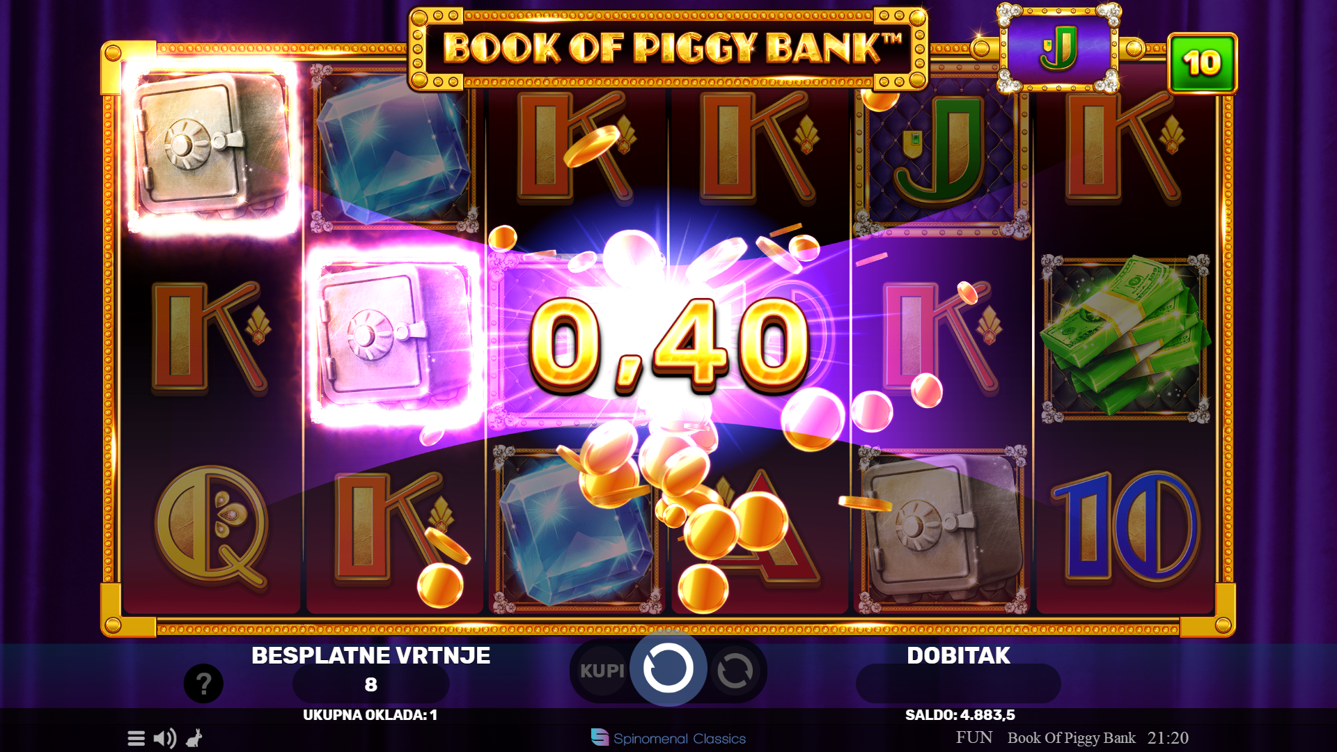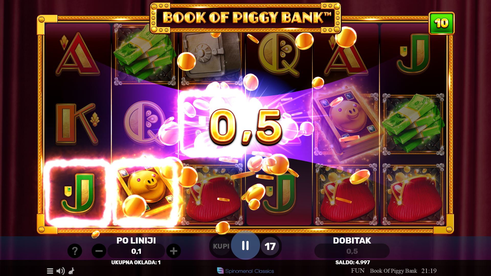 U igri Book Of Piggy Bank od Spinomenal, uživat ćeš u raznolikim bonusima i šarenim simbolima. Ova igra s pet valjaka i deset fiksnih dobitnih linija nudi fantastične mogućnosti za dobitak. Wild simbol ujedno je i Scatter, a tri ili više takvih simbola aktivirat će bonus igru s 10 besplatnih vrtnji. Dobici od Scatter simbola isplaćuju se kao dodatak dobicima na regularnim dobitnim linijama. Uživaj u otkrivanju tajni praseće kasice s Book Of Piggy Bank i okušaj svoju sreću!