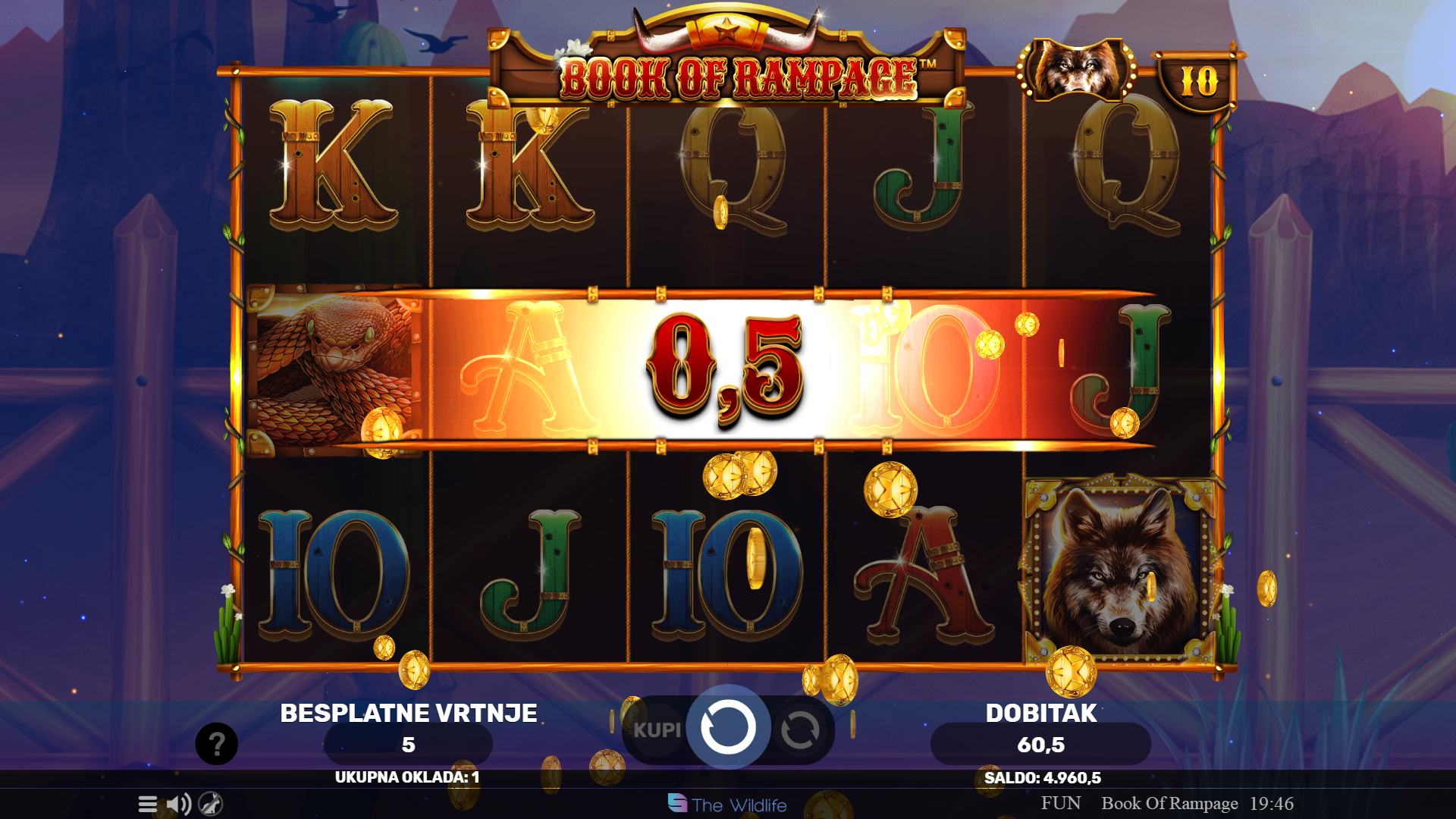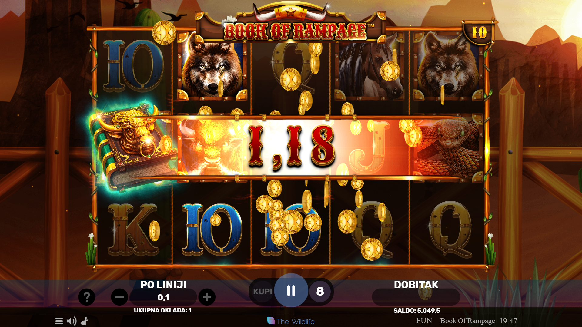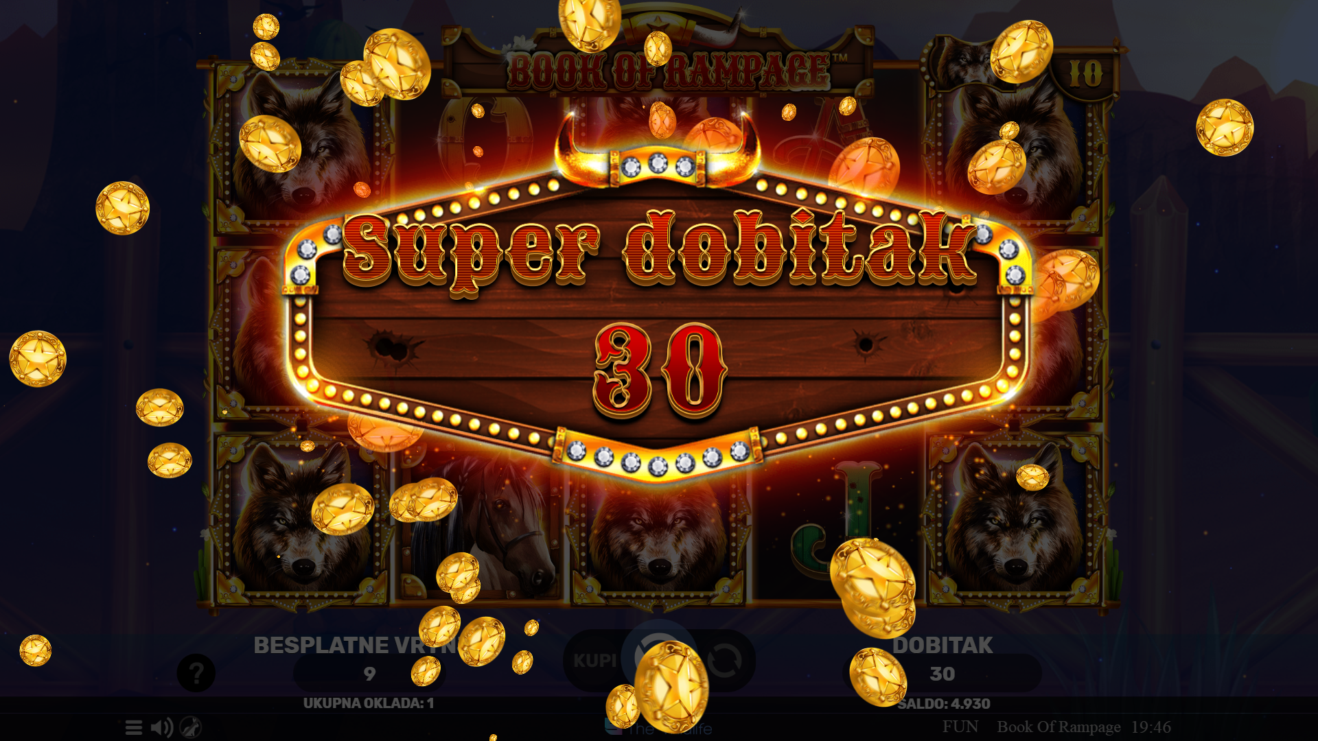 U igri Book of Rampage, uživat ćeš u raznolikim bonusima i šarenim simbolima. Ova igra nudi uzbudljive mogućnosti za dobitak uz fantastične free spinove i velike jackpote. Sa 10 fiksnih dobitnih linija, svaka dobitna kombinacija doprinosi ukupnom dobitku u svakom krugu. Wild simboli koji su istovremeno i scatter simboli donose dodatnu dinamiku i priliku za velike dobitke. Isprobaj Book of Rampage i osjeti uzbuđenje!