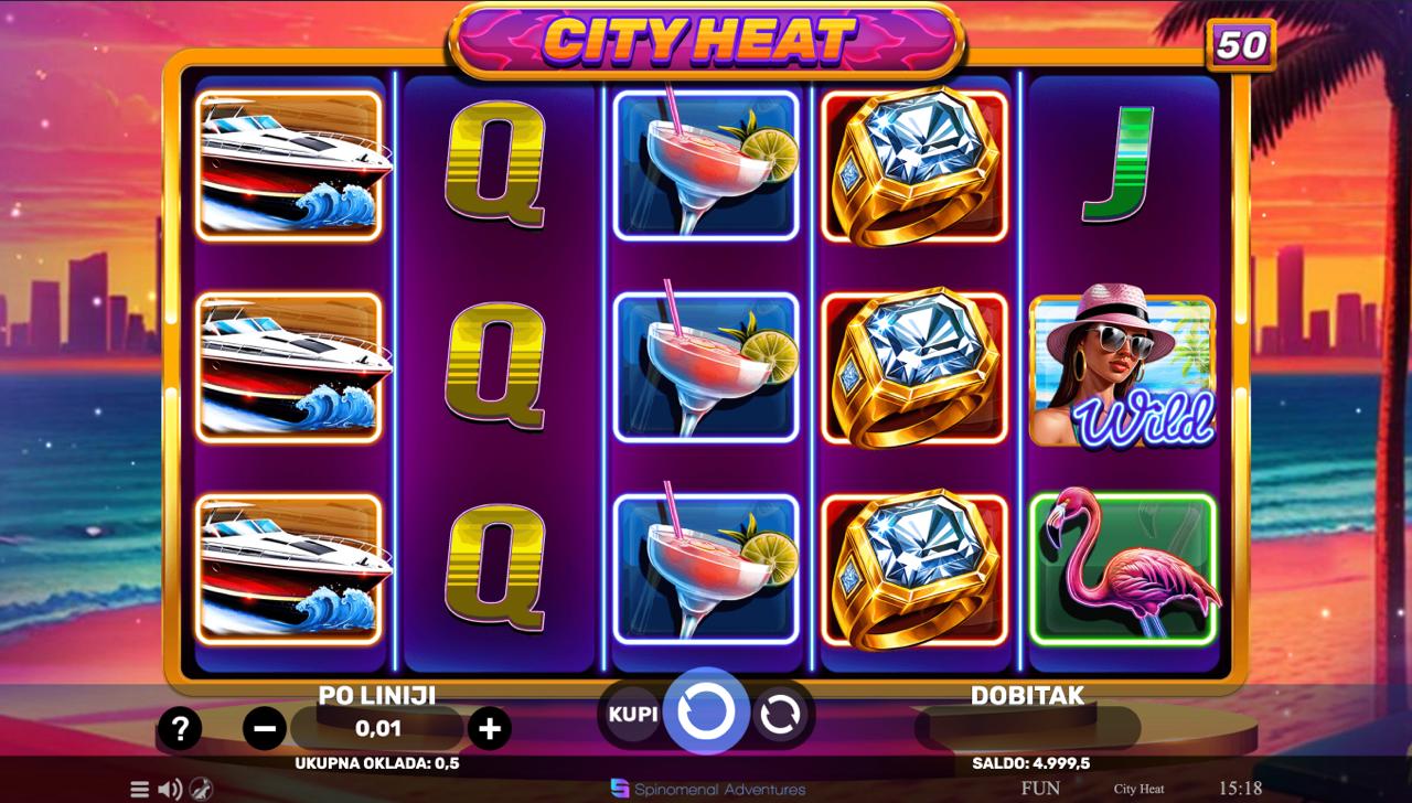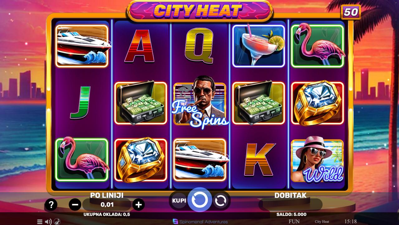 City Heat igra se na više rola, a cilj je složiti iste simbole na aktivnim dobitnim linijama kako bi ostvario dobitak. Wild simboli pomažu u formiranju dobitnih kombinacija zamjenjujući druge simbole, dok Scatter simbol može aktivirati besplatne vrtnje i dodatne bonus funkcije. Postavi željeni ulog, zavrti role i uživaj u uzbudljivoj akciji gradskog ritma!