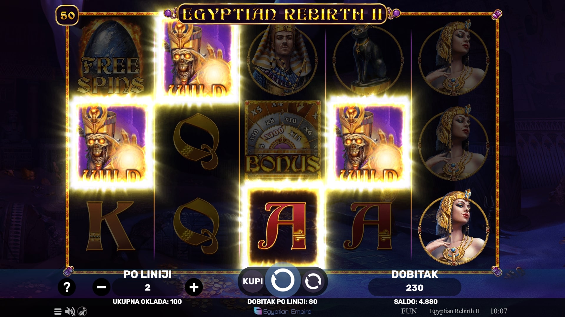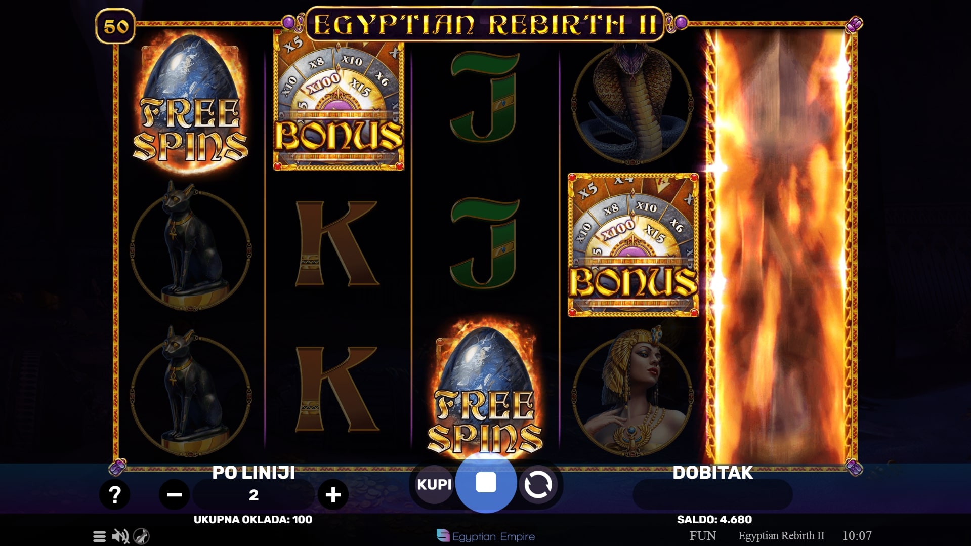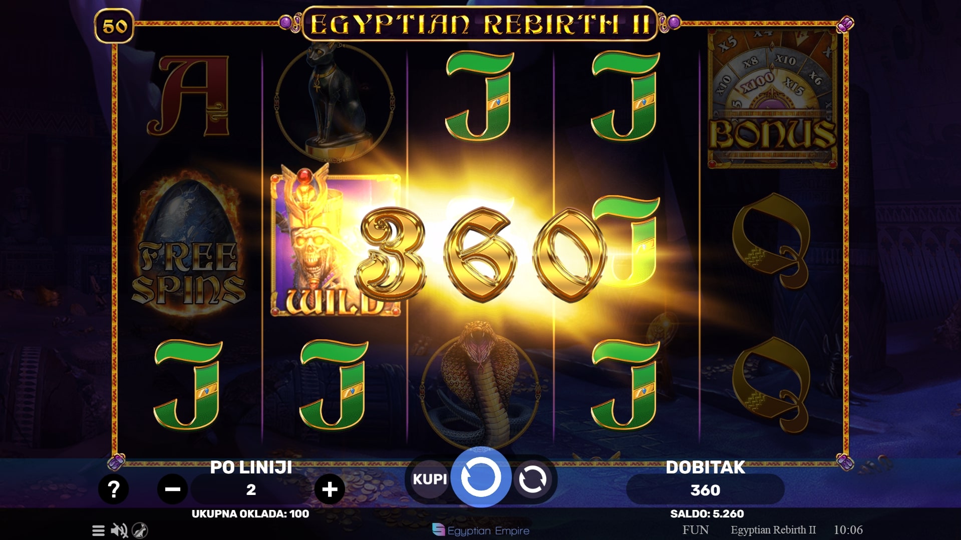 Egyptian Rebirth 2 slot je igra povijesne tematike koja vodi igrača unutar tajnovitih piramidi i grobnica drevnog Egipta. Simboli su inspirirani egipatskom mitologijom, a najveće dobitke isplaćuju kombinacije Faraona, Kleopatri i zmija. U ostvarivanju dobitaka pomažu simboli kostura i pješčanog sata koji mijenjaju druge simbole, dok Bonus i Scatter jaje mogu igraču osvojiti bonus igre, ali i besplatne vrtnje. Zaigraj Egyptian Rebirth 2 te osvoji vrhunske nagrade!