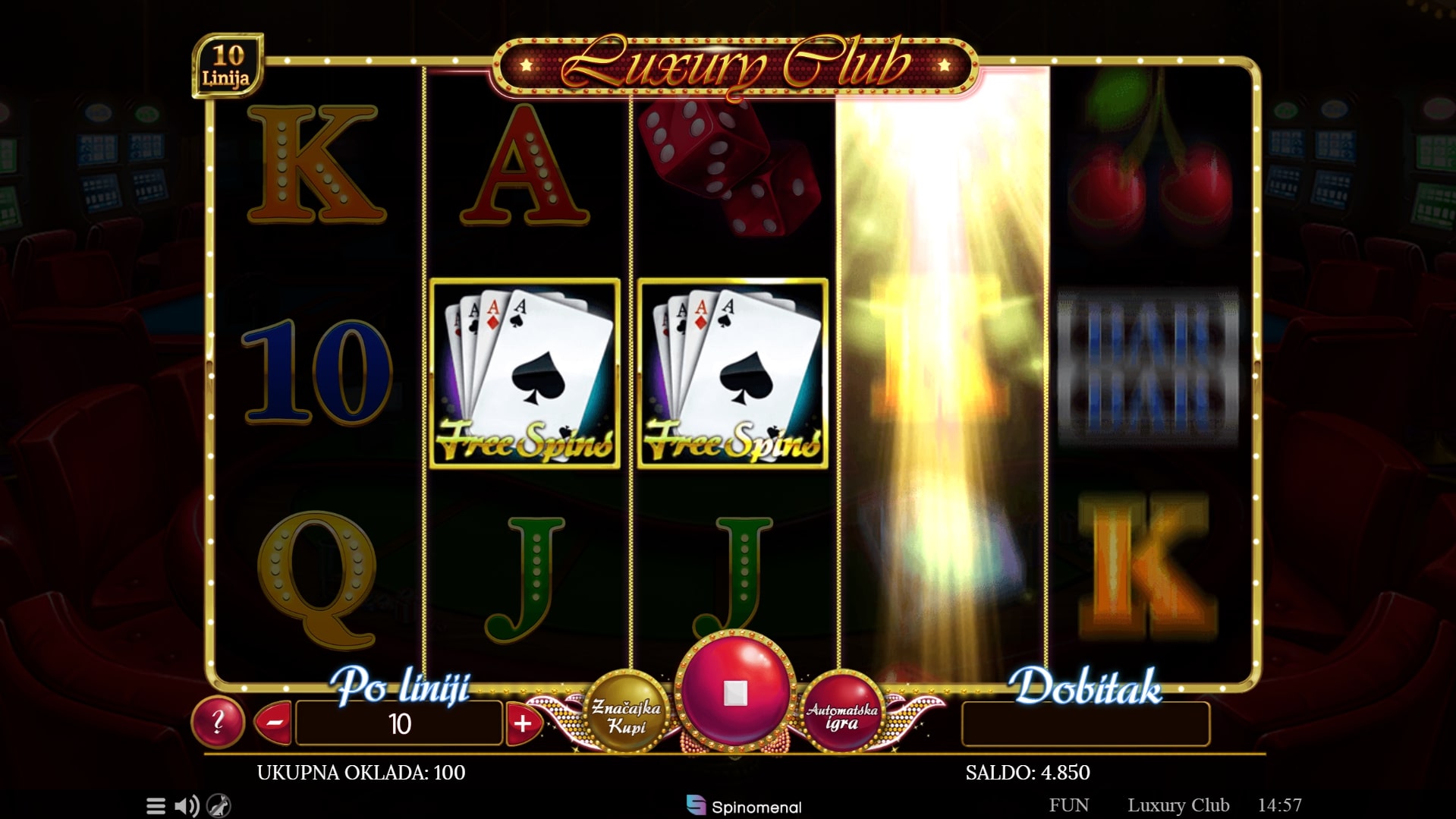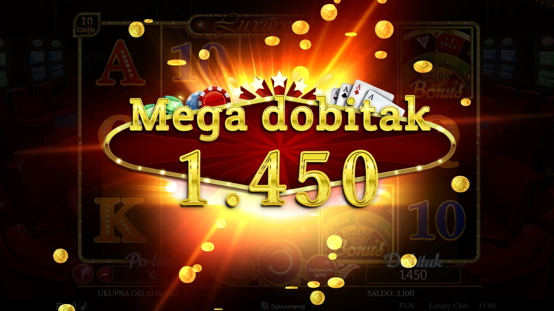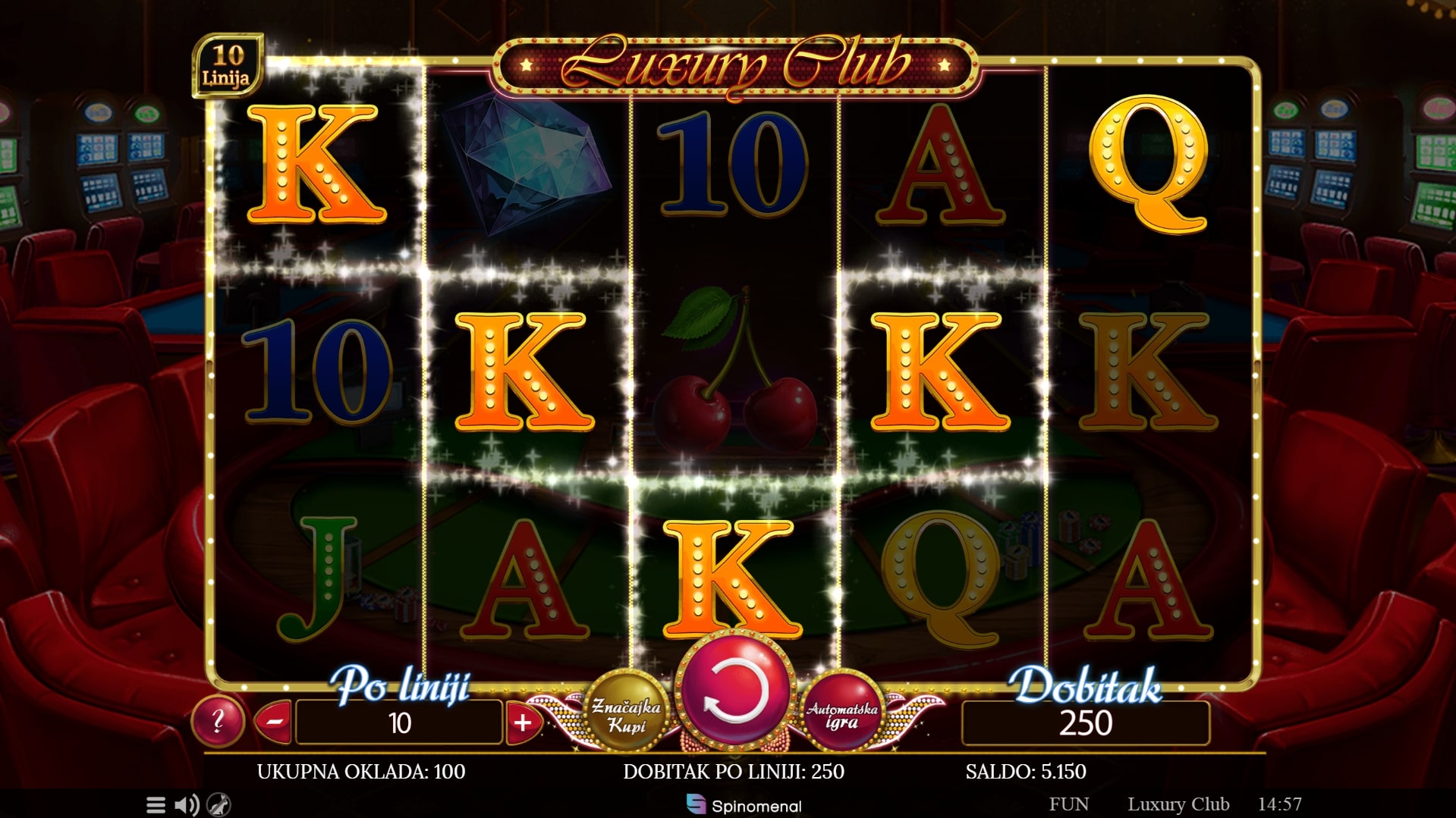 Luxury Club slot je igra retro karaktera koja vodi igrača u svijet luskuza i vrhunskih dobitaka ispunjen toplim ugođajem casina. Najviše isplaćuju simboli dijamanta, poluge i igračih kockica, dok simbol ljepotice u crvenoj haljini mijenja sve simbole osim Scattera. Uz to, igrač može otputovati u paralelni svijet besplatnih vrtnji pojavom simbola ruleta ili igračih karti. Zaigraj Luxury Club te osvoji fenomenalne nagrade!