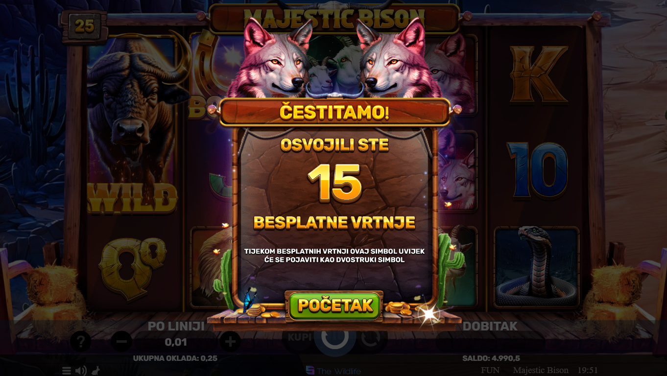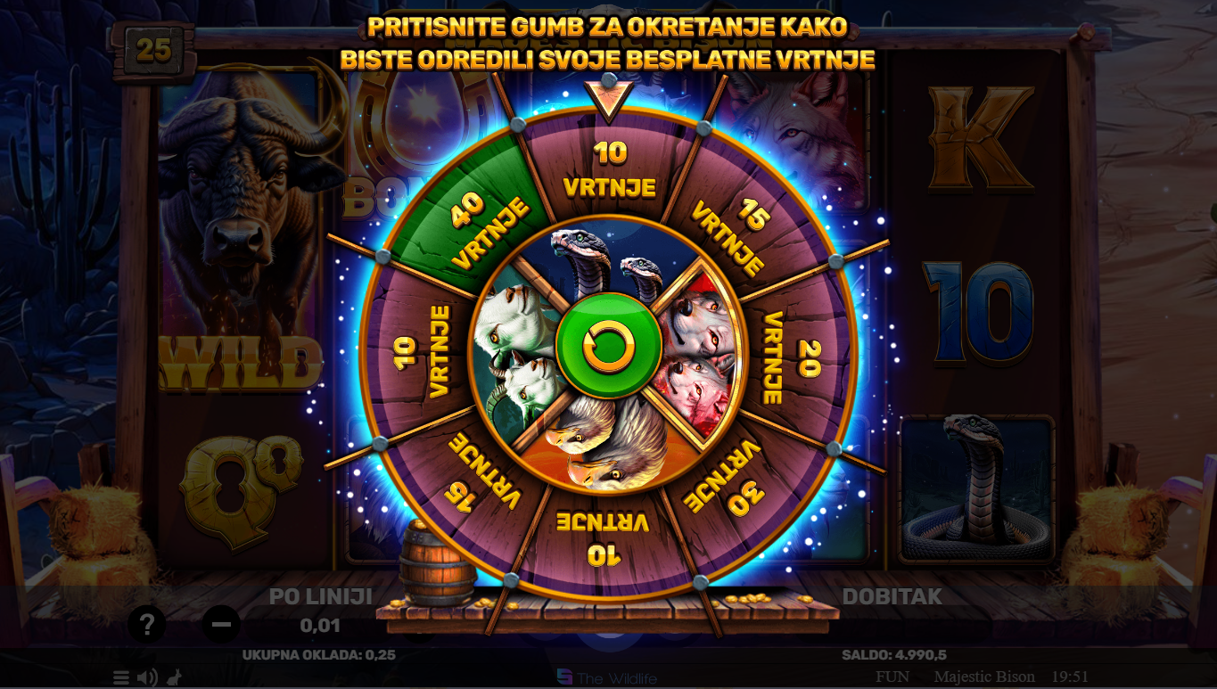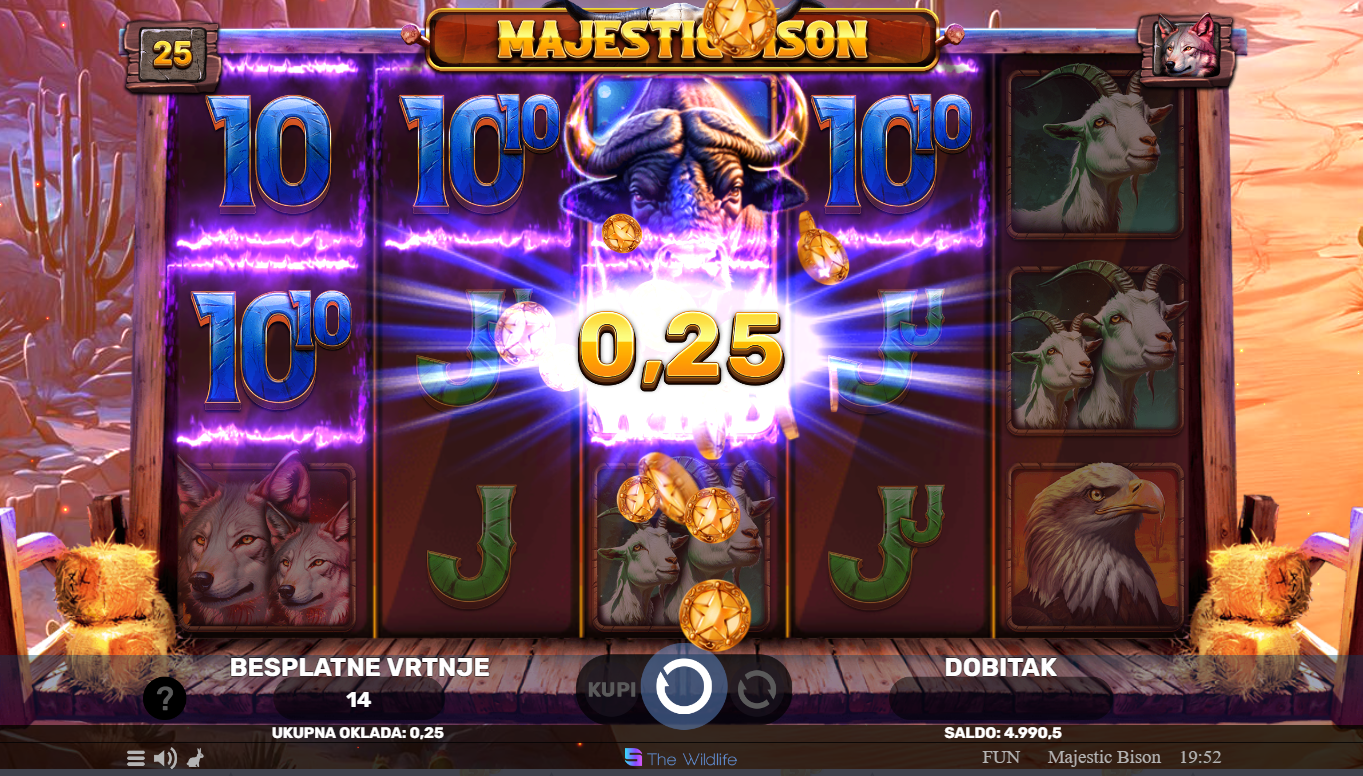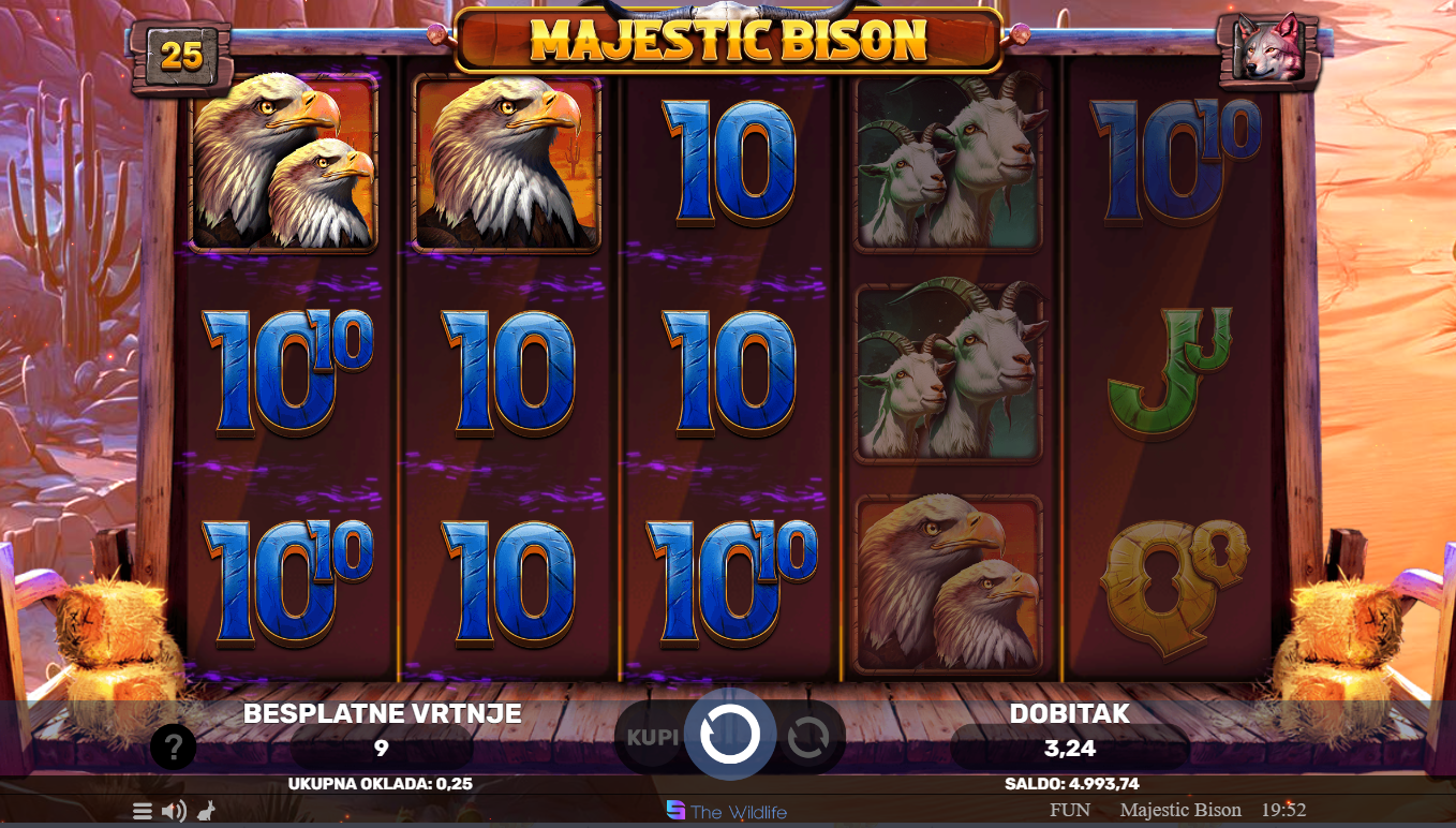 Majestic Bison iSpinomenal vode te u divljinu Sjeverne Amerike, gdje moćni bizon vlada ravnicama, i kolutima. Igra je vizualno impresivna: prirodni pejzaži, prašina, sunčani odsjaji i zvuk vjetra stvaraju pravo iskustvo prerije. Svaki spin donosi mogućnost aktiviranja posebnih značajki koje mogu pretvoriti obične simbole u ogromne nagrade. Bizon nije samo simbol, on je glavna zvijer koja donosi najveće winove.