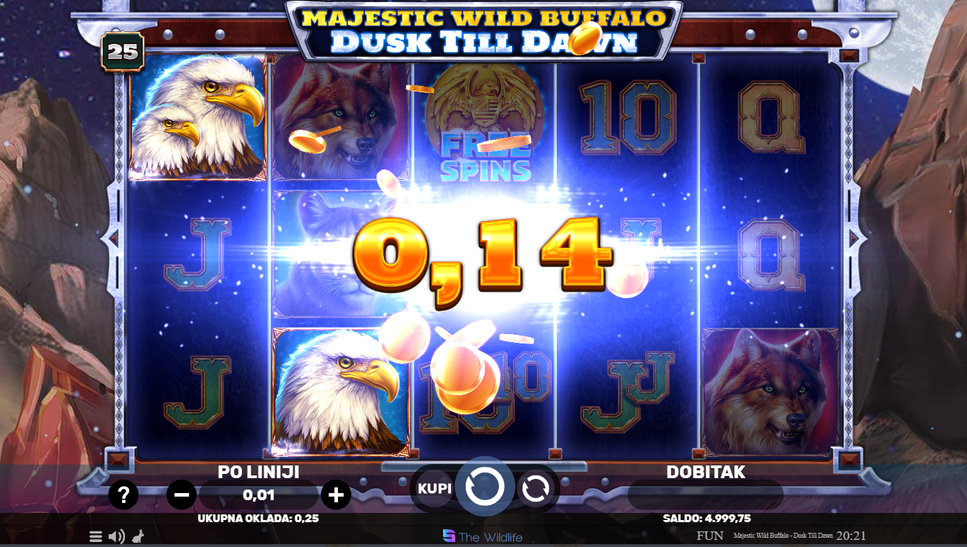 4. Koji su minimalni i maksimalni ulozi u igri Majestic Wild Buffalo - Dusk Till Dawn?