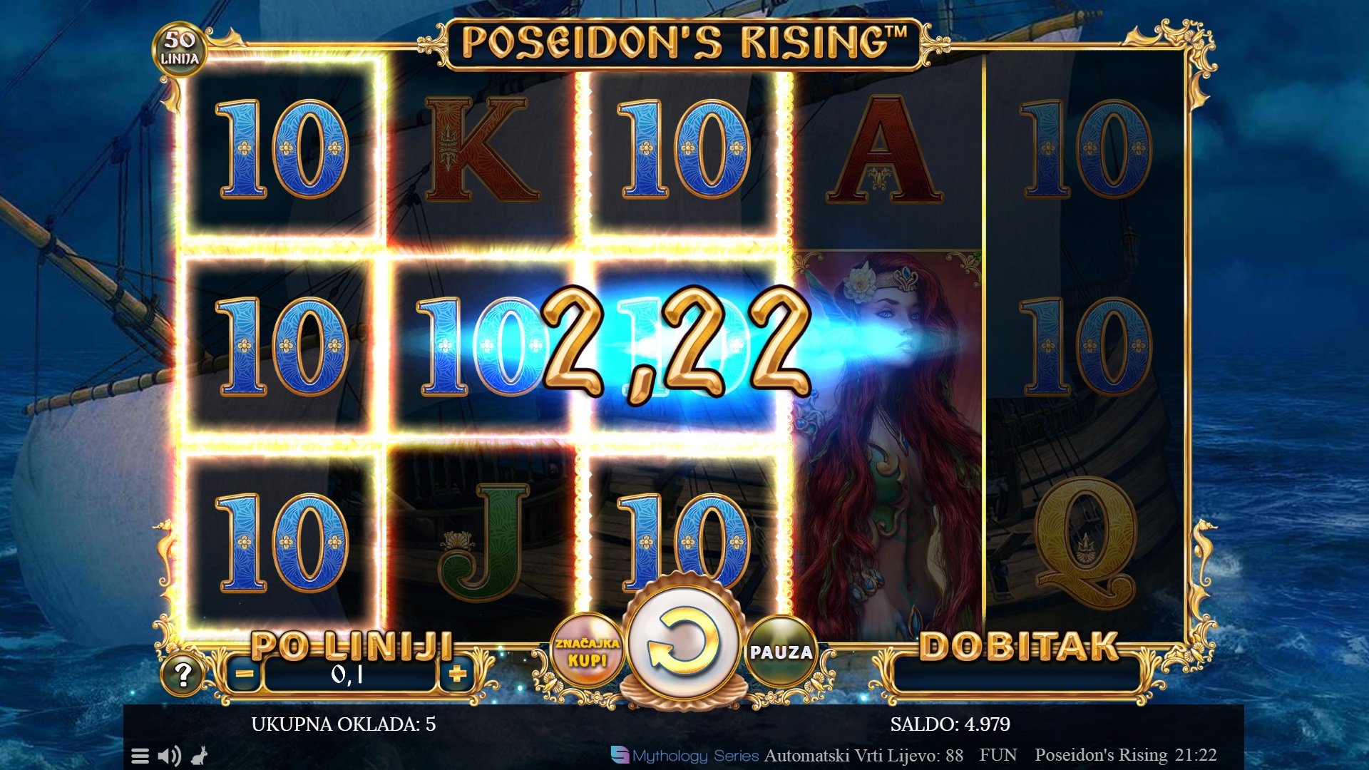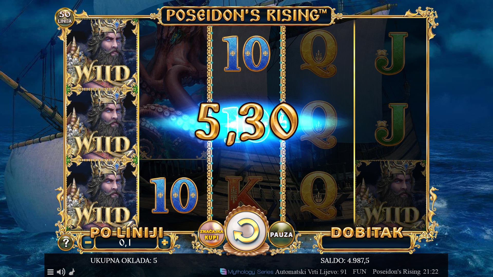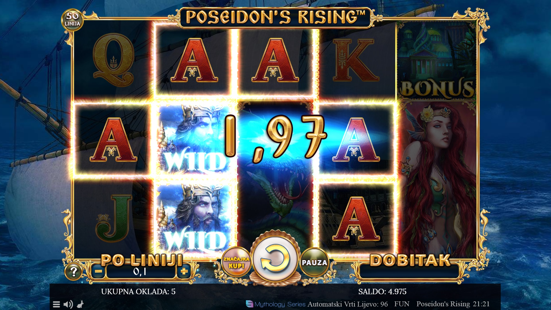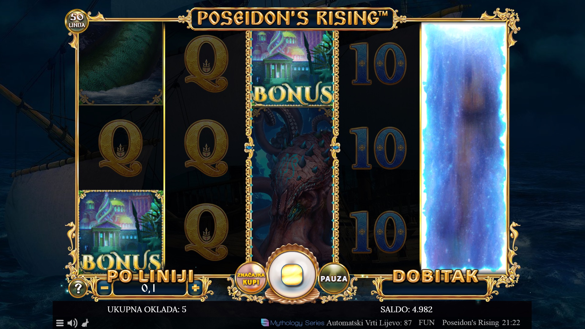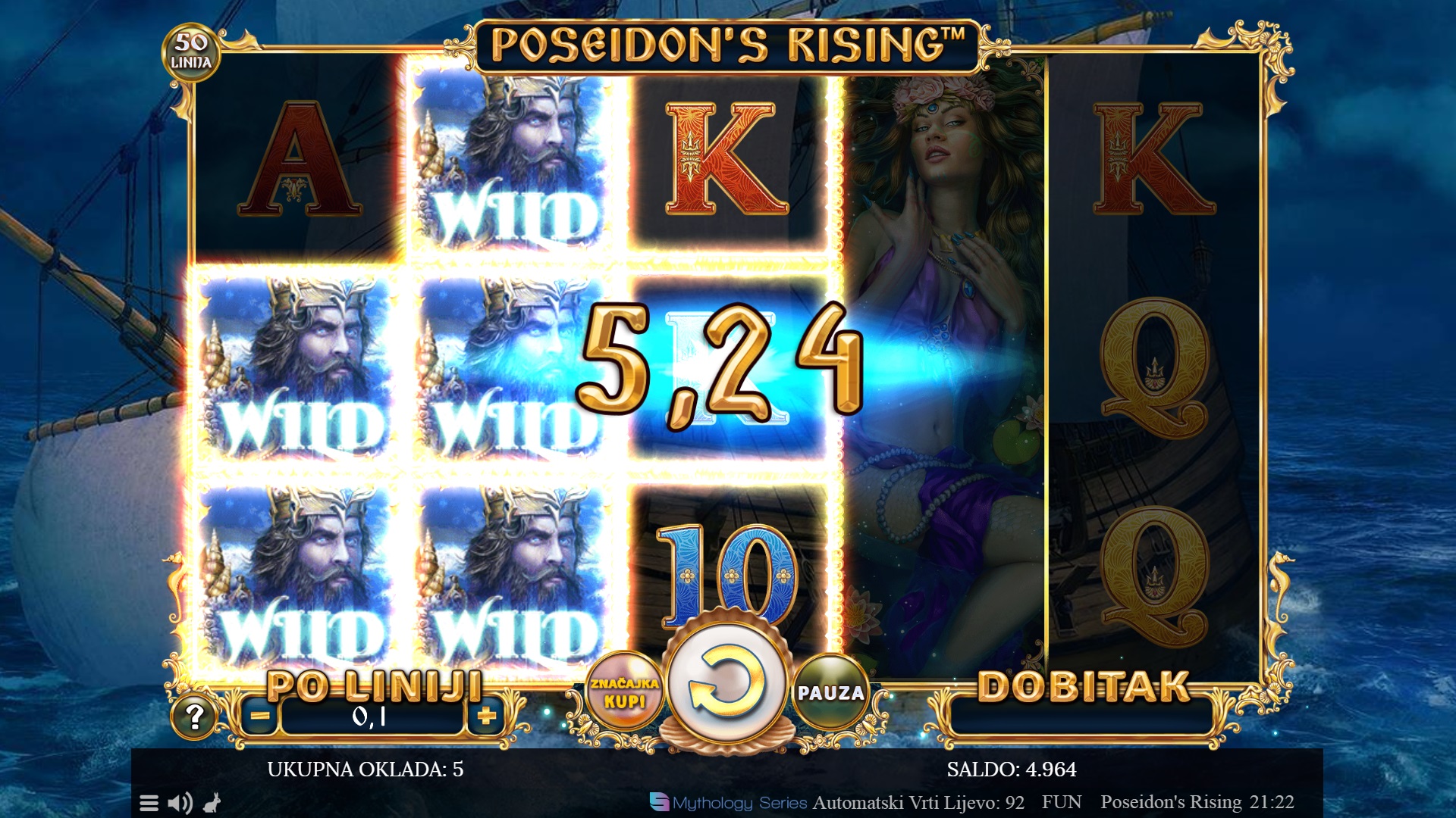 Poseidon's Rising je slot igra koja te vodi u mitološki svijet grčkog boga mora. Ova igra sadrži 50 fiksnih dobitnih linija koje ti nude uzbudljive šanse za osvajanje fantastičnih nagrada. Uz predivnu grafiku i zanimljive značajke poput wild simbola, bonusa i besplatnih vrtnji, Poseidon's Rising nudi dinamično iskustvo igranja. Svaka dobitna kombinacija dodaje se ukupnom dobitku, a stacked wild simboli i različiti modusi besplatnih vrtnji donose dodatnu napetost i priliku za velike dobitke.