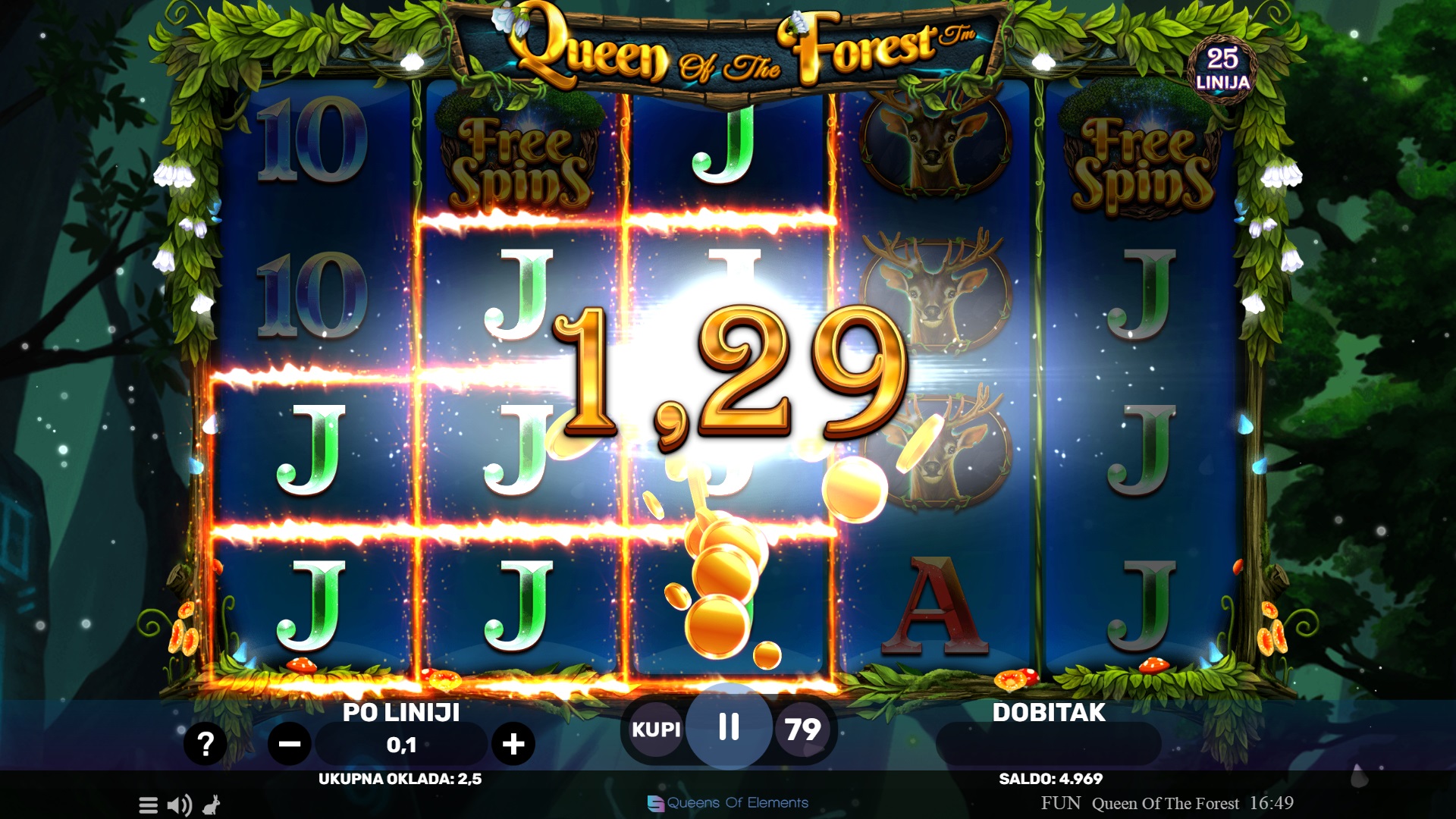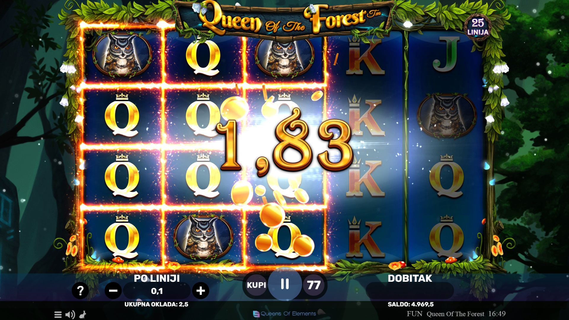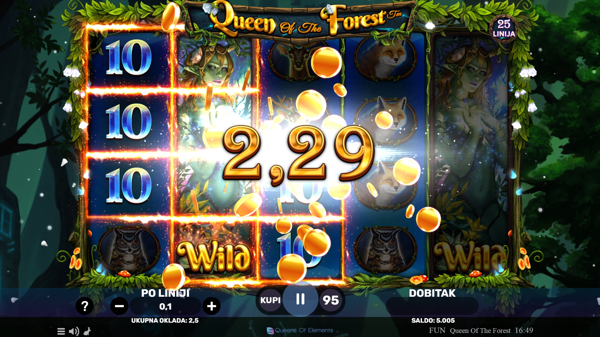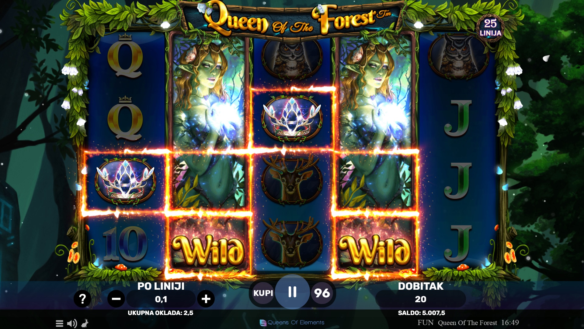 Igra Queen of the Forest nudi dinamičan i uzbudljiv gameplay s puno mogućnosti za velike dobitke. Ima 25 fiksnih isplatnih linija, a tijekom svake vrtnje dva nasumična bubnja mogu se sinkronizirati, povećavajući tvoje šanse za dobitak. Kad Wild simbol padne na sinkronizirane bubnjeve, proširit će se na cijeli bubanj, donoseći još veće dobitke. Bonus igra se aktivira kad prikupiš 3 ili više bonus simbola, dajući ti 3 vrtnje da sakupiš dobitne simbole i napuniš metar za još veće nagrade. Ako tijekom igre dobiješ 3 ili više simbola besplatnih vrtnji, pokreće se značajka besplatnih vrtnji koja ti donosi 10 dodatnih vrtnji. Svaka dodatna značajka, poput naslaganih Wild simbola tijekom besplatnih vrtnji, može ti donijeti još više prilika za velike dobitke!