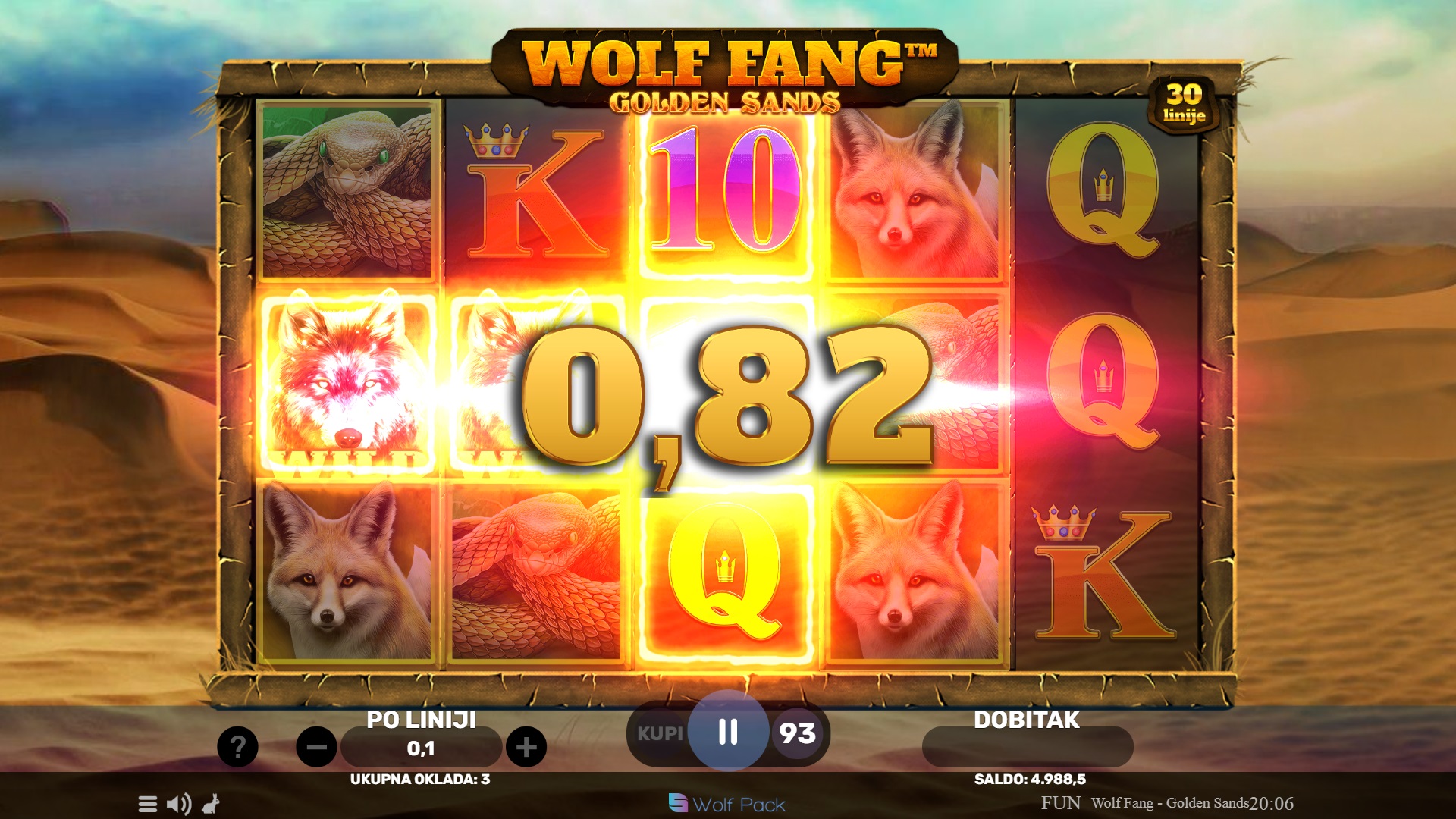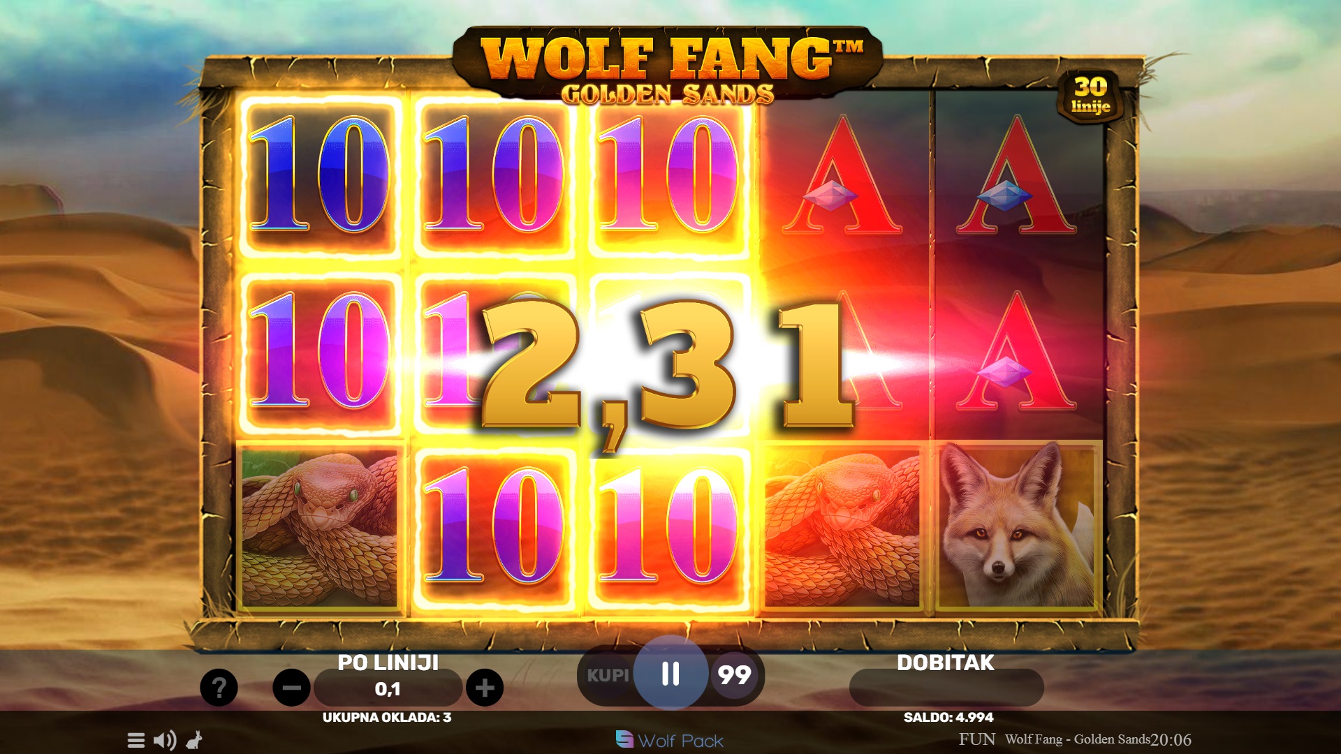 Wolf Fang - Golden Sands ima RTP u rasponu od 95,79% do 95,83%, što znači da igra nudi solidne šanse za povrat na uloženi iznos. Ova igra je srednje volatilnosti, pa ćeš vidjeti dobitke relativno često, ali također možeš očekivati veće nagrade tijekom bonus rundi. Ova ravnoteža između manjih i većih dobitaka čini igru pogodnom za sve tipove igrača.
