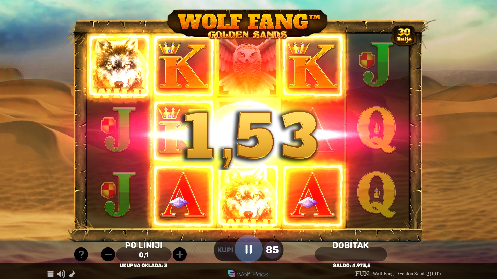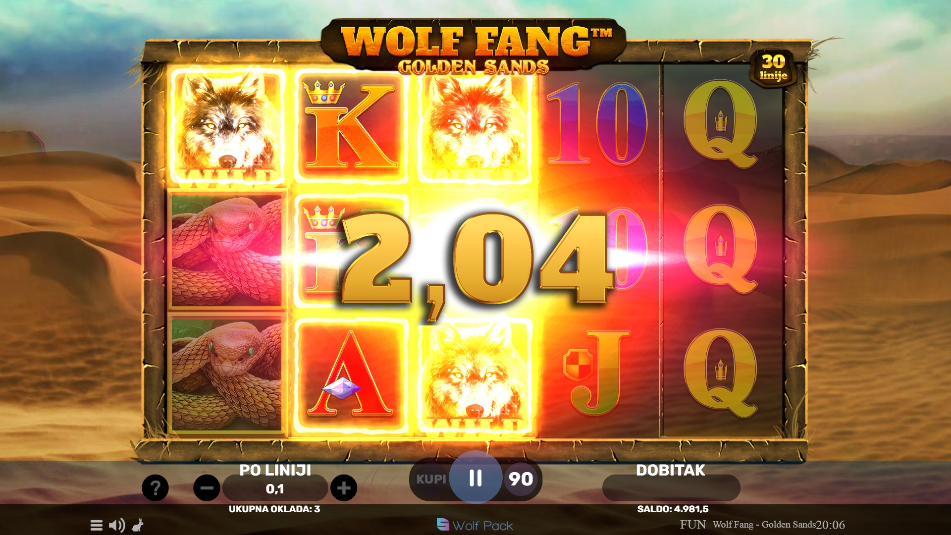 Wolf Fang - Golden Sands vodi te na uzbudljivo putovanje kroz pustinjske dine s 30 fiksnih isplatnih linija. Ova igra donosi moćne Wild simbole i mogućnost osvajanja do 1000 puta većeg dobitka po liniji! Uz to, možeš birati između dvije različite vrste besplatnih vrtnji koje će ti donijeti još veće šanse za pobjedu. Srednji simboli se grupiraju kako bi ti pružili bolje kombinacije, dok besplatne vrtnje mogu ponovo pokrenuti dodatne vrtnje, čime se povećavaju tvoje šanse za velike dobitke!