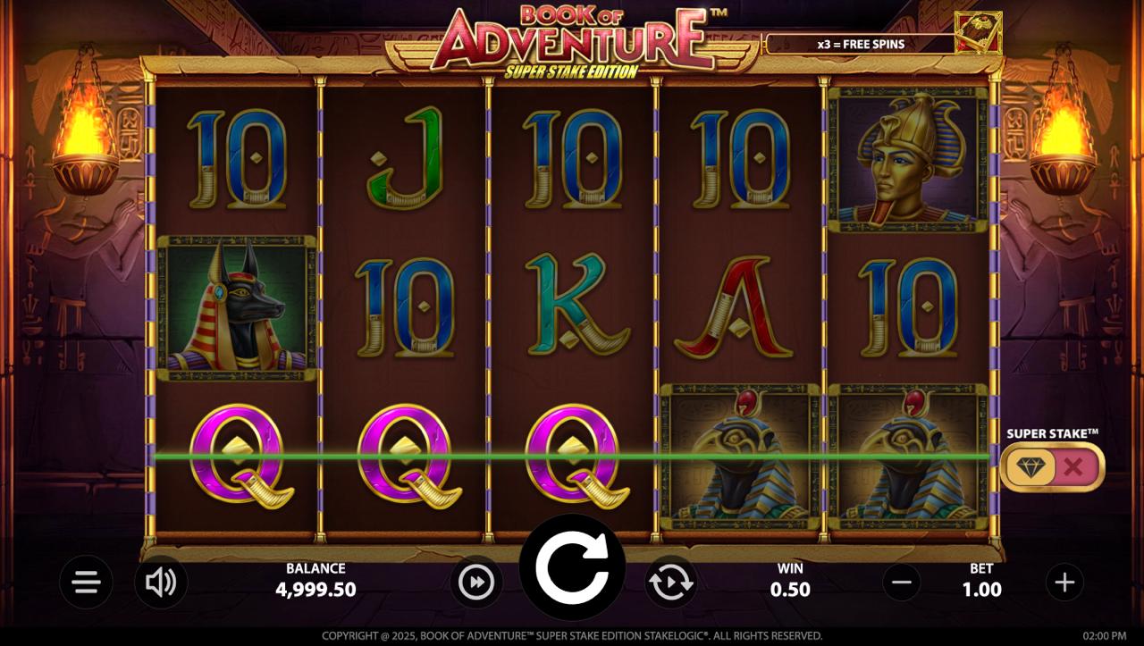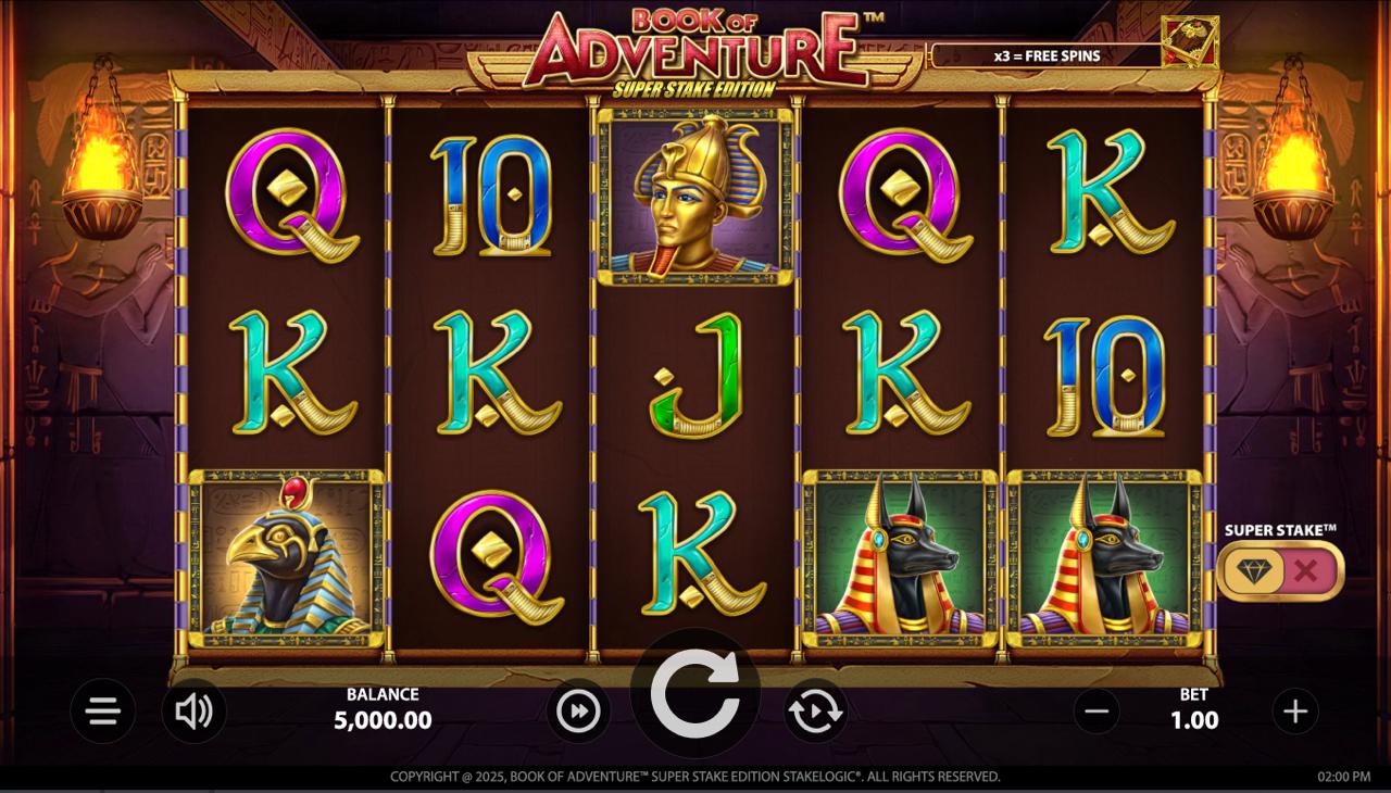 BOOK OF ADVENTURE SUPERSTAKE EDITION se igra na standardnim rolačama sa simbolima knjige, drevnih artefakata i istraživača. Igrači mogu uključiti opciju Superstake prije spina — to povećava iznos uloga, ali i šanse za pokretanje bonus igre sa značajnim multiplikatorima. Kad skupiš dovoljno Scatter simbola (knjiga), aktivira se bonus runda s besplatnim vrtnjama u kojoj se nasumično bira simbol za proširenje. Minimalni ulog je 0,10 €, a maksimalni 100,00 €, što omogućuje prilagogue stila igranja. Igra nema besplatnih „kupnji vrtnji“ ni jackpot — glavni izvor velikih dobitaka je bonus runda pokrenuta Superstake opcijom.