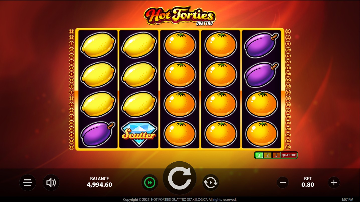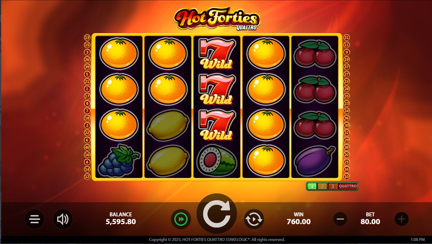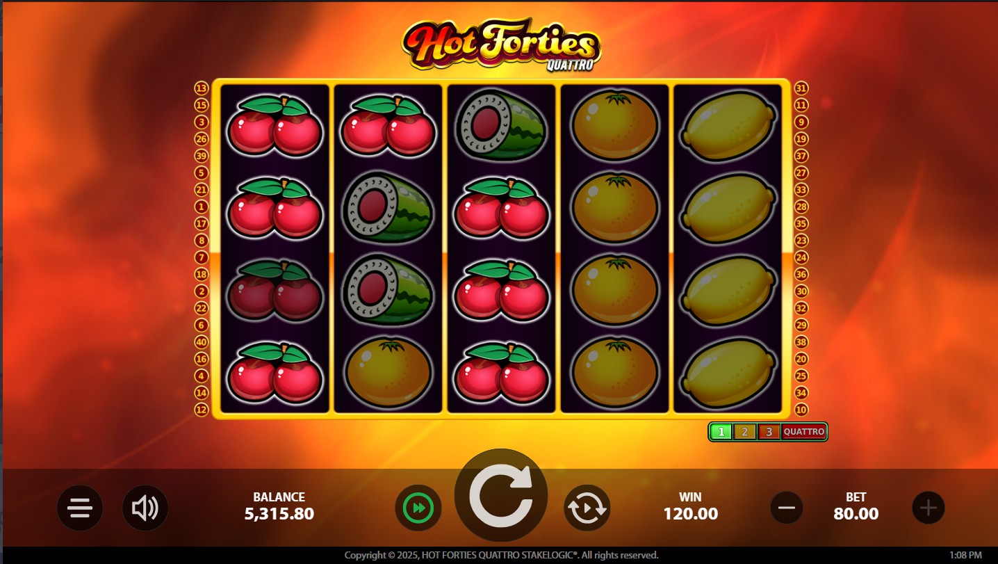 Hot Forties Quattro se igra na 5 bubnjeva s 40 isplatnih linija. Dobitne kombinacije broje se s lijeva na desno, a Wild simbol zamjenjuje sve ostale simbole osim Scatter simbola. Pojava tri ili više Scatter simbola donosi dodatne prilike za osvajanje dobitaka. Tijekom osnovne igre nasumično se mogu aktivirati posebne funkcije poput dodatnih Wild simbola. Odaberi svoj ulog, pritisni Spin i uživaj u retro i uzbudljivoj slot avanturi Hot Forties Quattro!