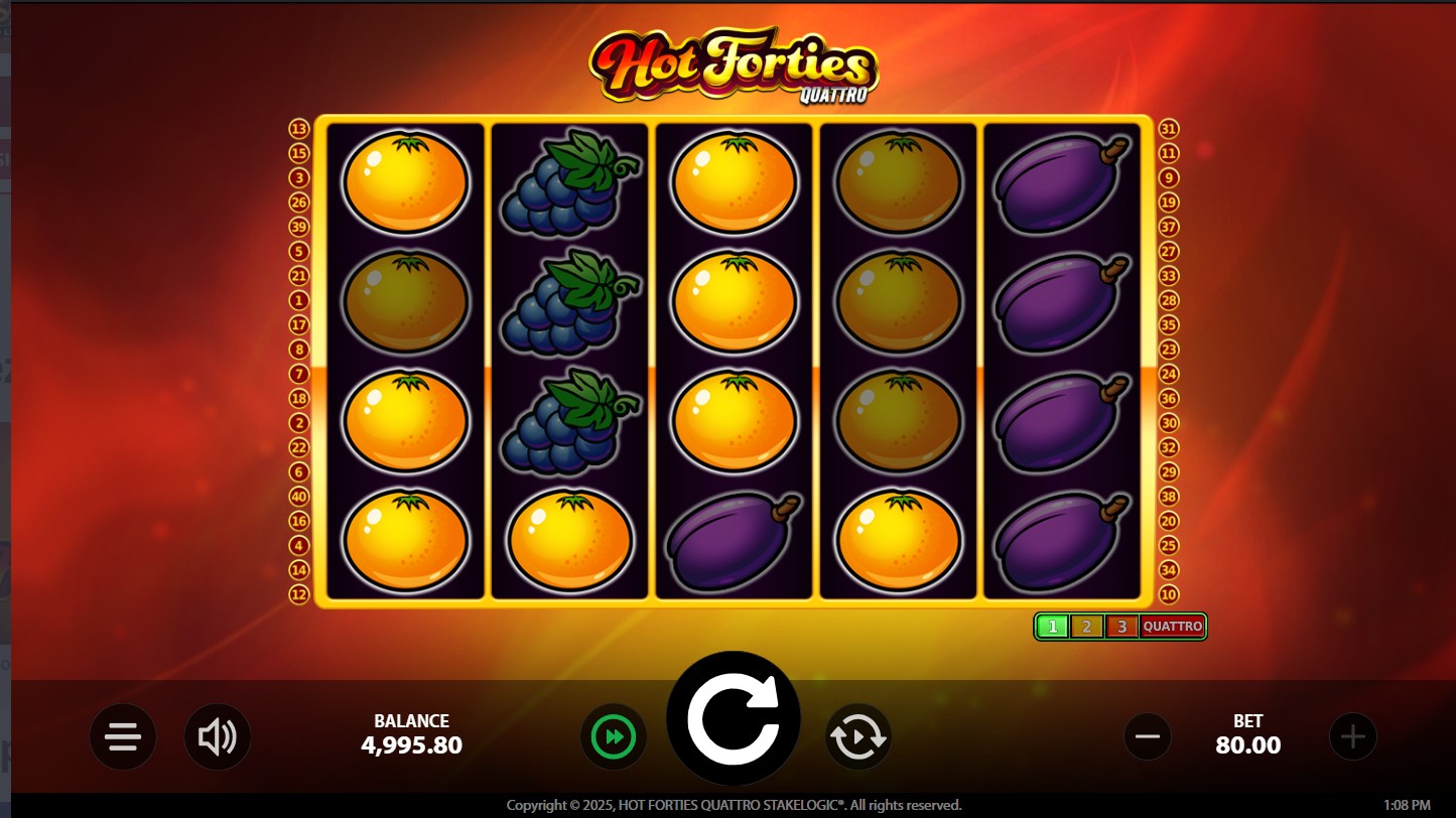 Zakorači u retro svijet voćnih slotova uz Hot Forties Quattro, igru renomiranog providera Stake Logic! Ova dinamična slot igra donosi nostalgičnu zabavu, jednostavnu igru i priliku za uzbudljive dobitke kroz svaku rundu. Igra se odvija na 5 bubnjeva i 4 reda s 40 isplatnih linija, a svaki spin nudi šansu za dodatne nagrade i posebne funkcije koje čine igru zanimljivom i napetom. Ako voliš klasične voćne slotove s retro šarmom i modernim značajkama, Hot Forties Quattro je pravi izbor za tebe!