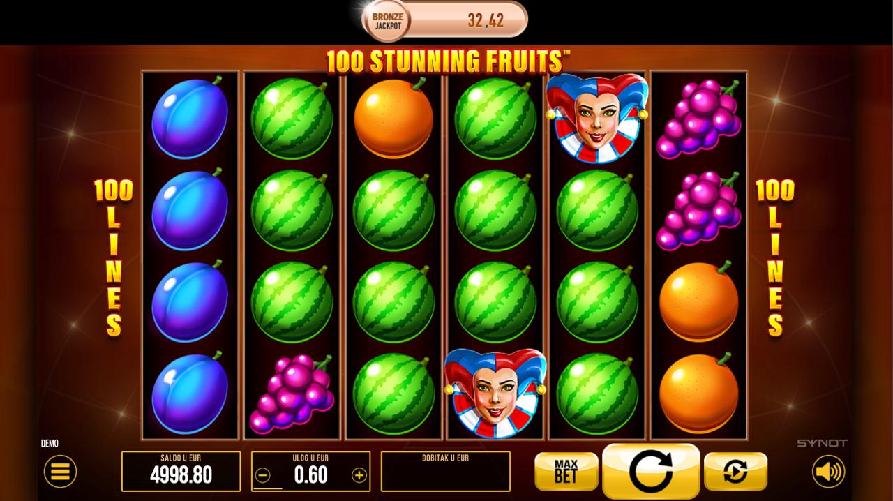 100 Stunning Fruits igra se na 5 rola, a cilj je složiti iste simbole na aktivnim linijama, počevši s lijeve strane, kako bi ostvario dobitak. Simboli voća poput trešanja, limuna, lubenica i drugih sočnih plodova donose različite razine nagrada, dok posebni simboli mogu potaknuti dodatne prilike za veće isplate. Postavi željeni ulog, zavrti role i uživaj u uzbudljivim kombinacijama koje mogu donijeti jackpot!