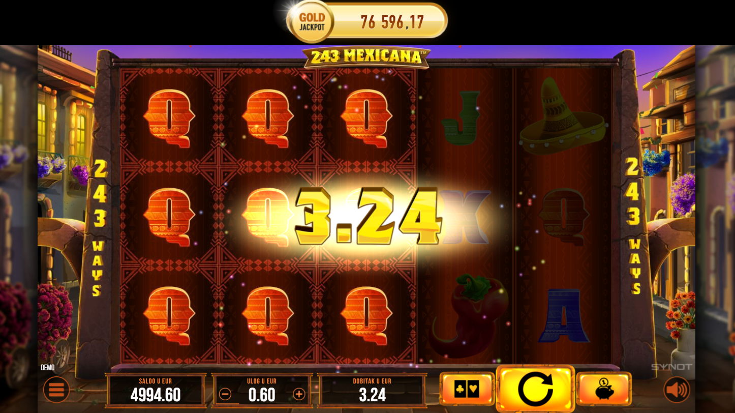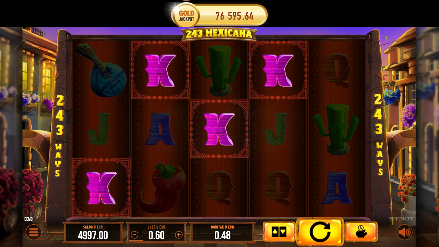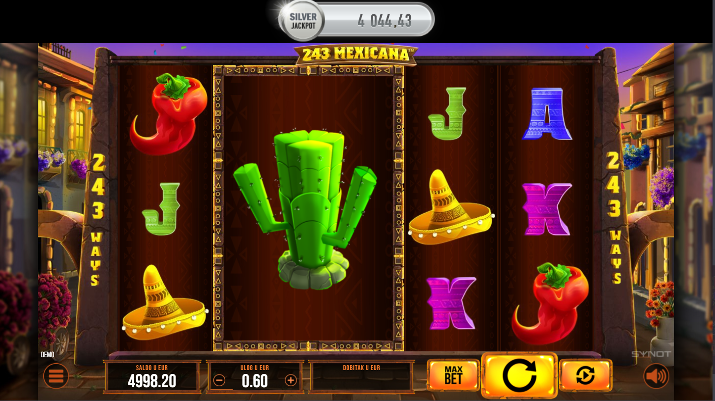 Dobrodošao u 243 Mexicana, slot od Synot-a, koji će te odvesti ravno u srce meksičke proslave! Očekuju te živahni simboli sombrera, gitara i čilija, dok mariachi glazba podiže atmosferu. Sa 5 kolutova i čak 243 načina za dobitak, svaka vrtnja donosi novu priliku. Uz Big Symbol značajku, cijeli ekran može eksplodirati u ogromne dobitke. Spremi se za slot pun boja, ritma i adrenalina!
