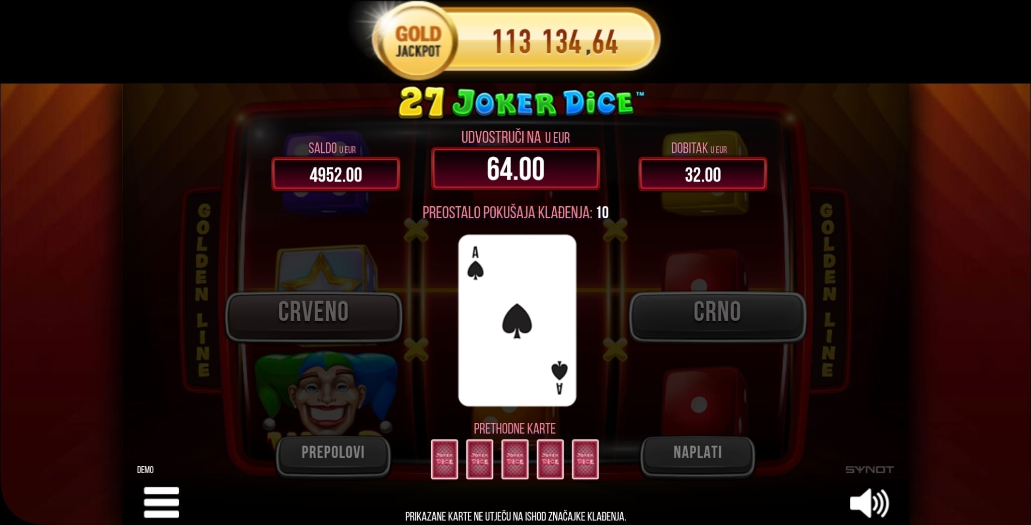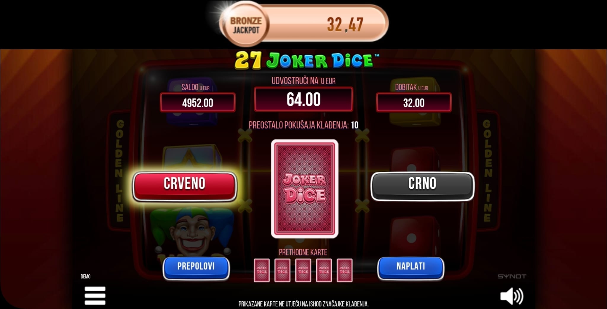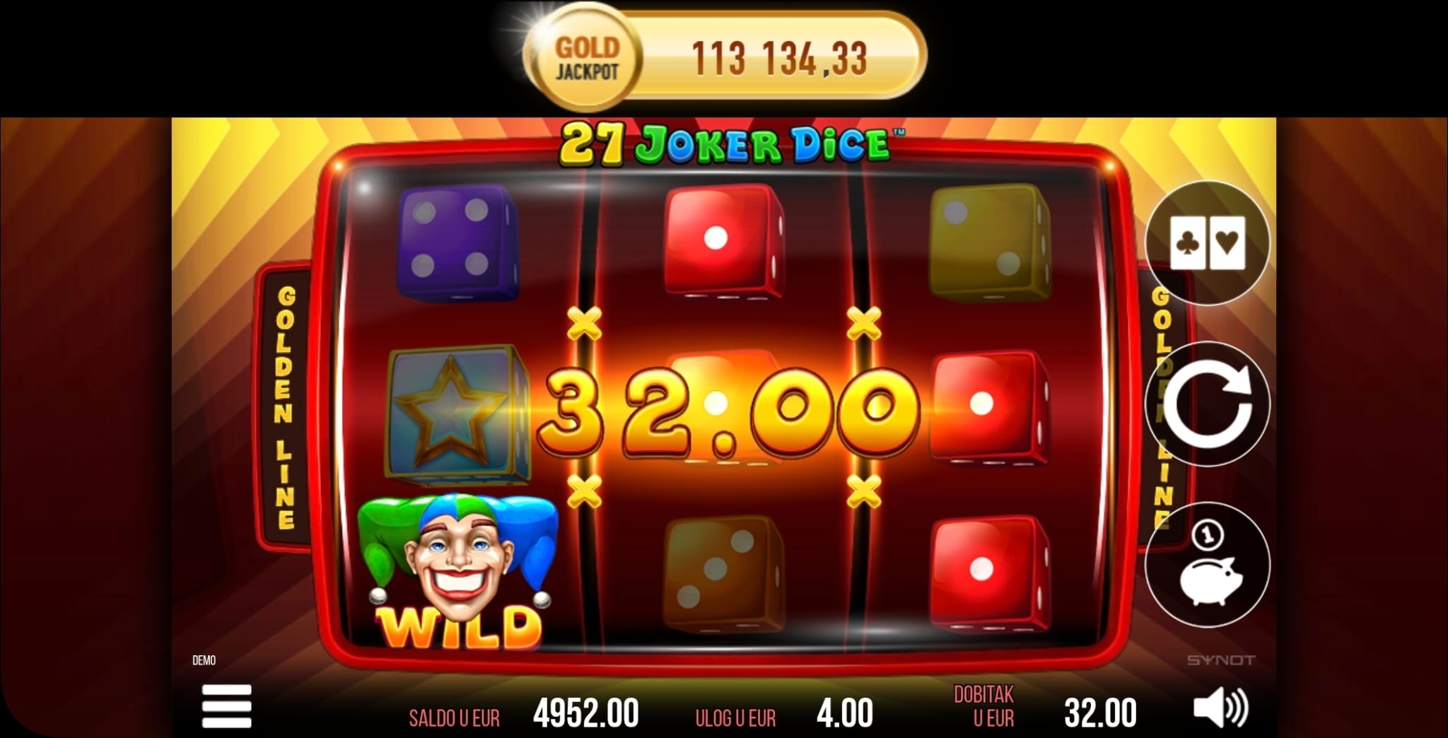 Igra 27 Joker Dice ima teoretski RTP od 95.01%. S obzirom na značajke poput množitelja i besplatnih vrtnji, kao i na jackpot potencijal, volatilnost je srednja do visoka.