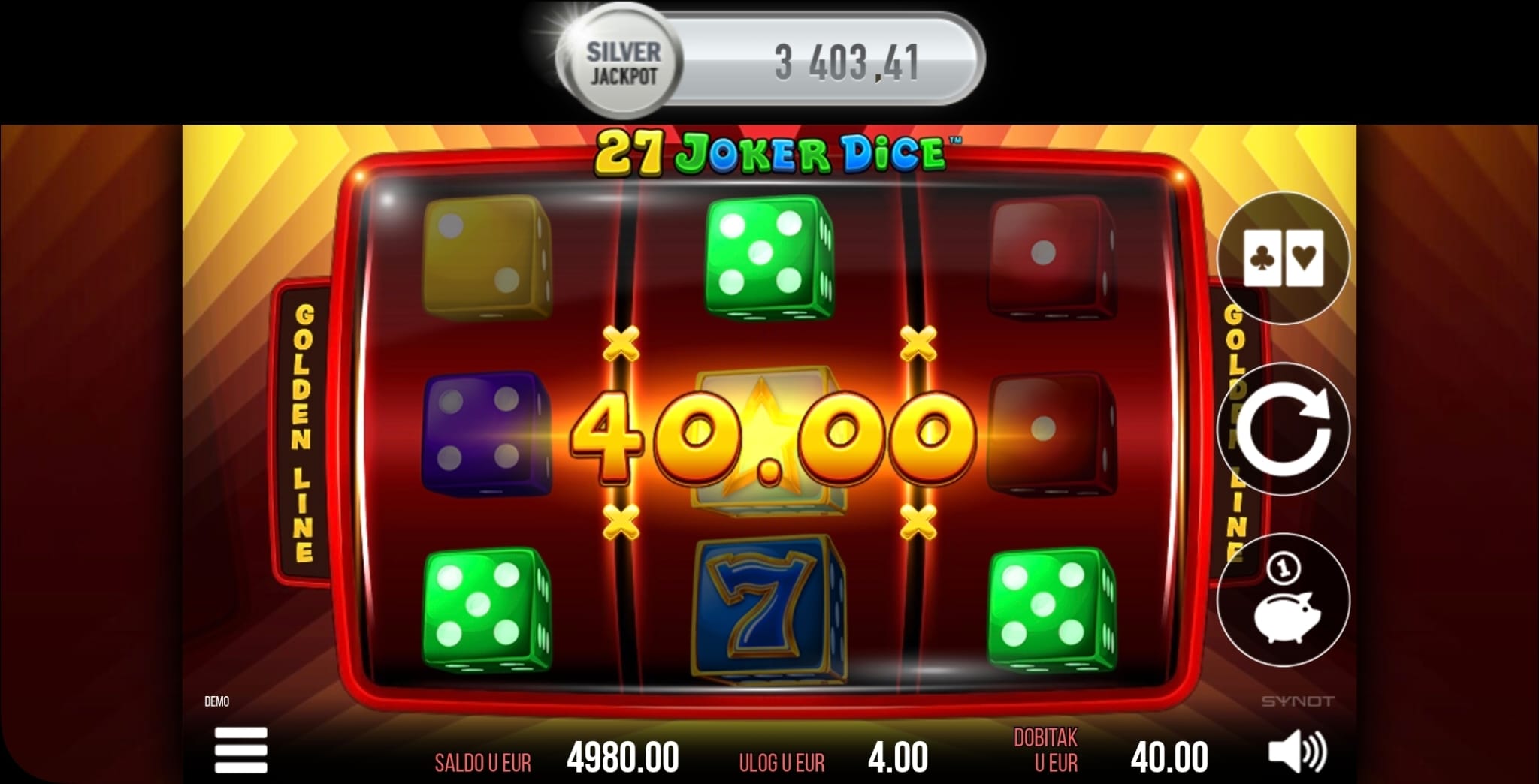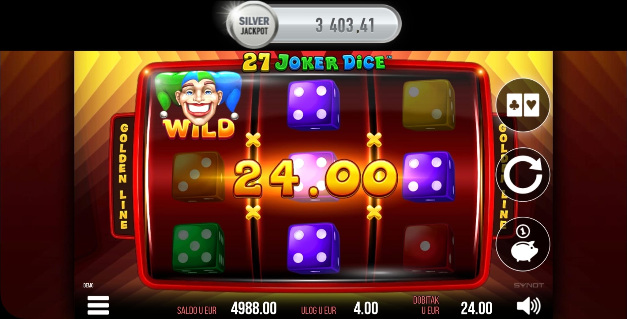 U igri 27 Joker Dice dobitak ostvarujete kada se 3 ista simbola pojave na isplatnim linijama. Joker Wild simbol zamjenjuje sve ostale simbole na valjcima, pomažući vam u ostvarivanju kombinacija.