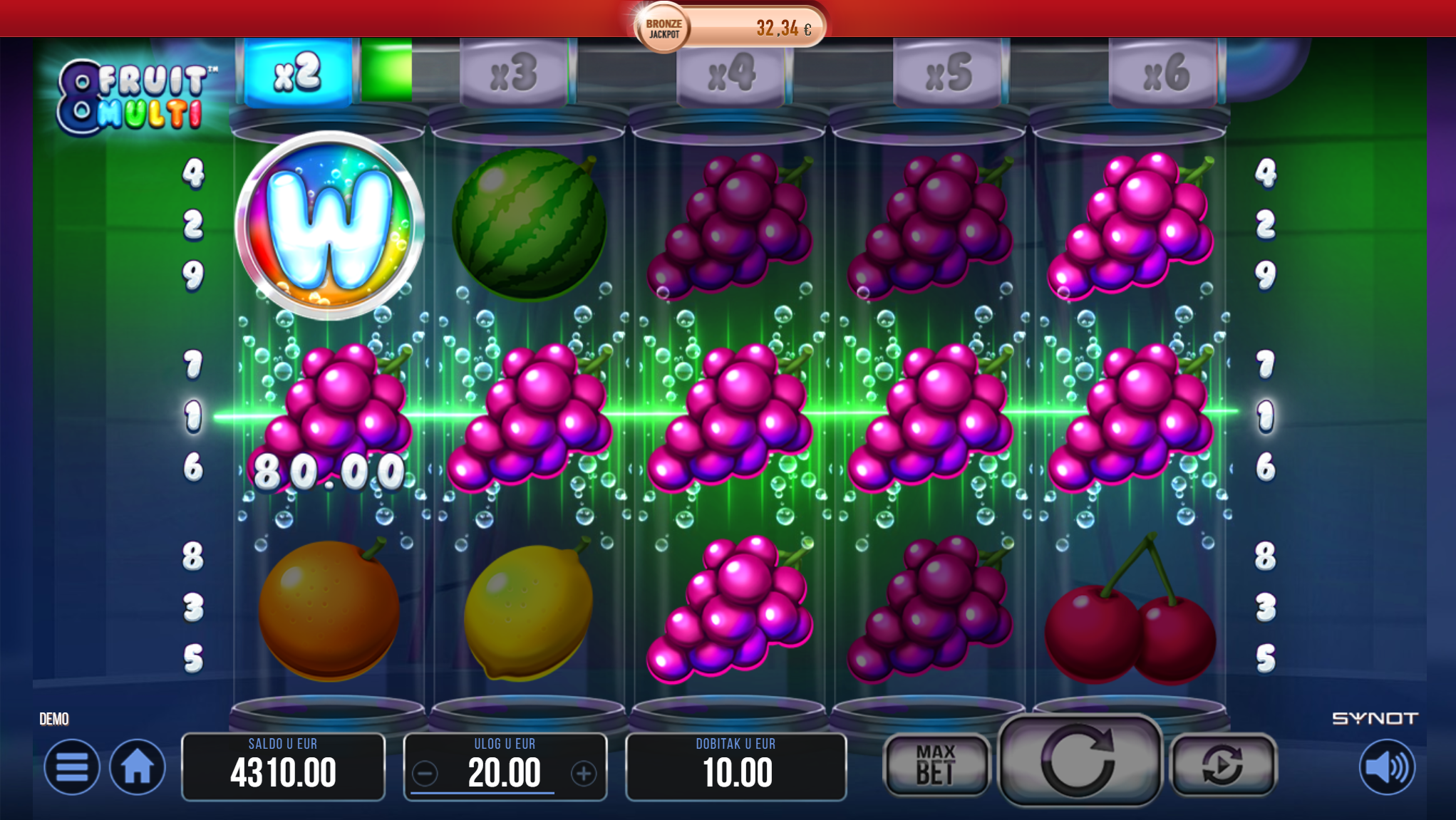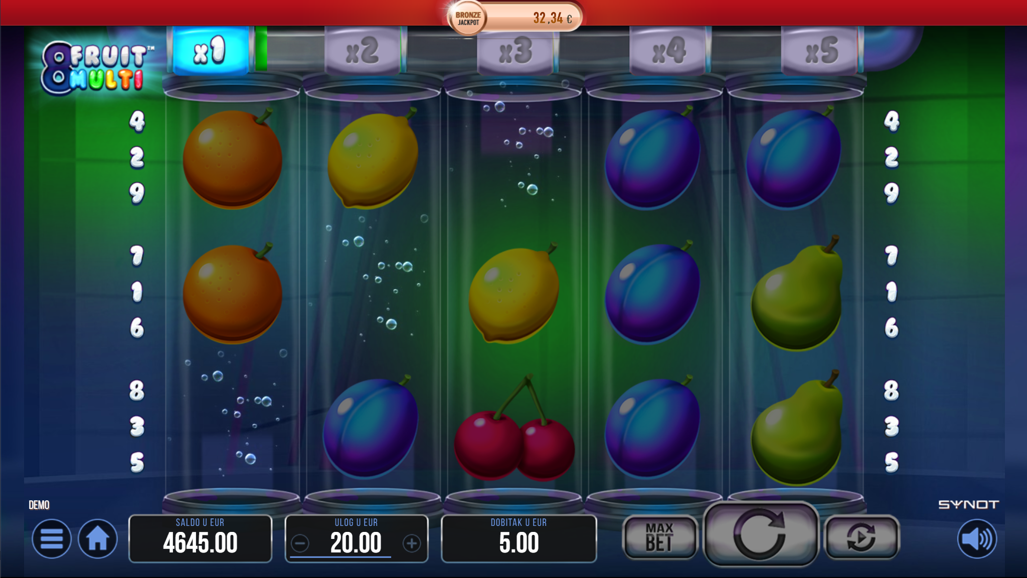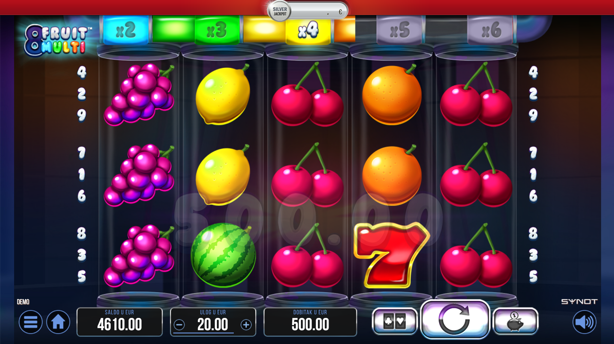 8 Fruit Multi vodi svoje igrače kroz zabavnu avanturu obogaćenu pažljivo ilustriranim voćnim simbolima uz dodatak zlatnih efekata. Super jednostavan način igranja omogučiti će igračima dugotrajnu zabavu, a kako bi ona također bila i uzbudljiva pobrinuti će se 8 Fruit Multi wild simboli koji će tvoje dobitke pretvoriti u veće i učestalije. Ako voliš igre koje ti pružaju izvrstan omjer rizika i dobitaka došao si na pravo mjesto! Prepusti se zabavi i užitku te sa sobom odnesi velike dobitke!