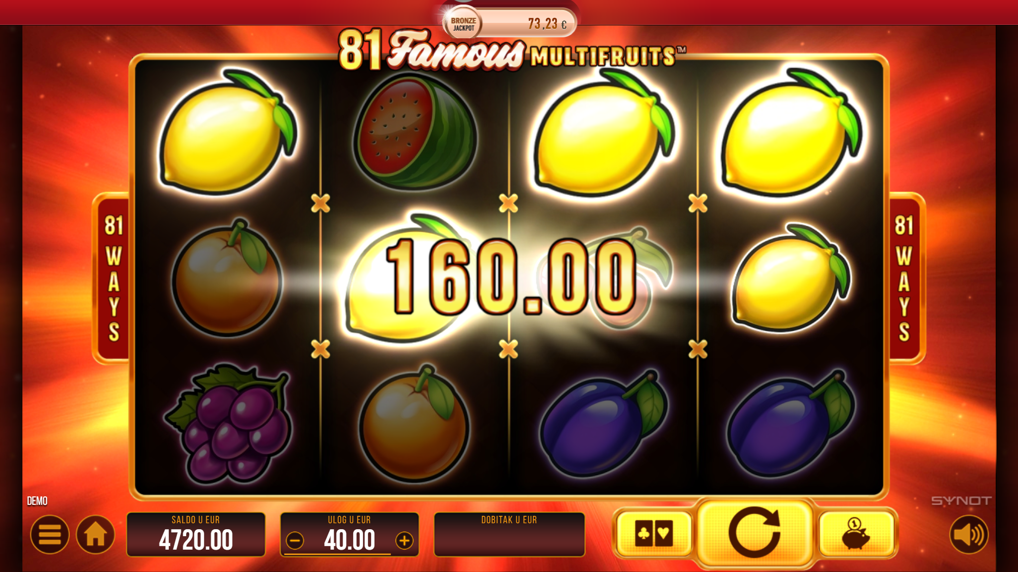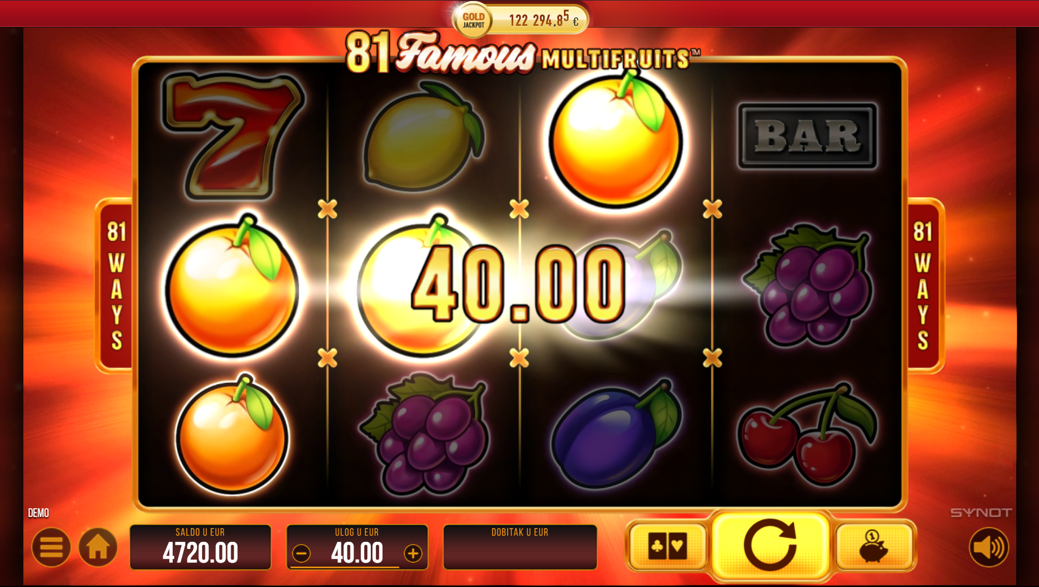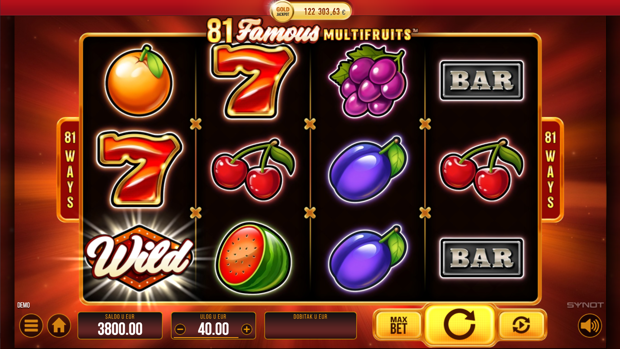 81 Famous Multifruits vodi svoje igrače kroz zabavnu avanturu obogaćenu pažljivo ilustriranim voćnim simbolima uz dodatak zlatnih efekata. Super jednostavan način igranja omogučiti će igračima dugotrajnu zabavu, a kako bi ona također bila i uzbudljiva pobrinuti će se 81 Famous Multifruits wild simboli koji će tvoje dobitke pretvoriti u veće i učestalije. Ako voliš igre koje ti pružaju izvrstan omjer rizika i dobitaka došao si na pravo mjesto! Prepusti se zabavi i užitku te sa sobom odnesi velike dobitke!