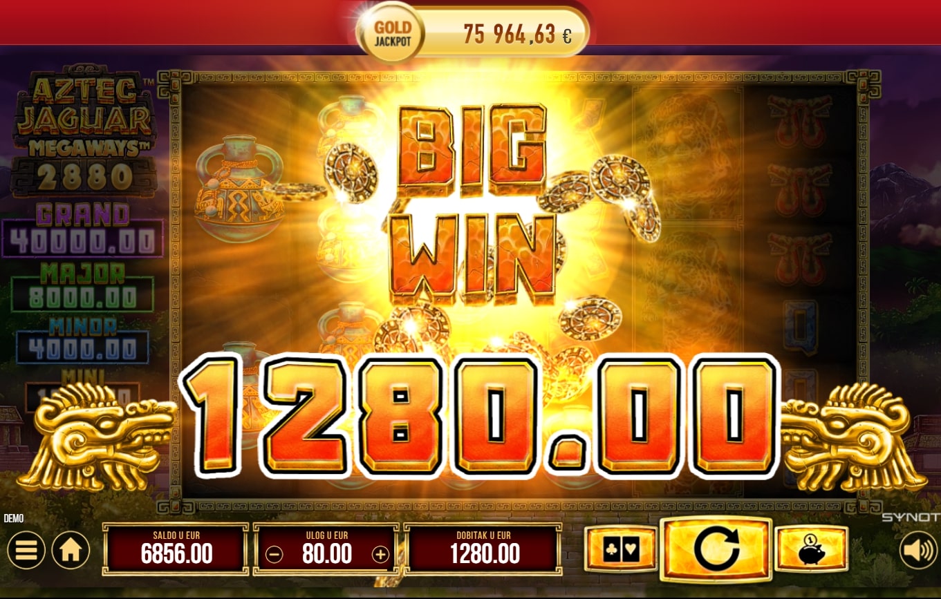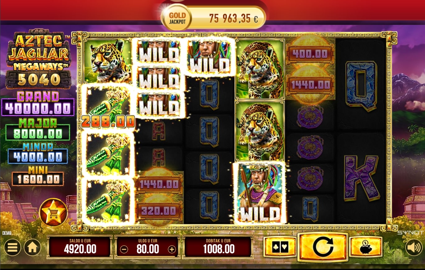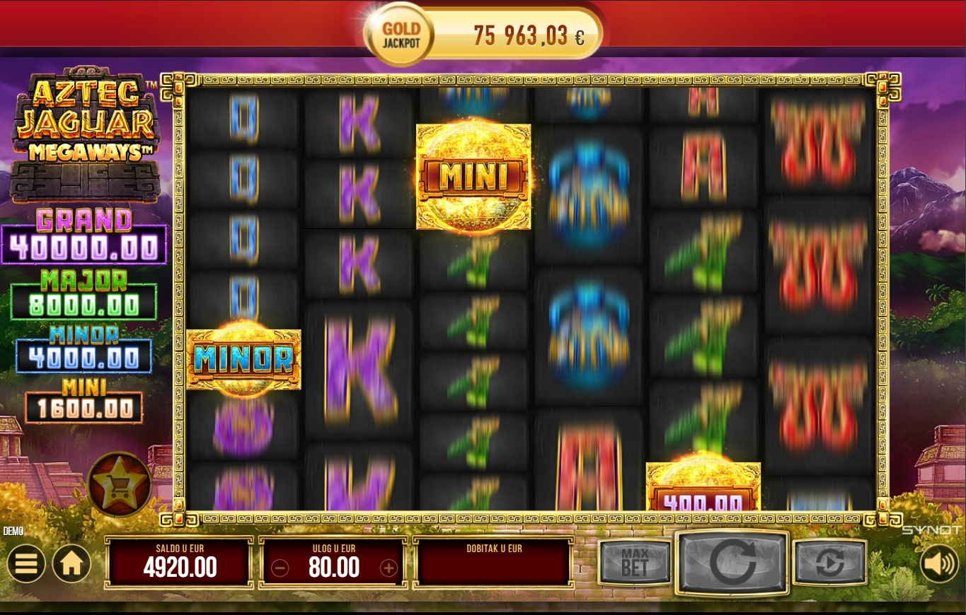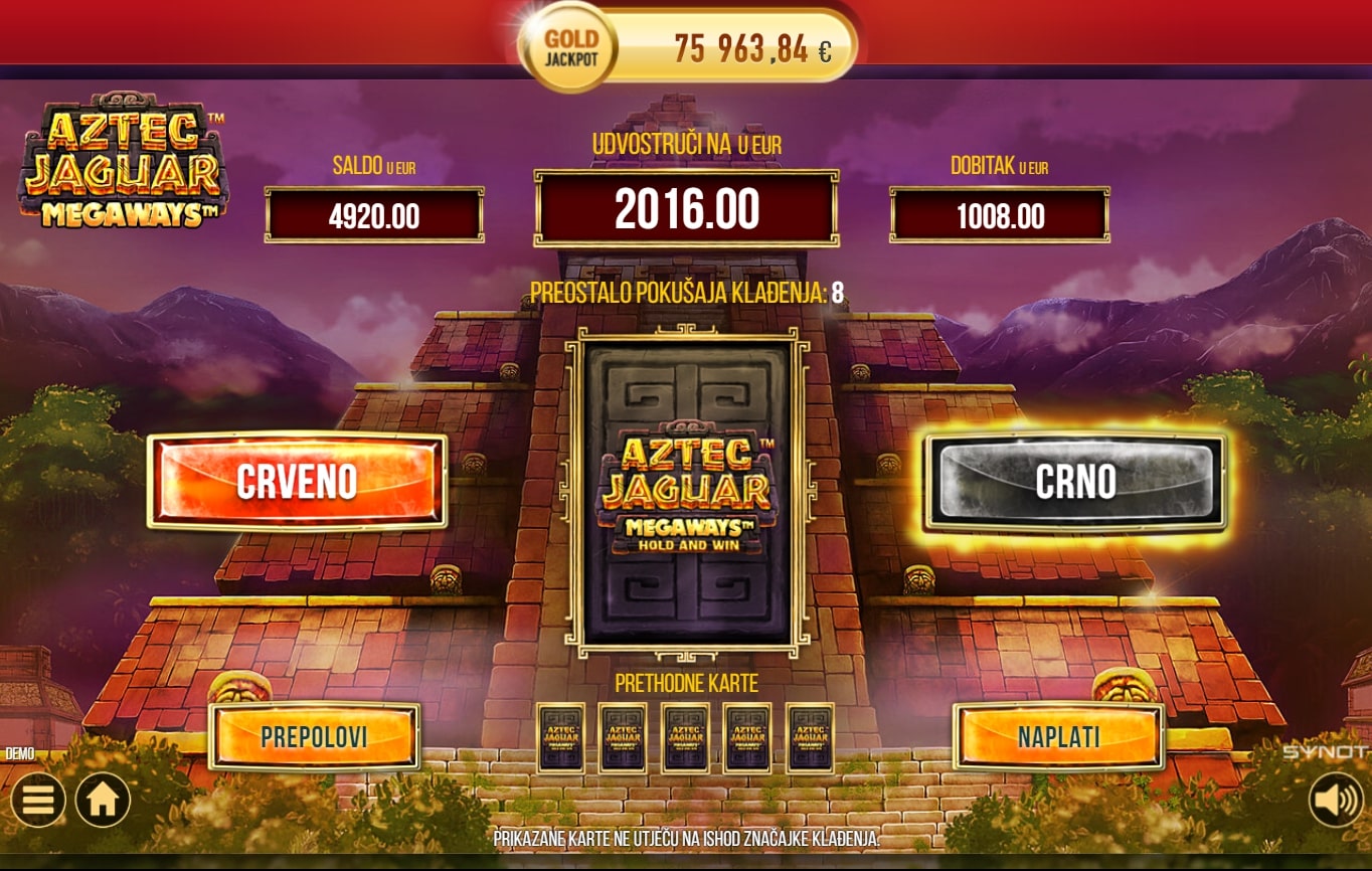 Aztec Jaguar Megaways slot je igra istraživačkog karaktera koja vodi igrača u svijet kiše i tajni koje skrivaju srednjoameričke prašume. Simboli su inspirirani florom i faunom, dok najviše isplaćuju oni jaguara, zmije te medaljona i vaze s aztečkim obilježjima. Simbol domorodca može zamijeniti druge simbole, dok vatrena kugla može pokrenuti Hold & Win značajku. U slučaju dobitka, igrač ga može udvostručiti pogađanjem boje karte okrenute licem prema dolje. Zaigraj Aztec Jaguar Megaways za osvježavajuće dobitke!