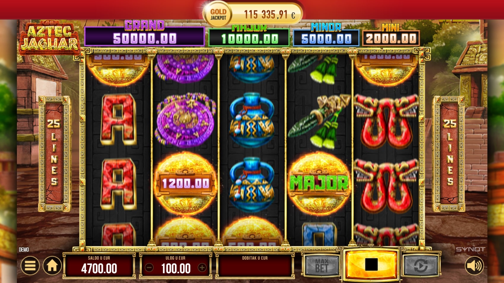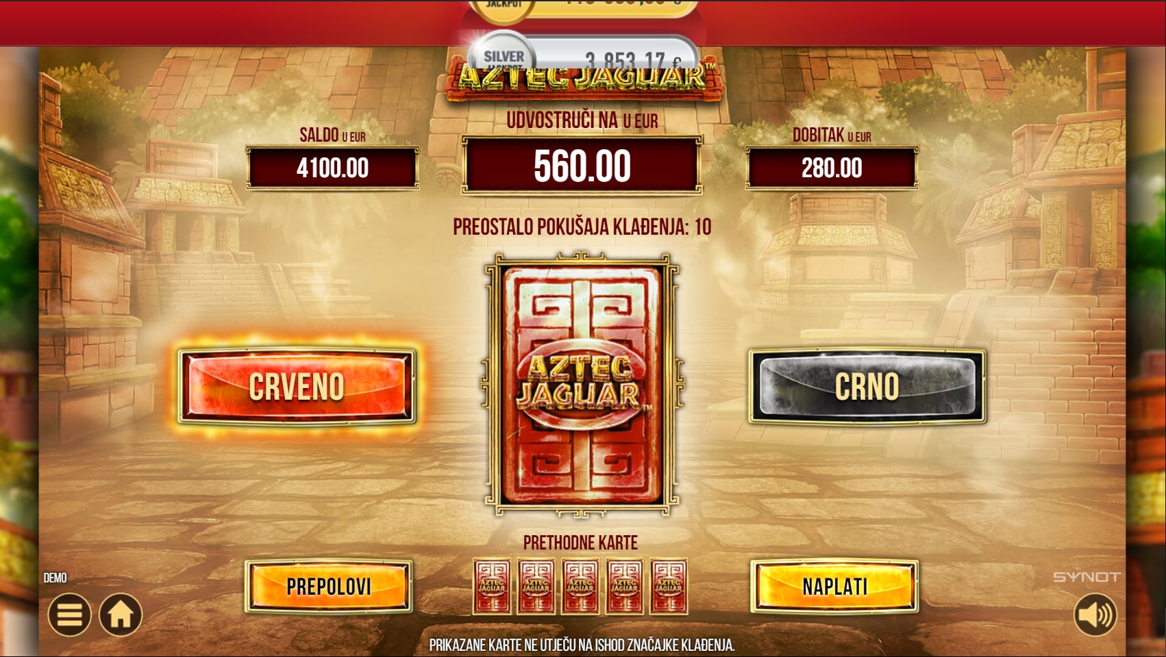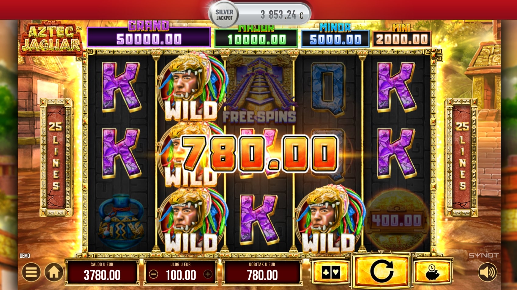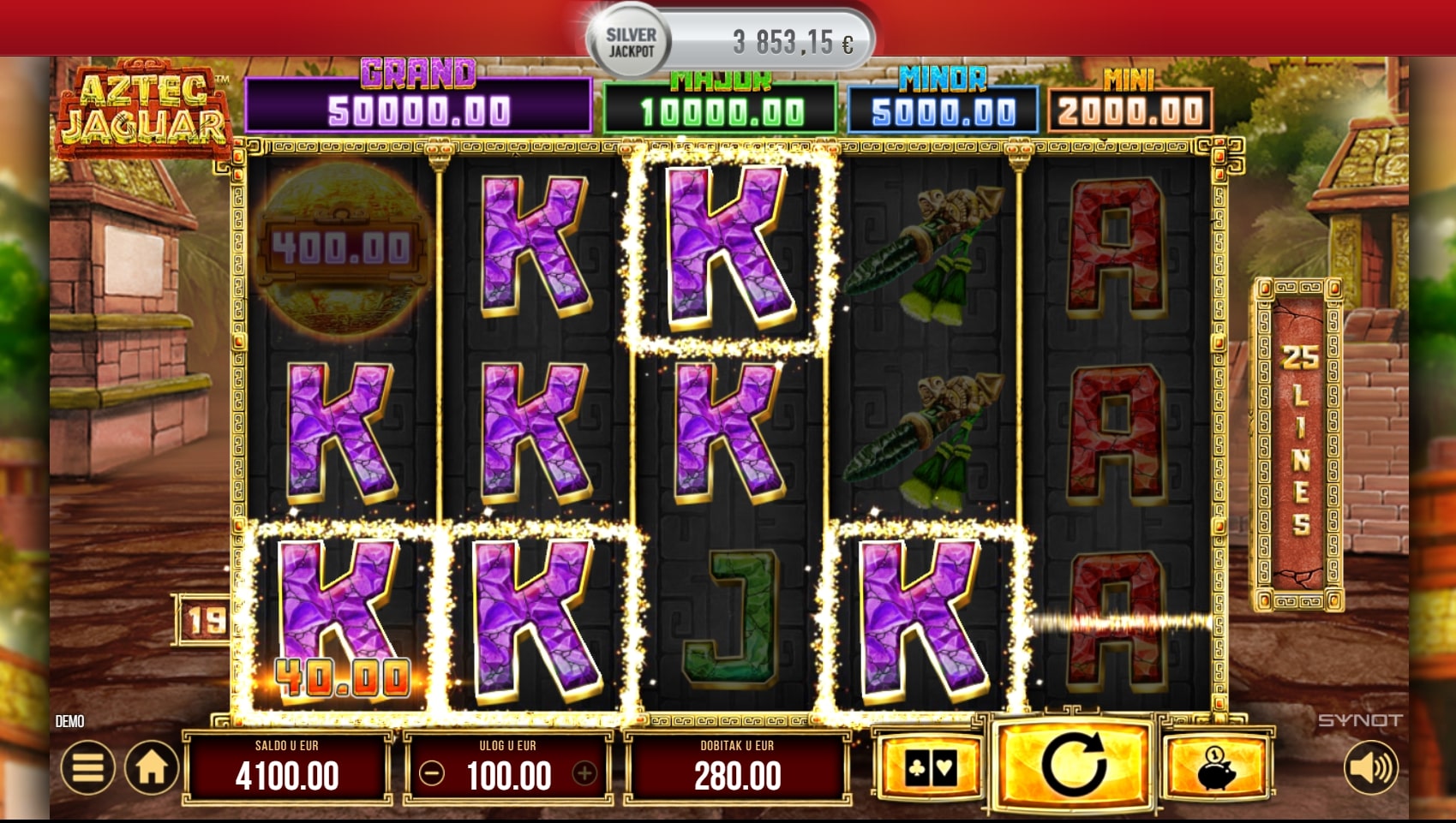 Aztec Jaguar slot je igra istraživačke tematike koja vodi igrača u avanturu srednjoameričkim prašumama u potrazi za najboljim dobicima. Igra je insprirana civilizacijom Azteka, a najviše isplaćuju simboli leoparda, zmija i raznih aztečkih obilježja. Simbol domorodca može pomoći u stvaranju dobitaka zamjenom simbola, dok hram pokreće besplatne vrtnje. U slučaju dobitka, igrač ga može 'poduplati' pogađanjem boje karte okrenute licem prema dolje. Zaigraj Aztec Jaguar te osvoji fenomenalne nagrade!